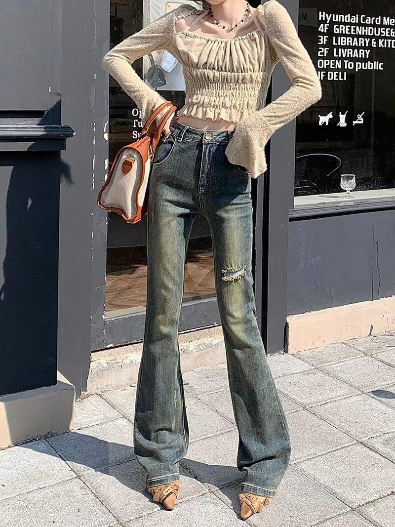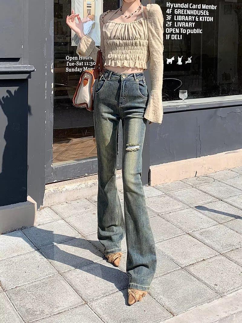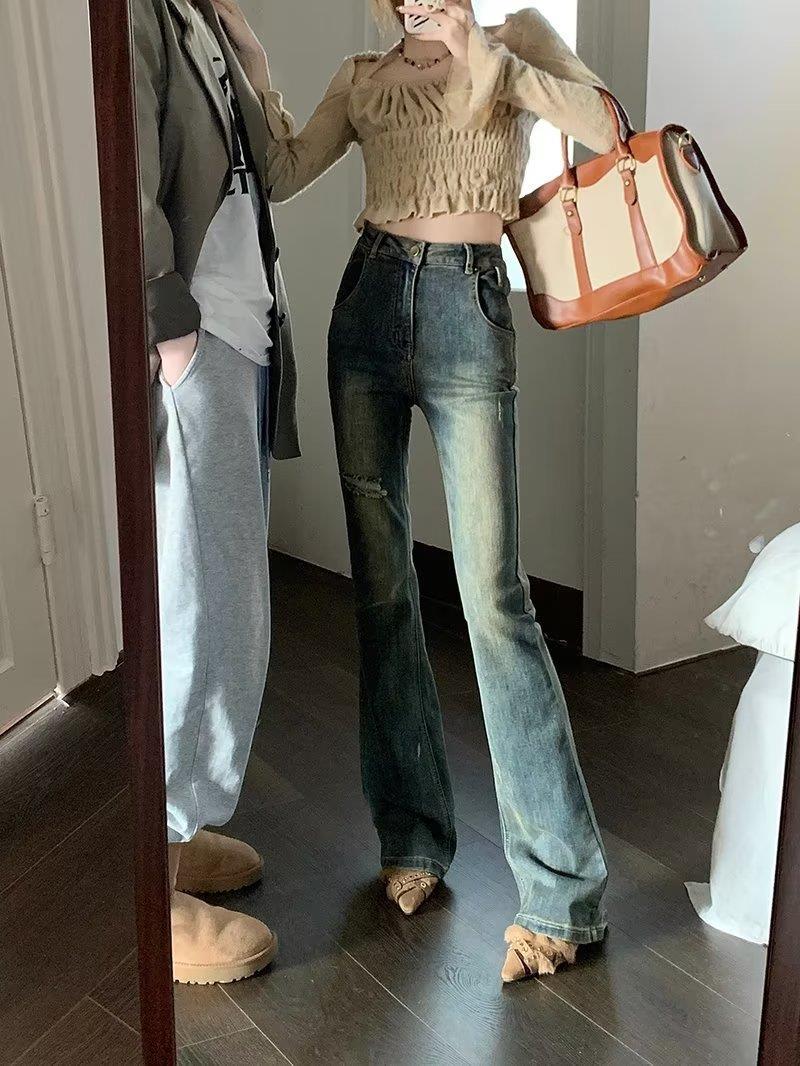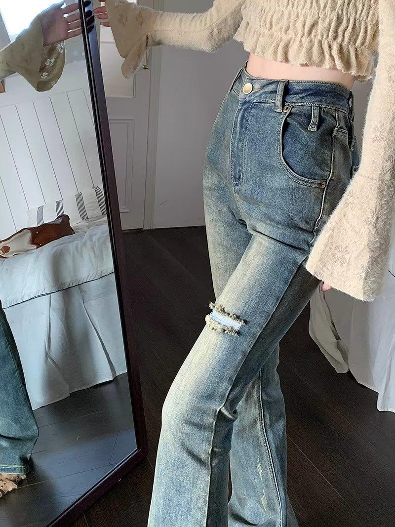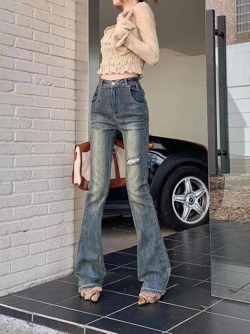 Jeans acampanados retro para mujer otoño e invierno rectos ajustados chica hot callejero rotos ajustados elásticos pantalones de trapeador para mujer