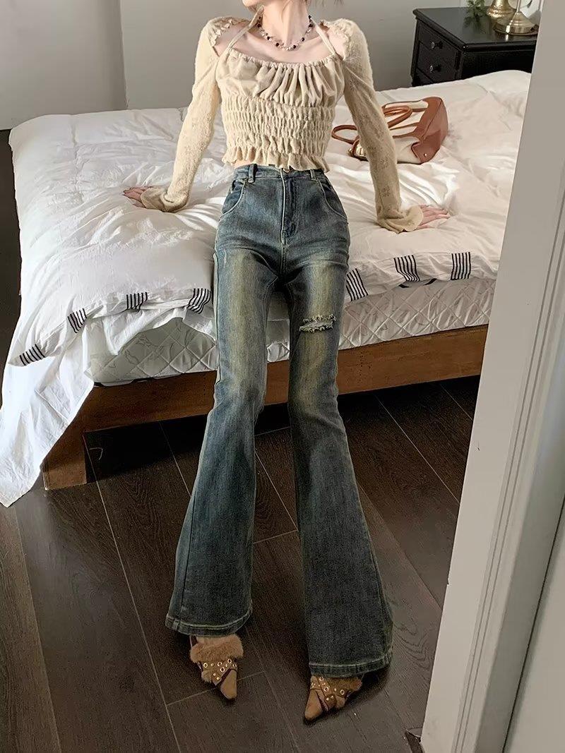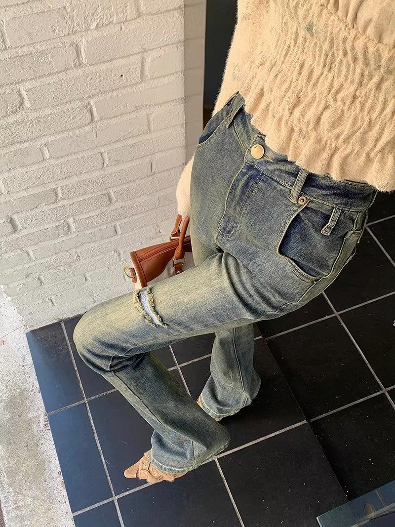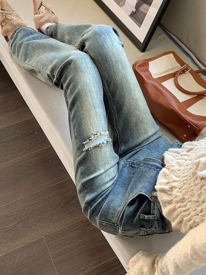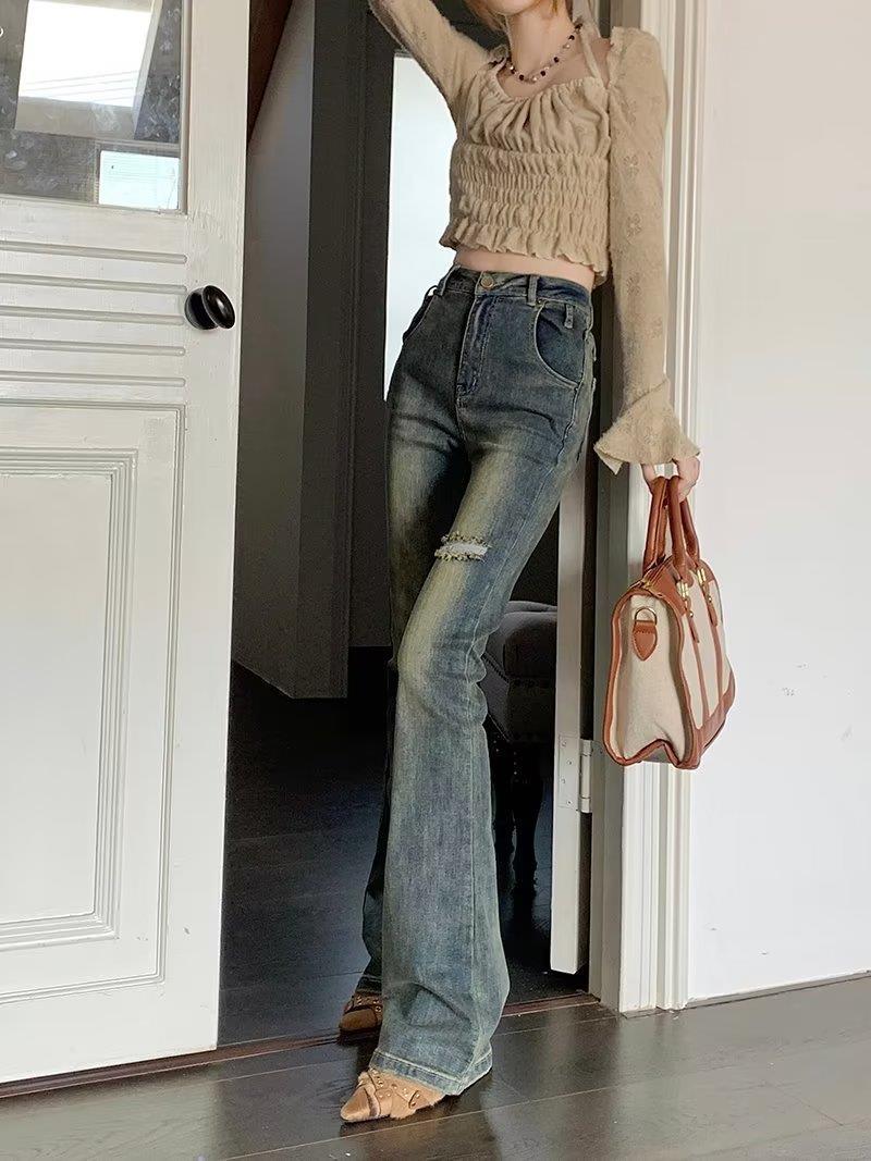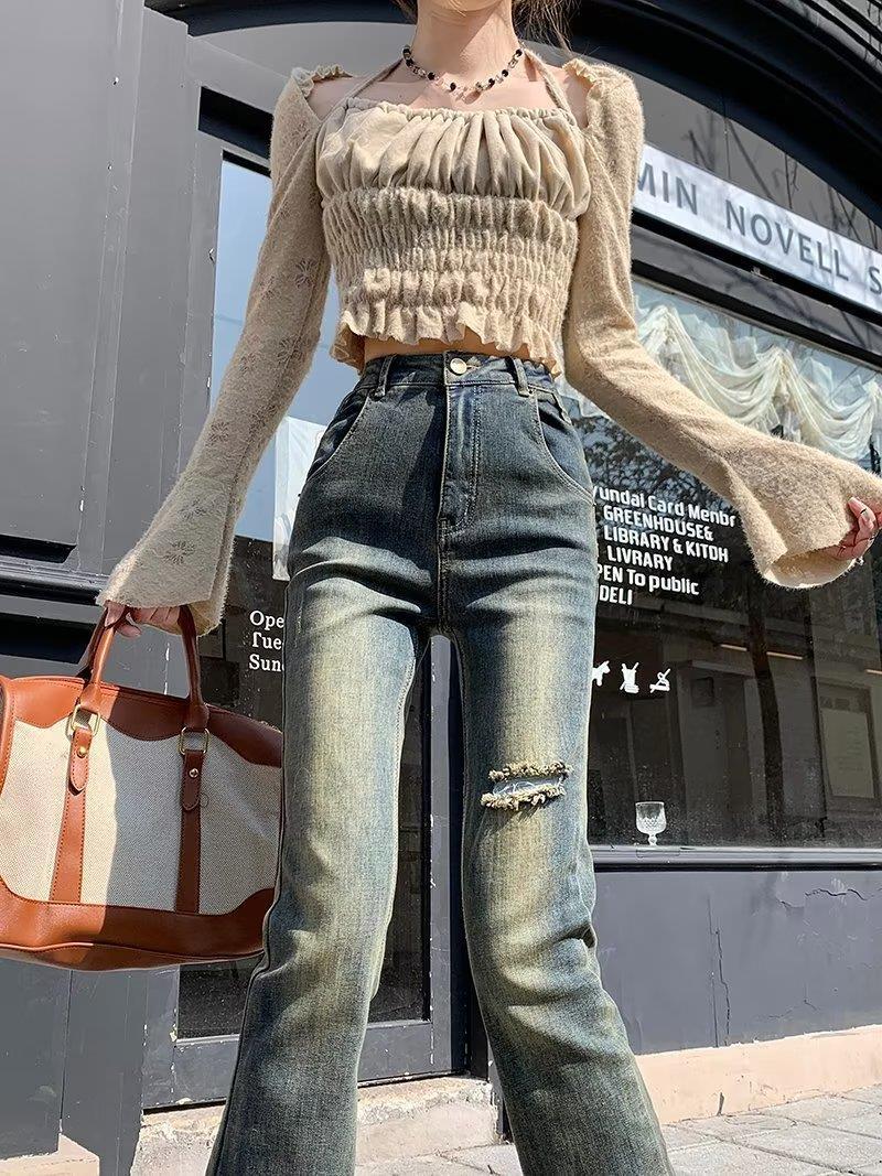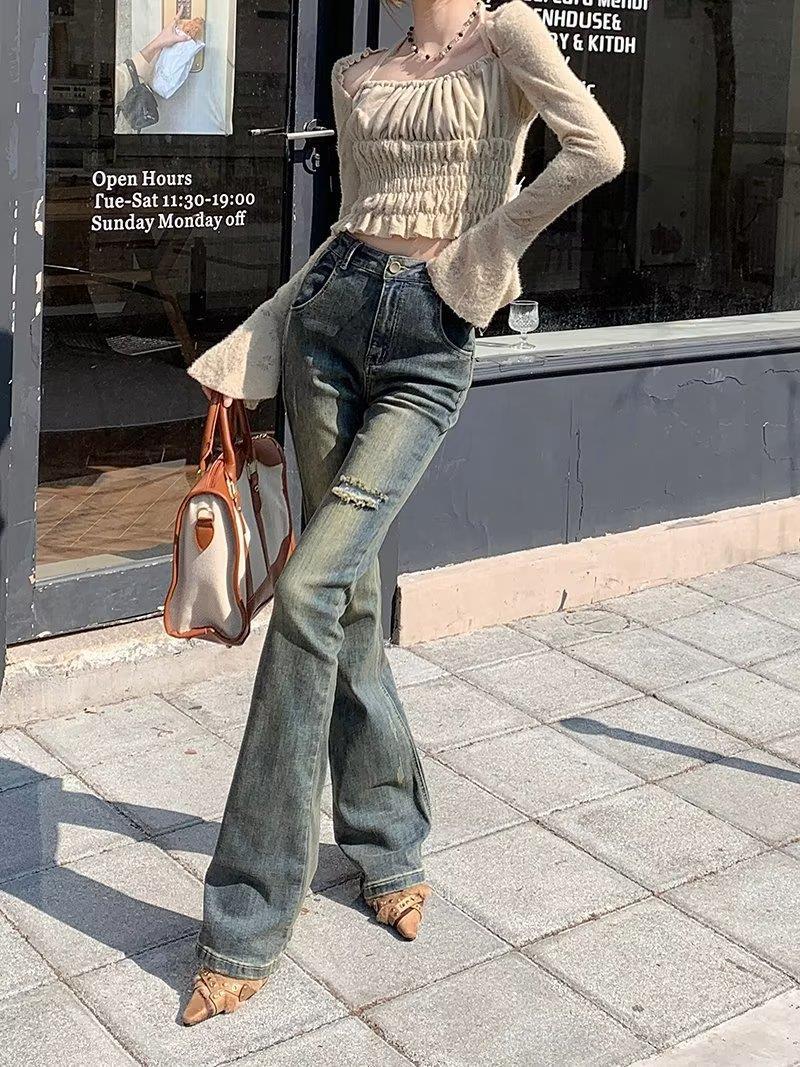 Jeans acampanados retro para mujer otoño e invierno rectos ajustados chica hot callejero rotos ajustados elásticos pantalones de trapeador para mujer