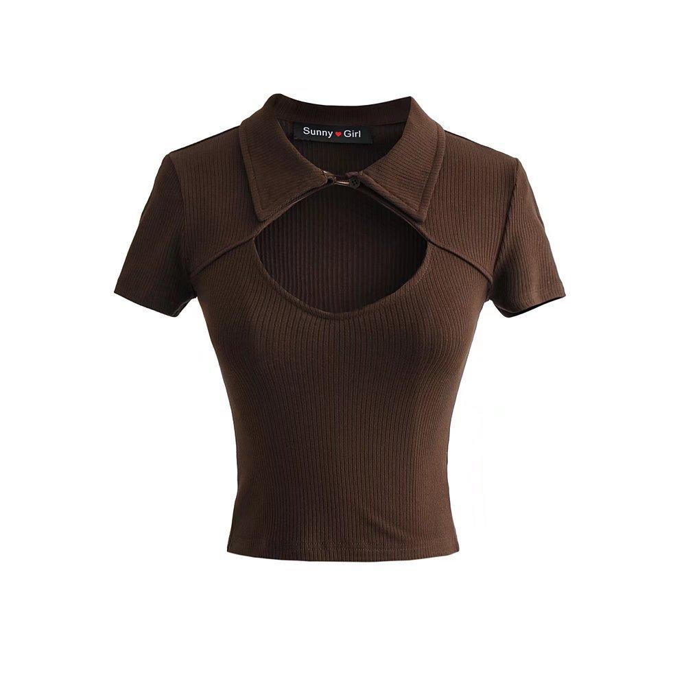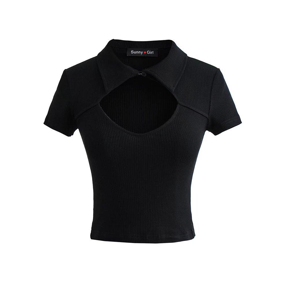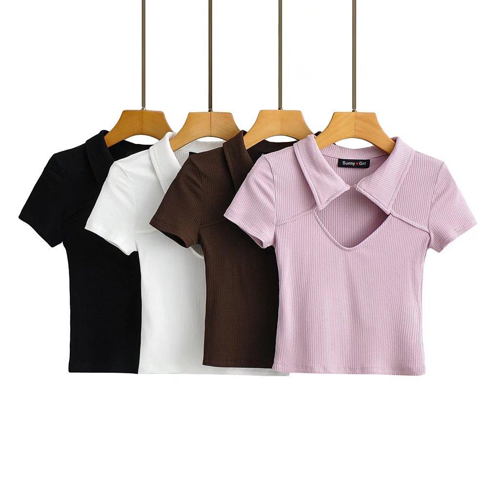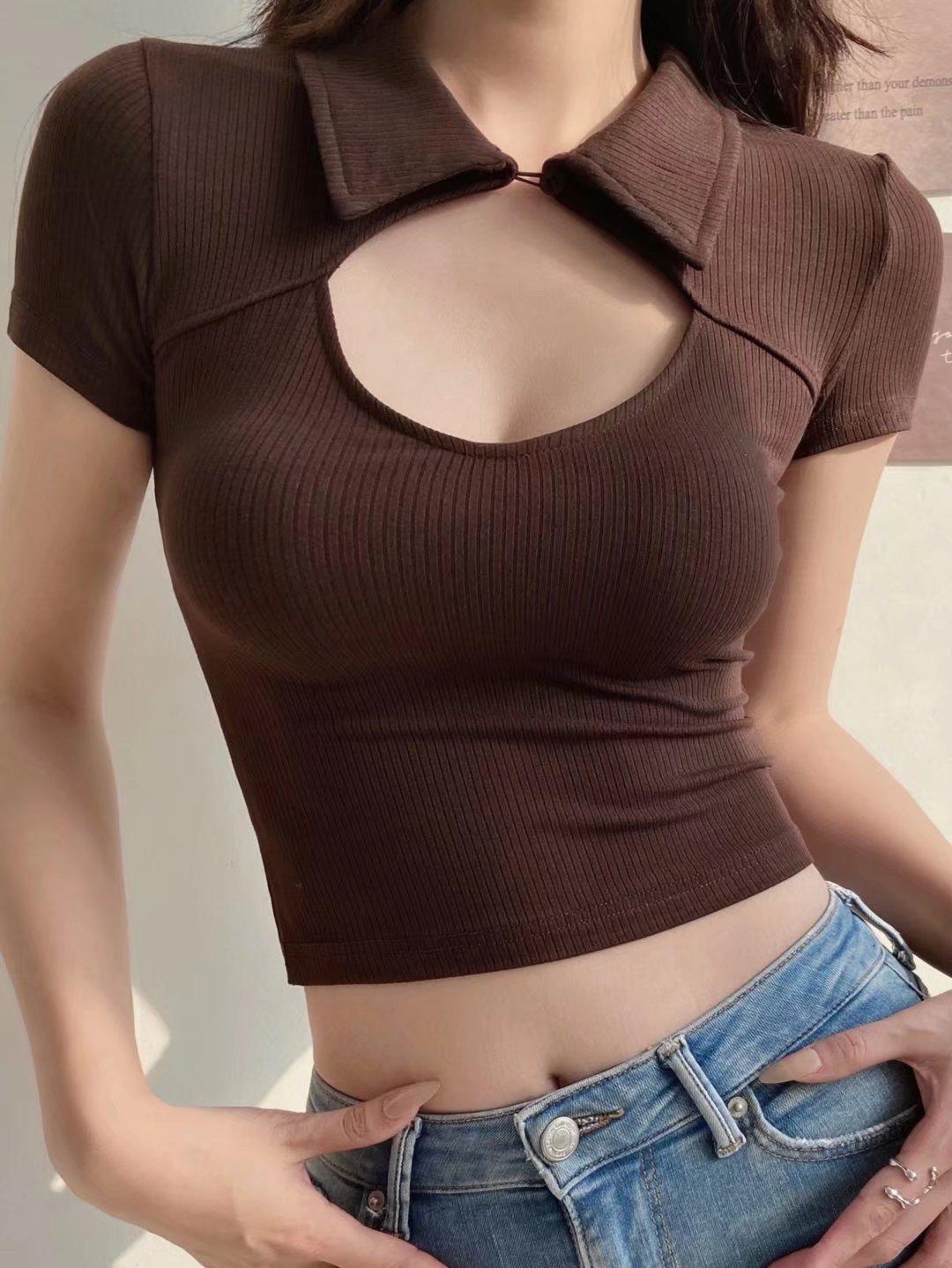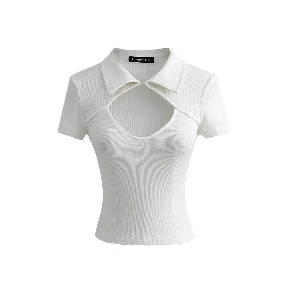 Camiseta de manga corta hueca con cuello de chica sexy europea y americana para primavera y verano, ropa de mujer de estilo europeo y americano, nuevo diseño hueco con solapa pequeña