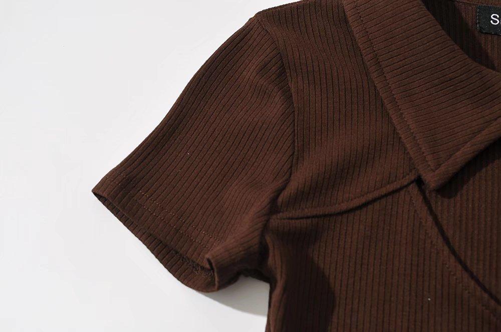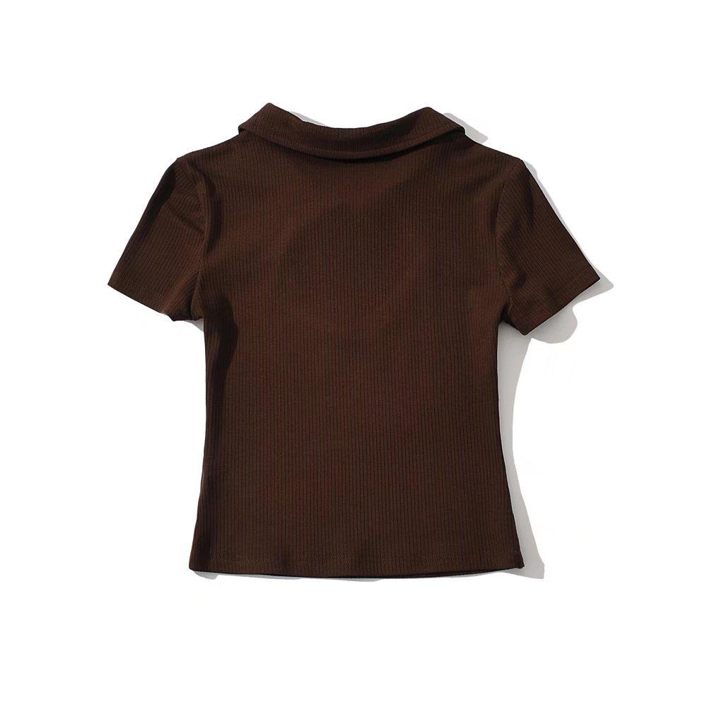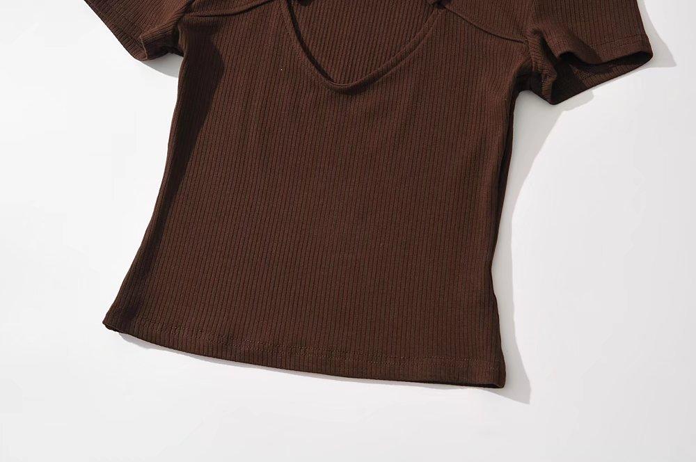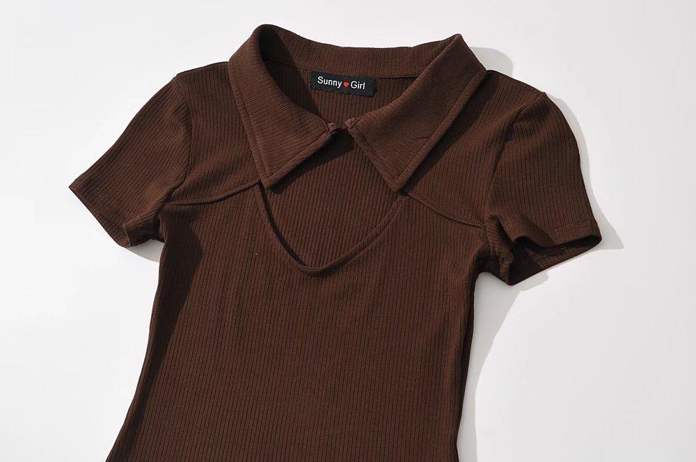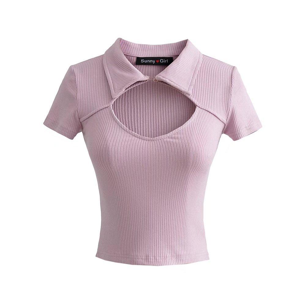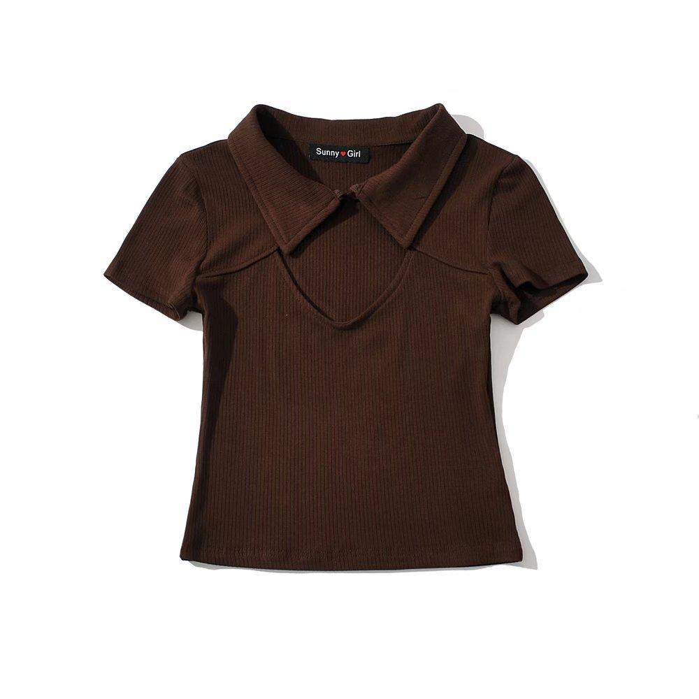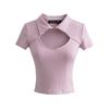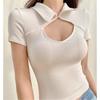 Camiseta de manga corta hueca con cuello de chica sexy europea y americana para primavera y verano, ropa de mujer de estilo europeo y americano, nuevo diseño hueco con solapa pequeña