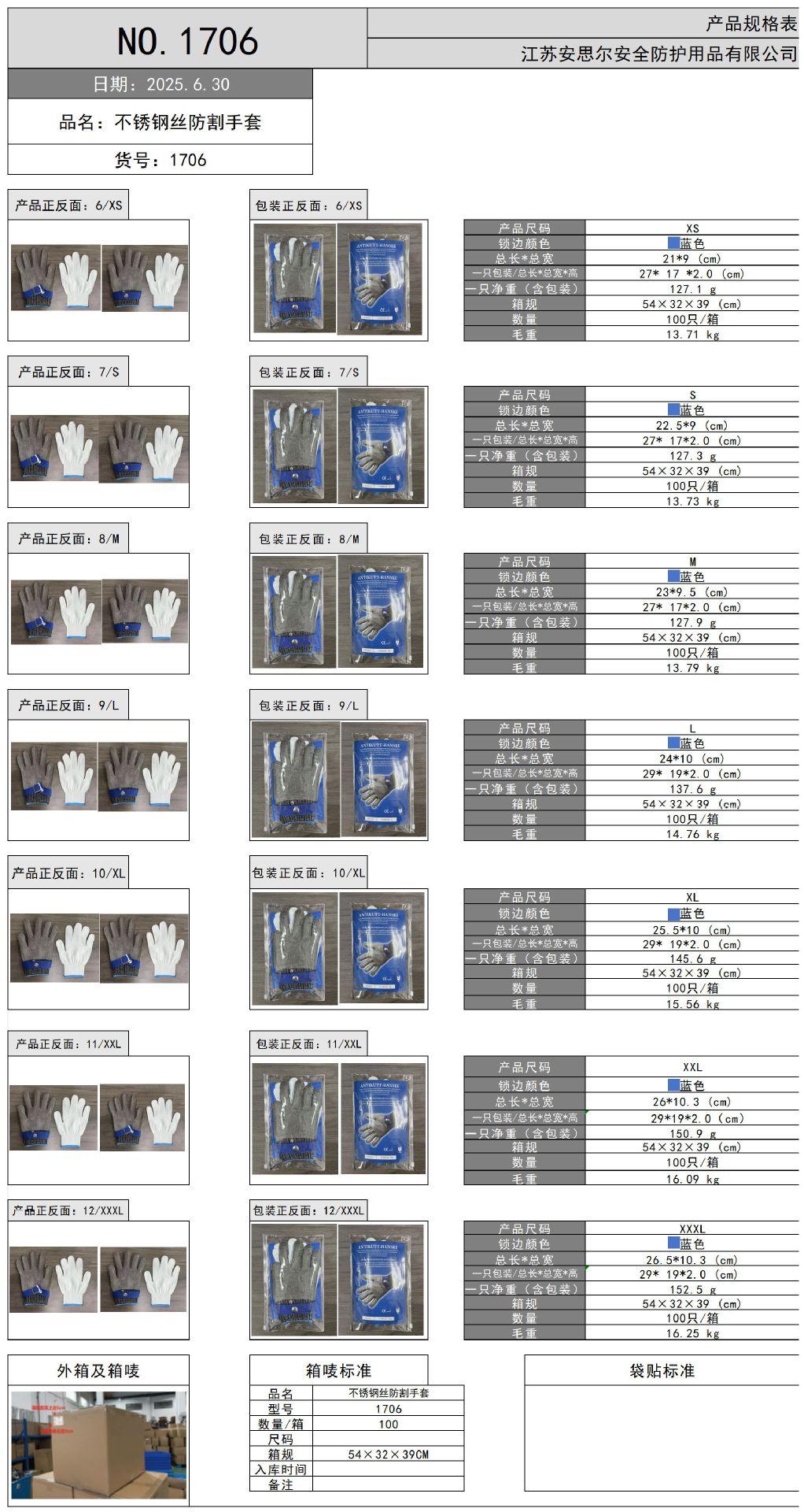XS-cut resistant A6 steel wire 1.0, S-cut resistant A6 steel wire 1.0, M-cut resistant A6 steel wire 1.0, L-cu...