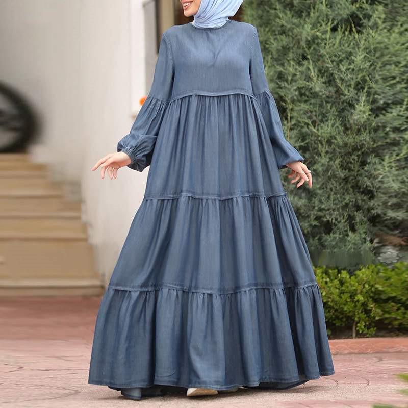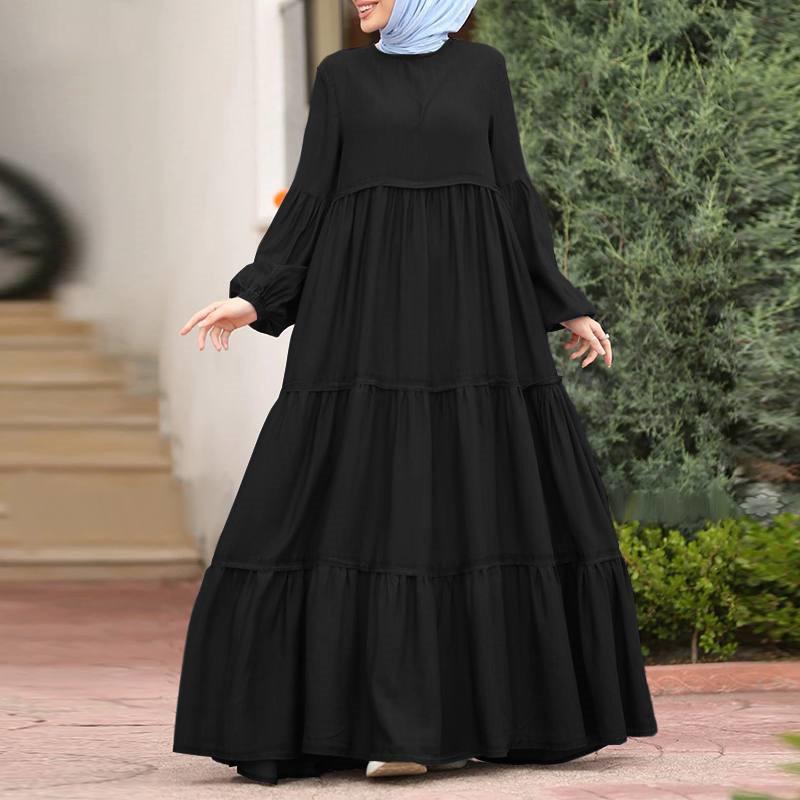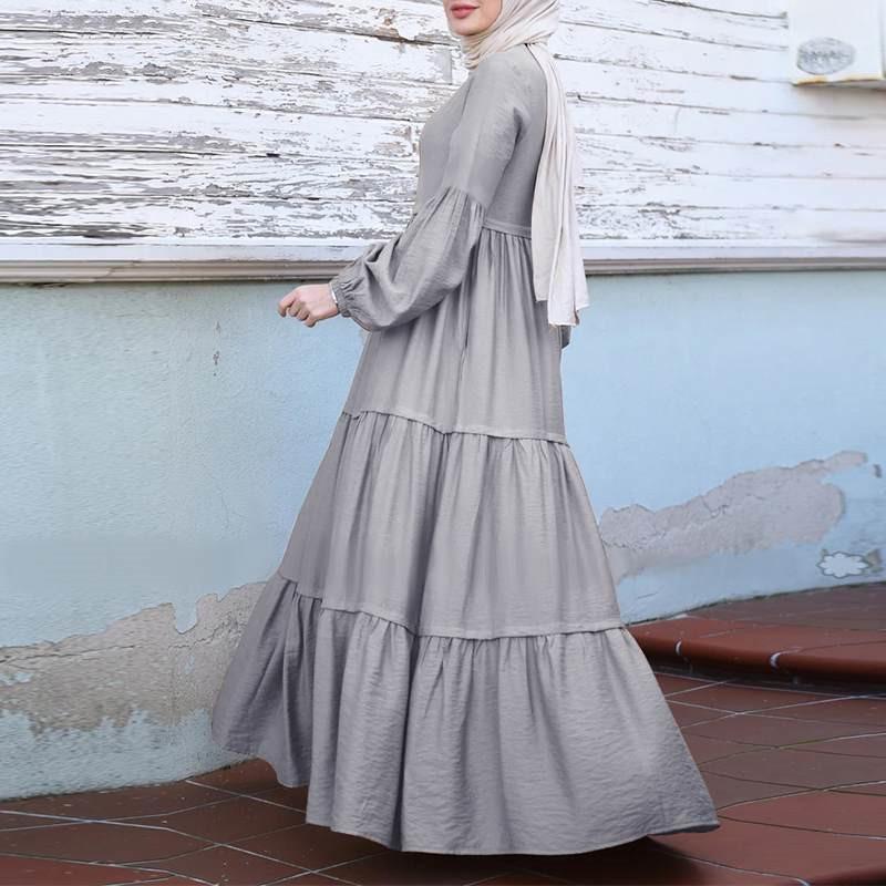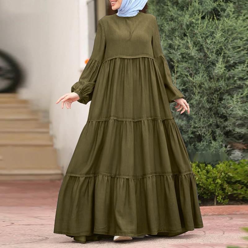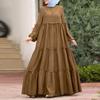 Falda musulmana de otoño de hoja de loto Vestido coreano con volantes para mujer Casual suelto cuello redondo vestido largo