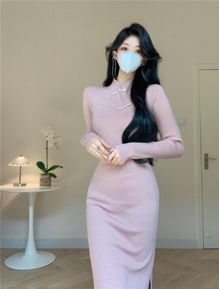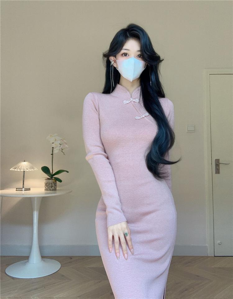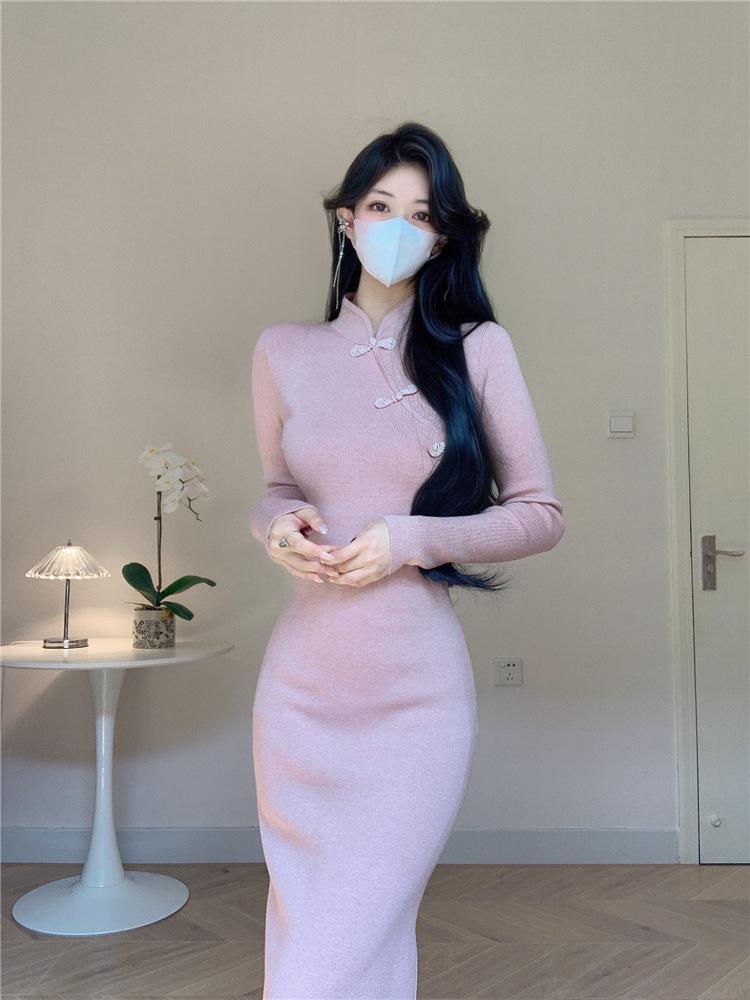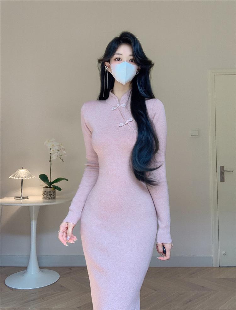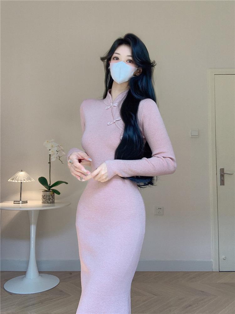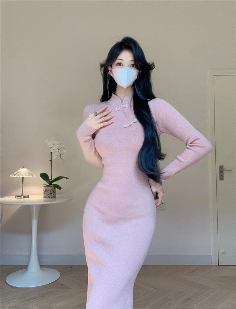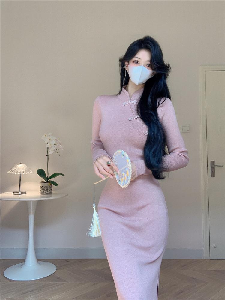Vestido de punto con base interior elegante y suave de cheongsam mejorado estilo nacional retro chino nuevo de otoño e invierno para mujer