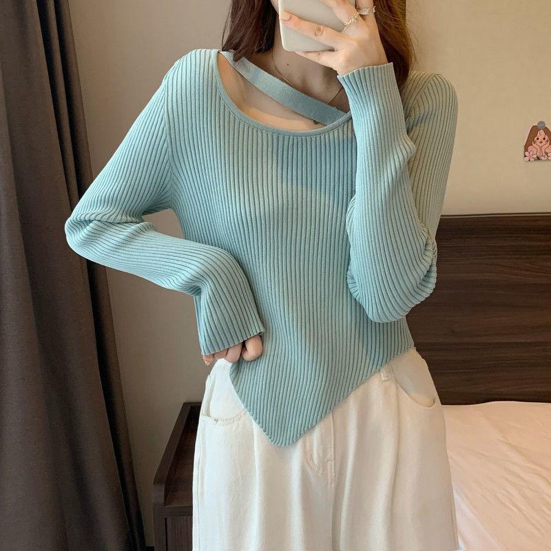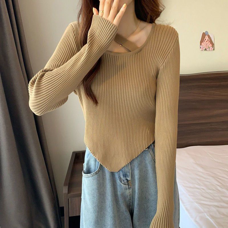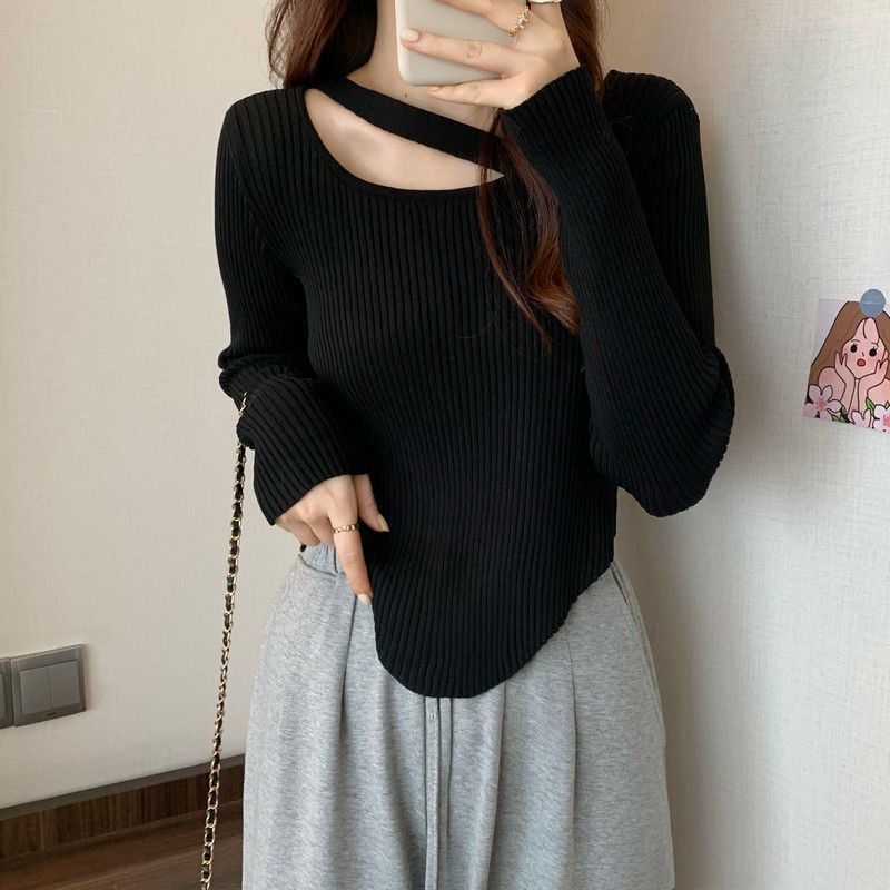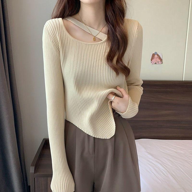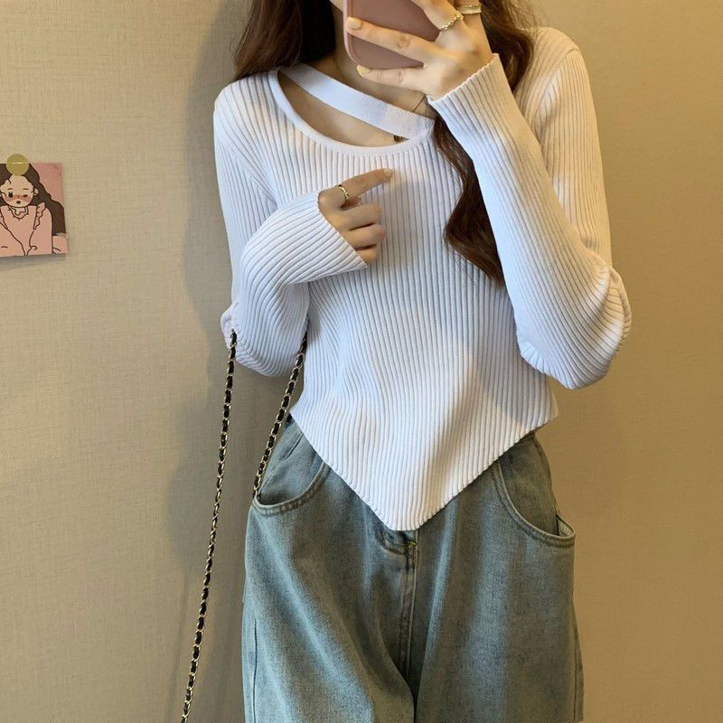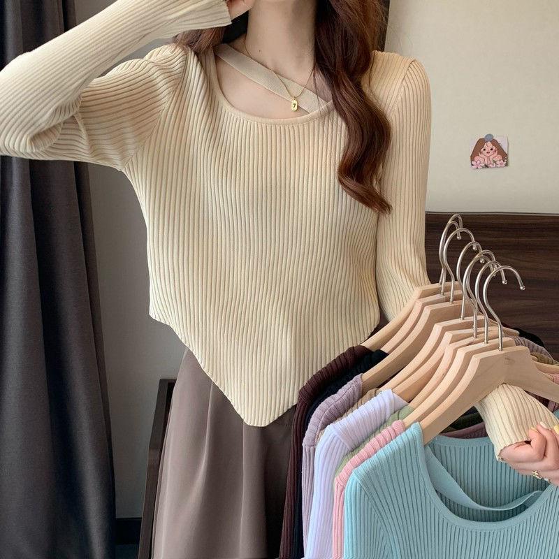 Camiseta Base Tejida Irregular Francesa Puro Deseo para Mujer Primavera y Otoño 2023 Diseño Interior Chic Top Corto Clavícula