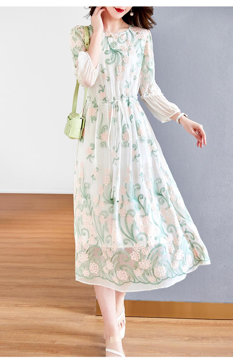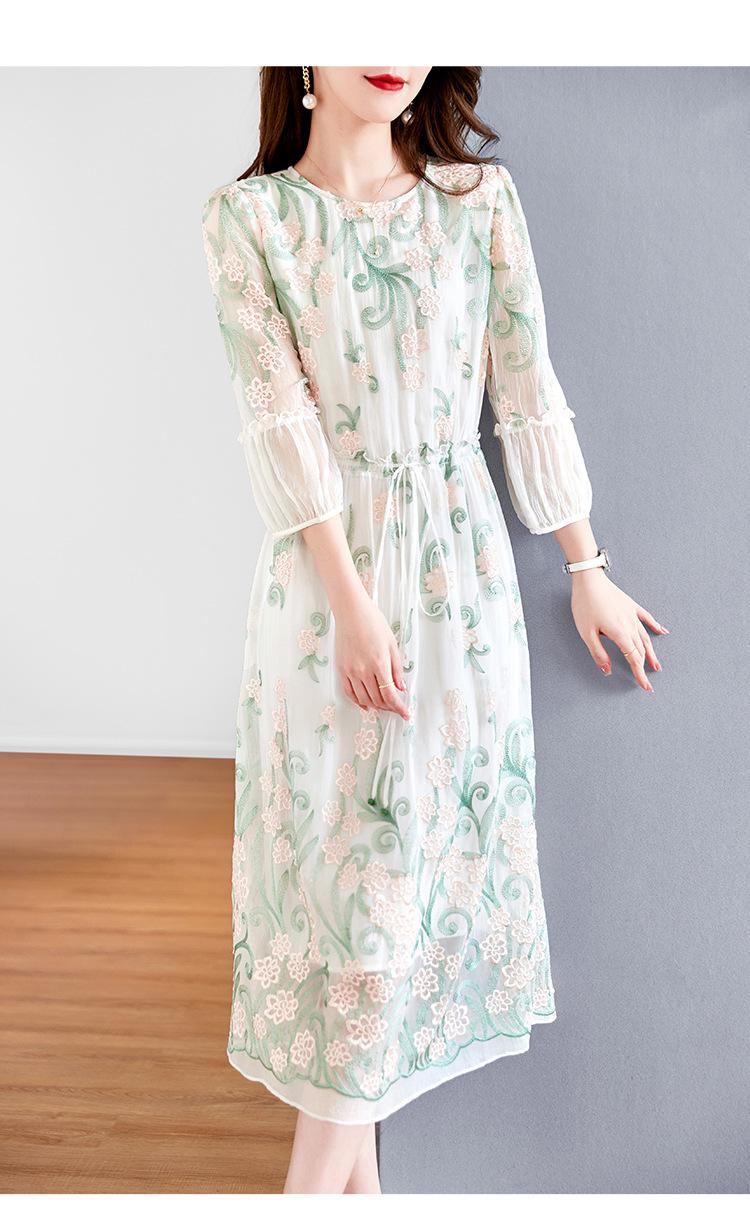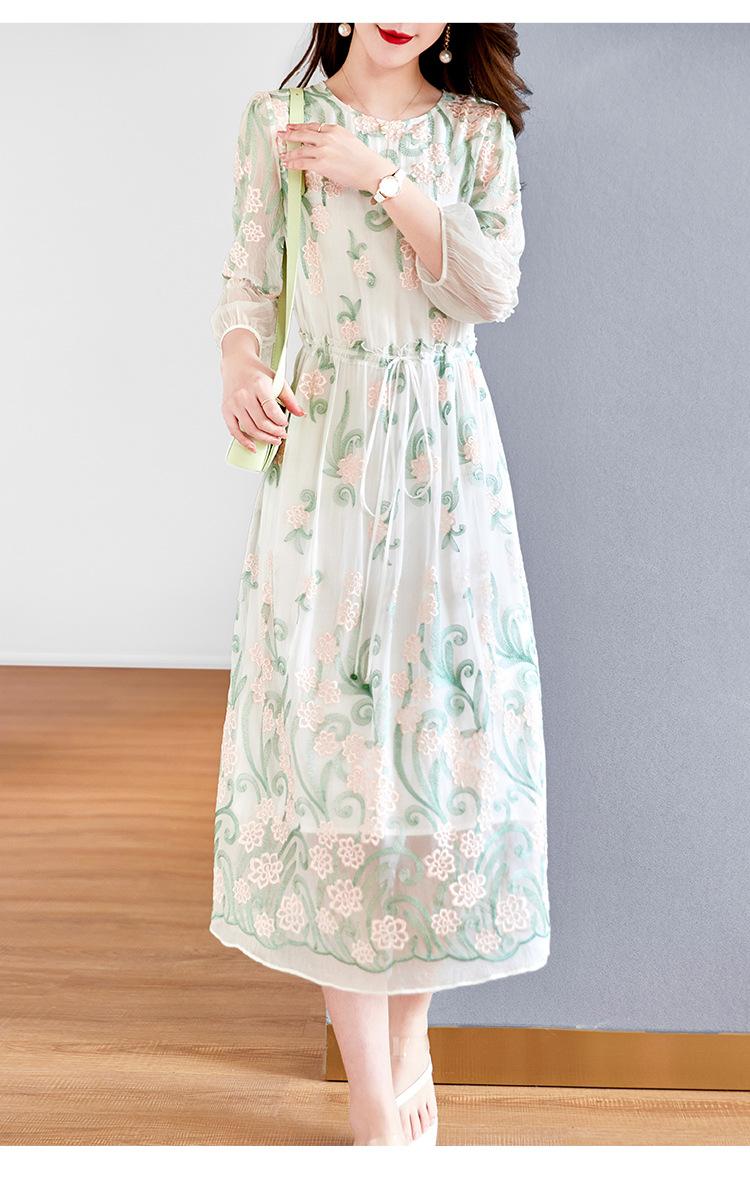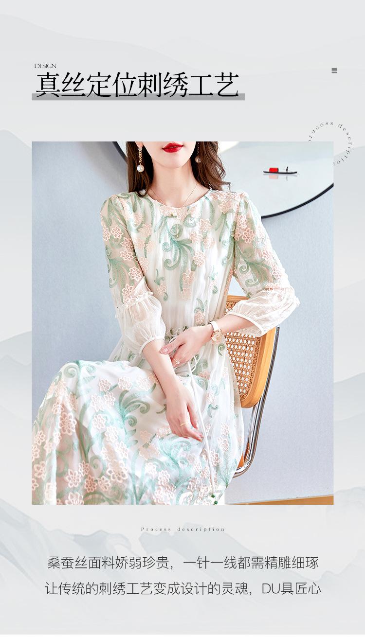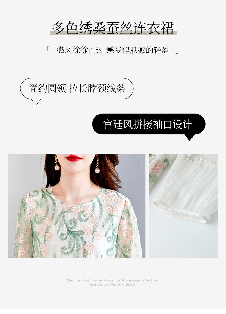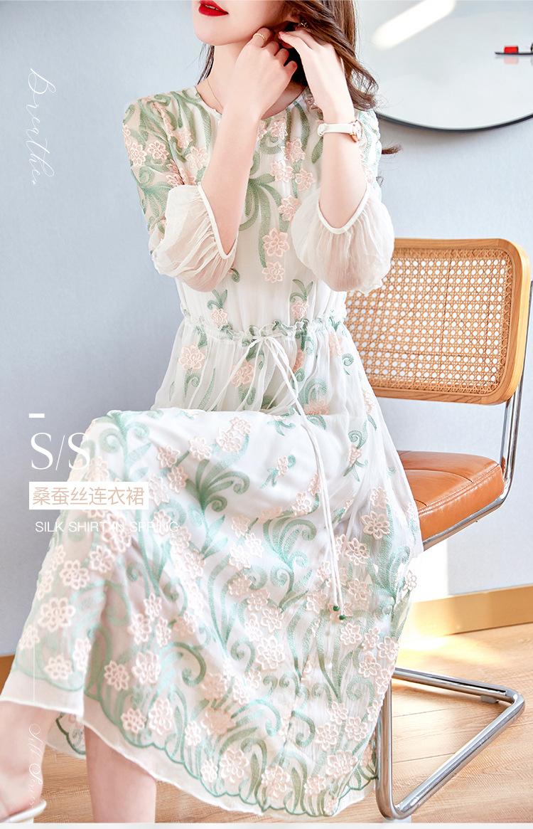 [Oferta Especial por Tiempo Limitado] Vestido de Seda Bordado para Mujer, Cintura Alta, Cuello Redondo, Falda Midi de Seda de Morera 82399657