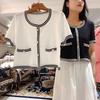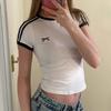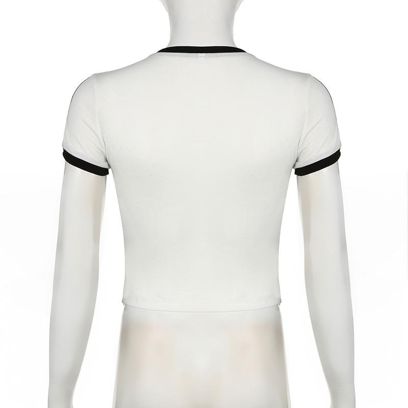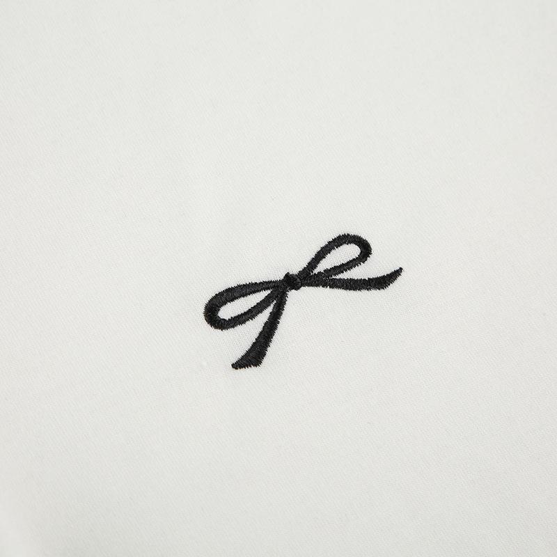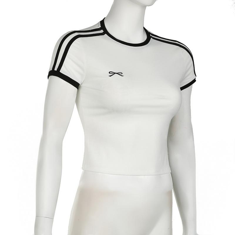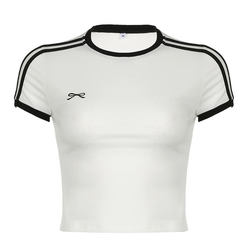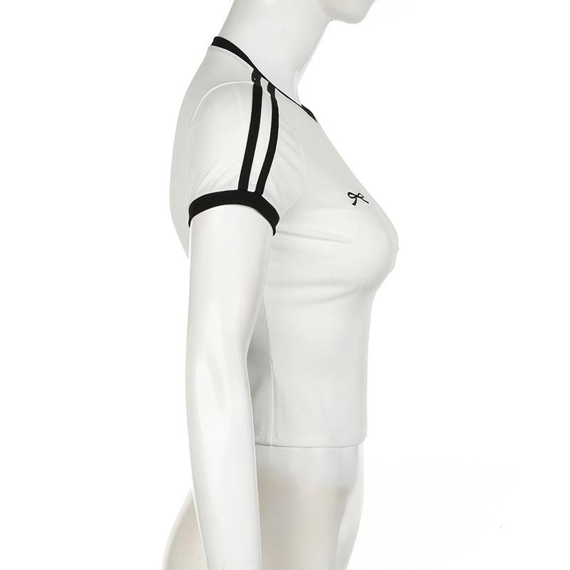Camiseta corta con cuello redondo y costuras bordadas con lazo informal de moda de verano y otoño de estilo europeo y americano transfronterizo.