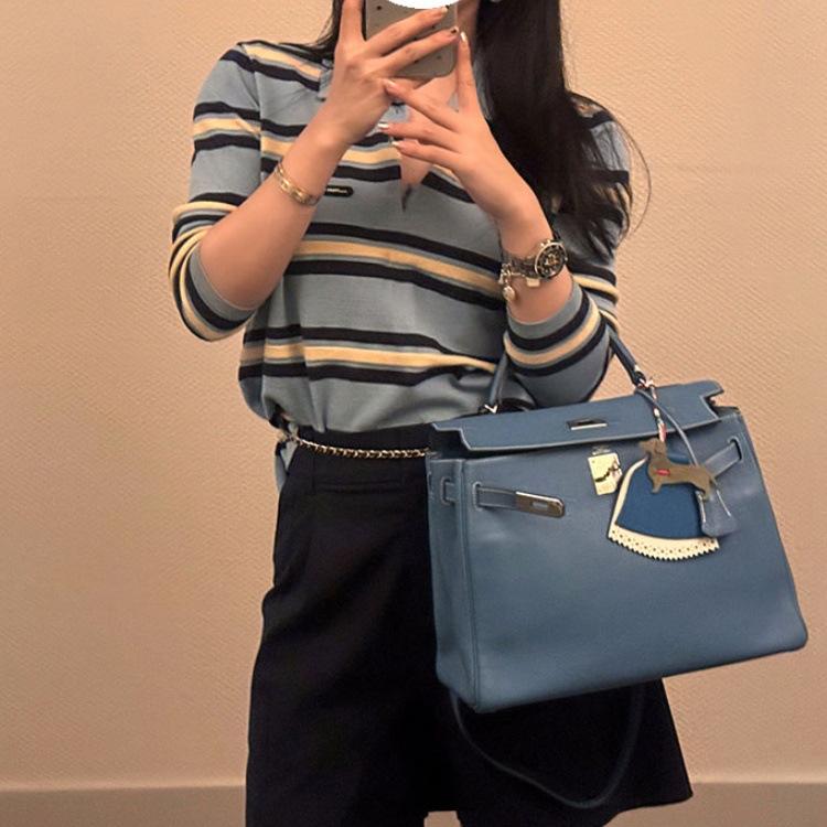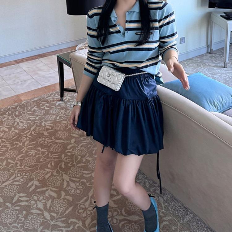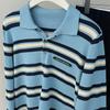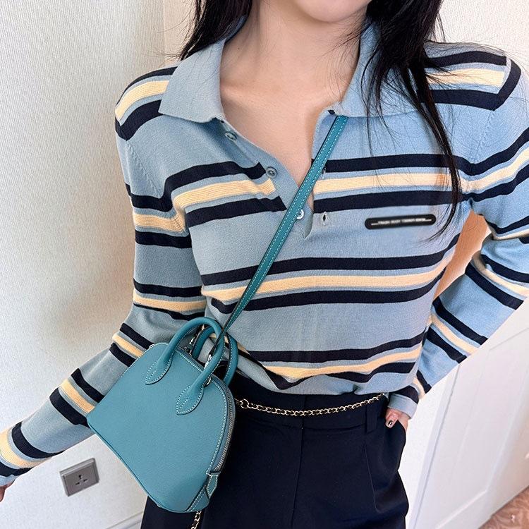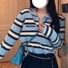 Camisa de punto con cuello polo a rayas azules, etiqueta con letras, estilo coreano de principios de otoño, estilo frío, para mujer, top de manga larga que combina con todo y que reduce la edad.
