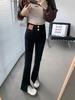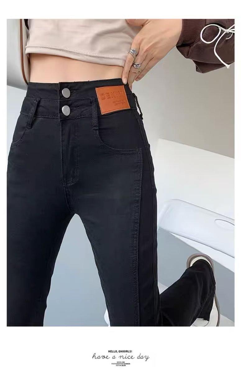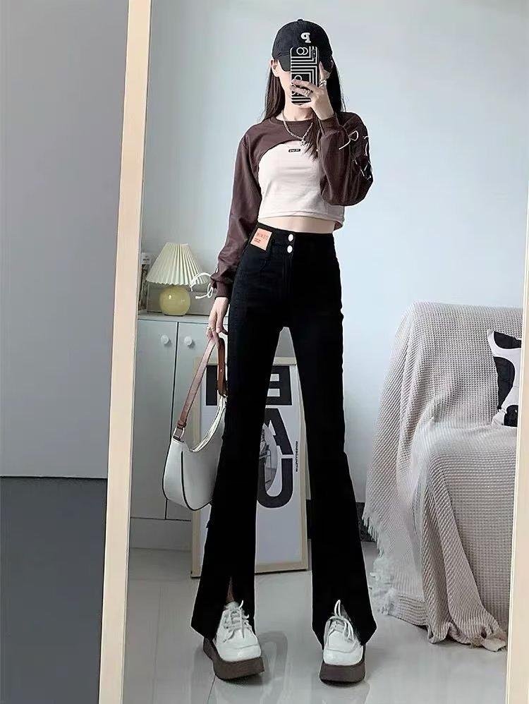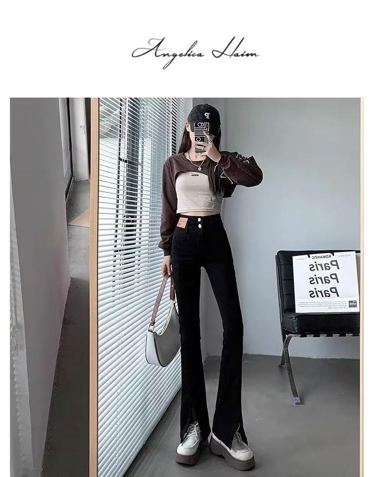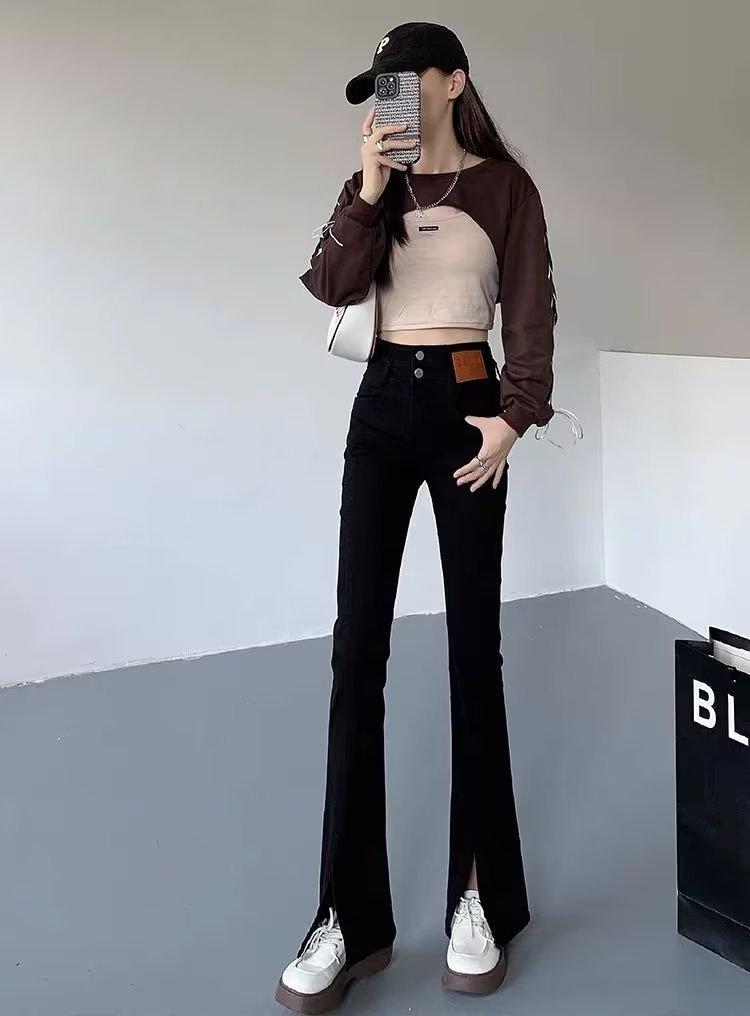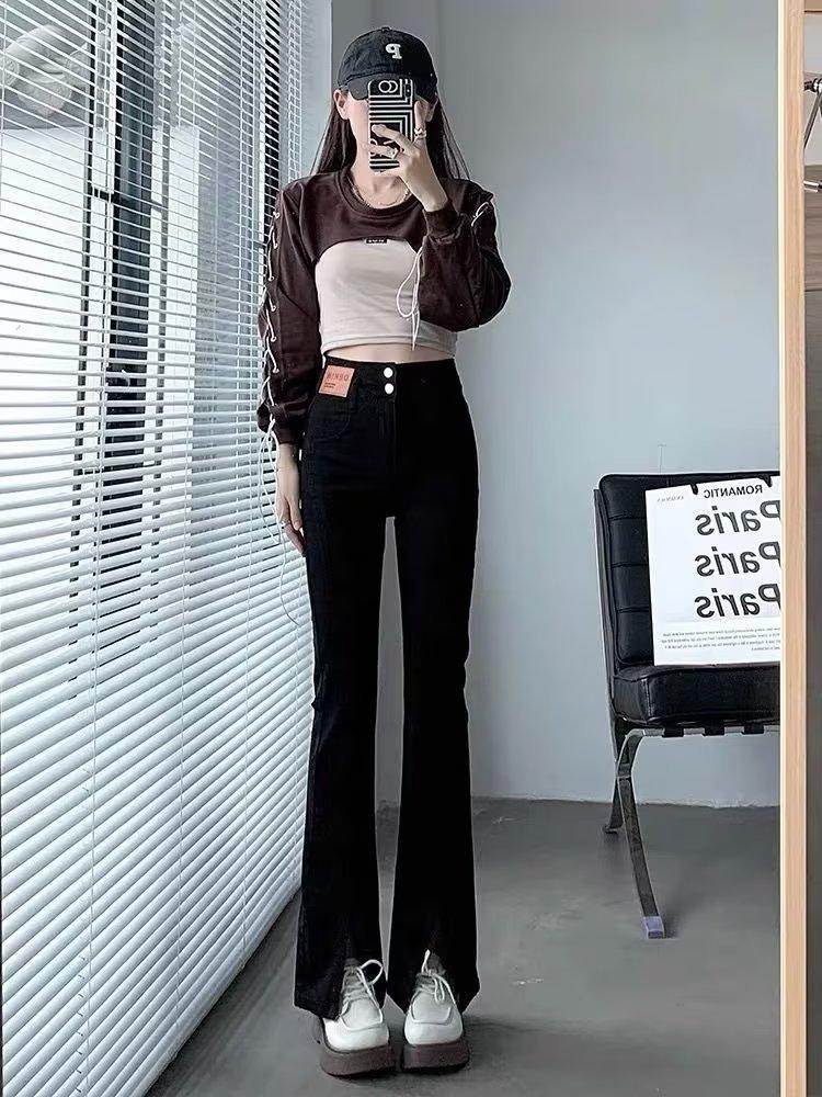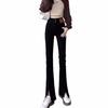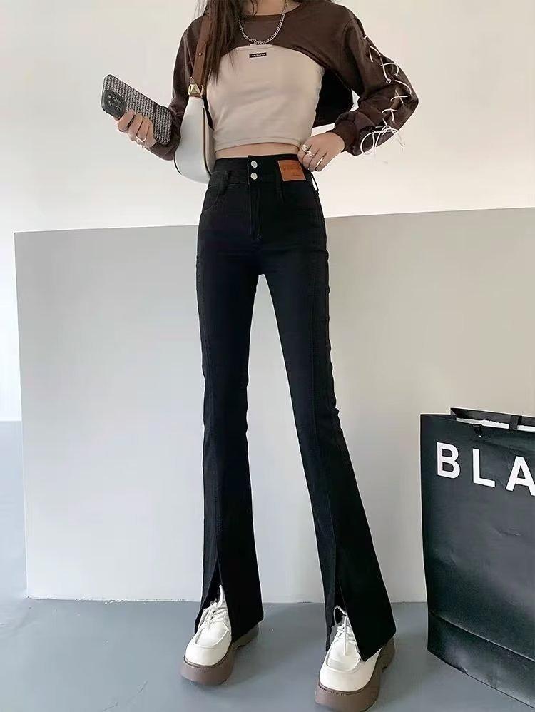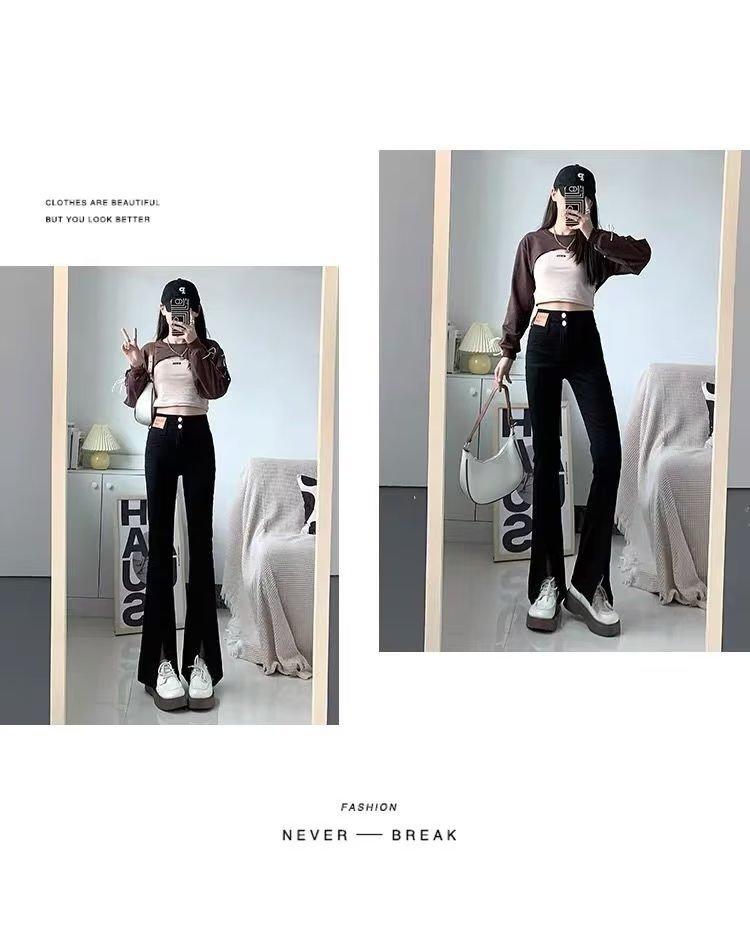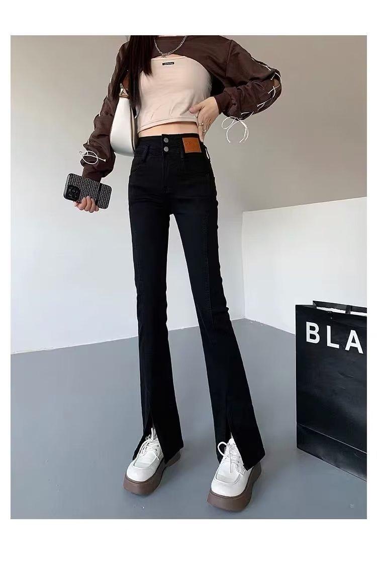 Jeans acampanados elásticos de cintura alta con abertura para mujer, nuevos diseños de primavera y otoño de corte ajustado, pantalones de pierna ancha de cintura alta con botones