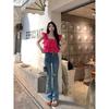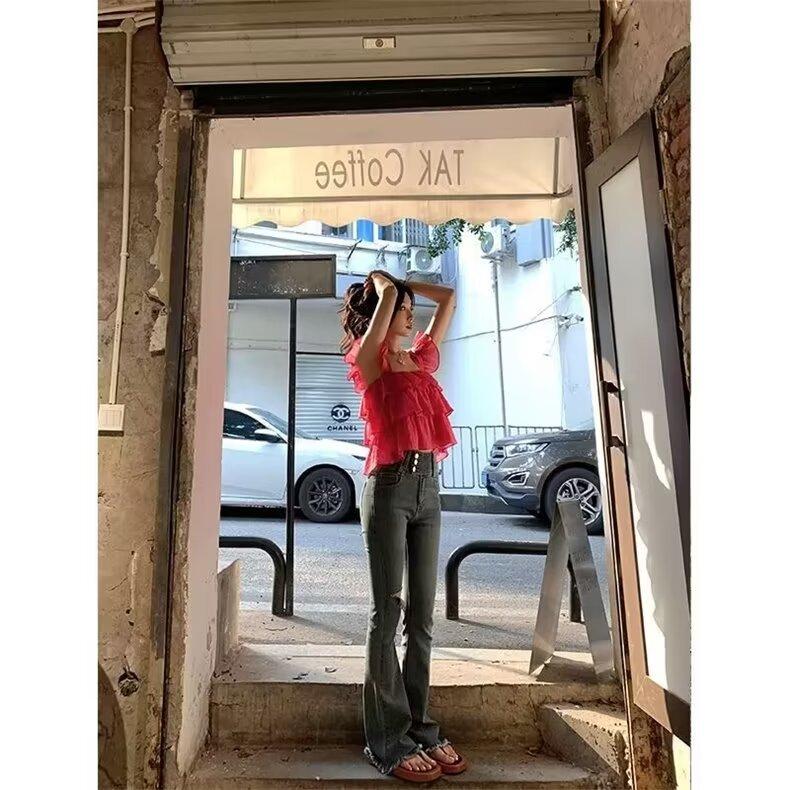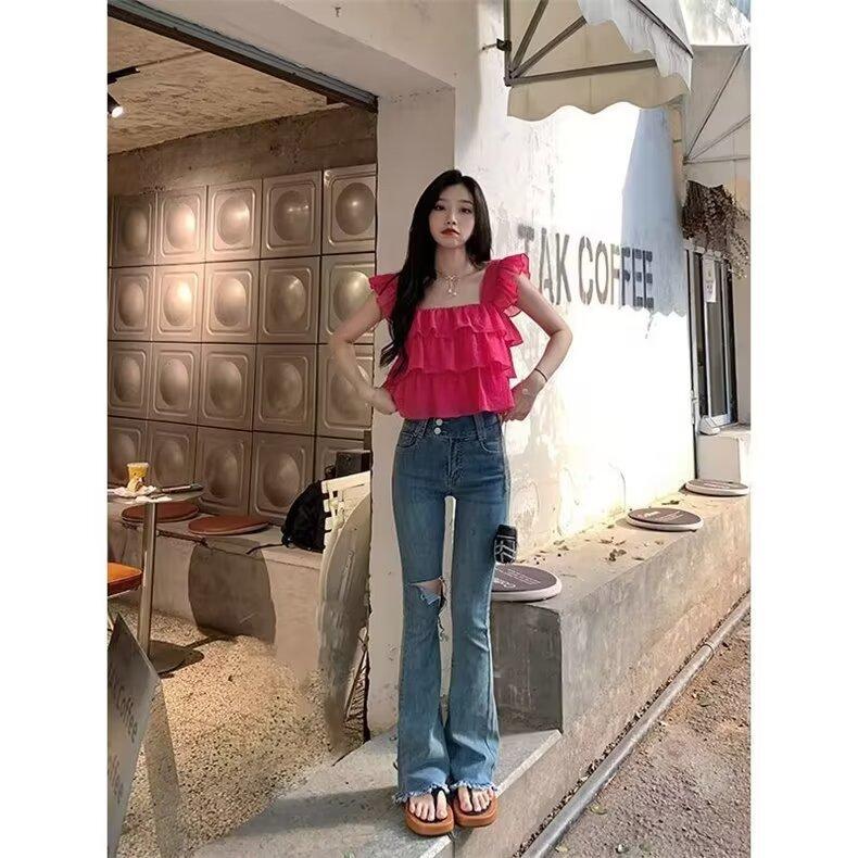 Vaqueros de otoño para mujer, ajustados, sexys y sexys, vaqueros retro con abertura y tiras con borde sin rematar para mujer, verano