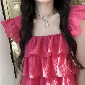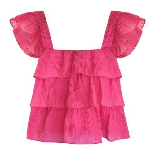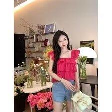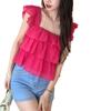 Elegante camisa de chifón con cuello cuadrado y volantes para mujer 2024 nuevo diseño plisado con cordón súper hada top de manga corta abullonada