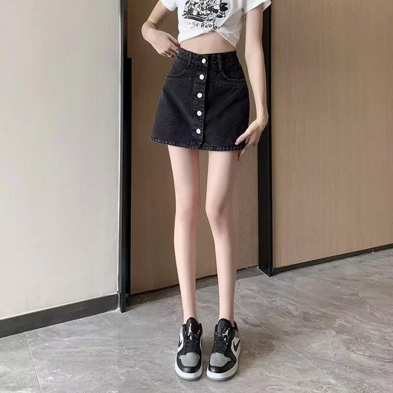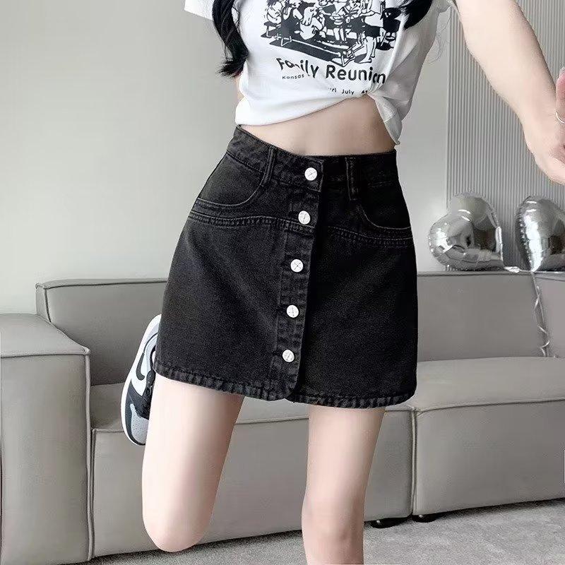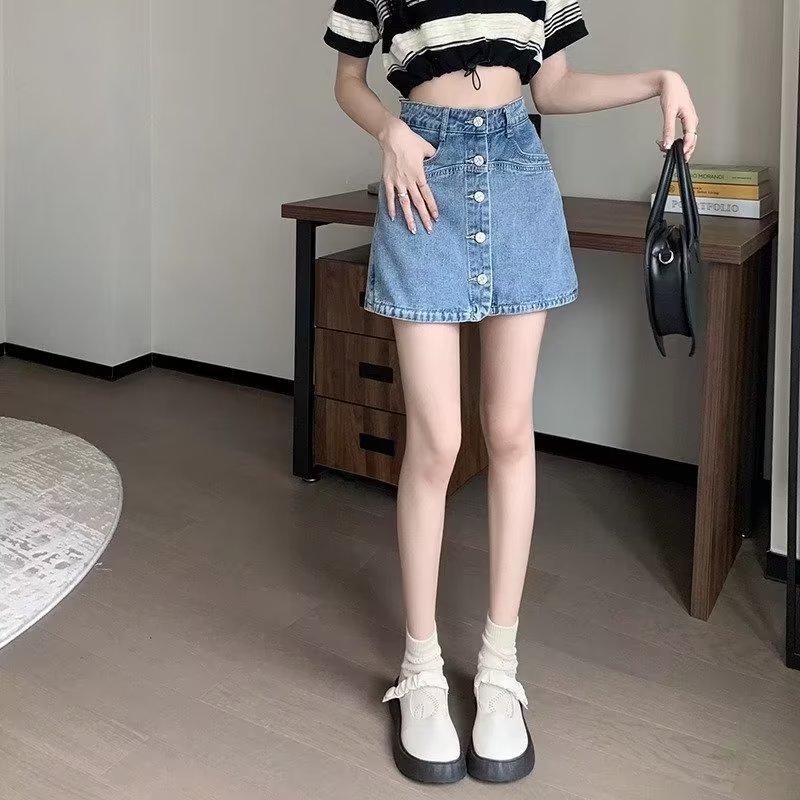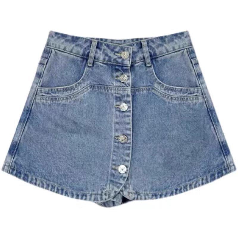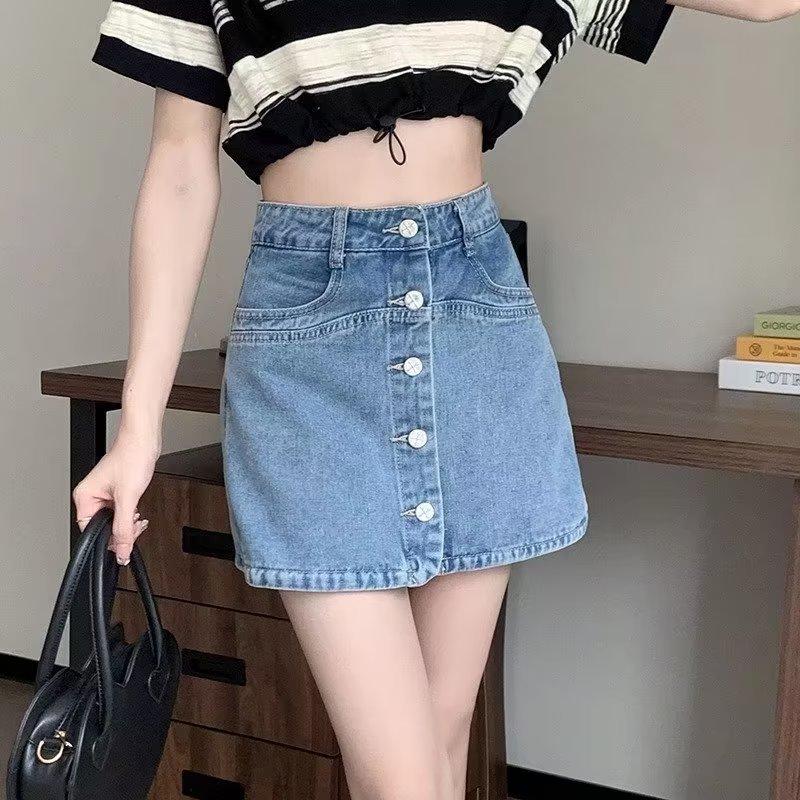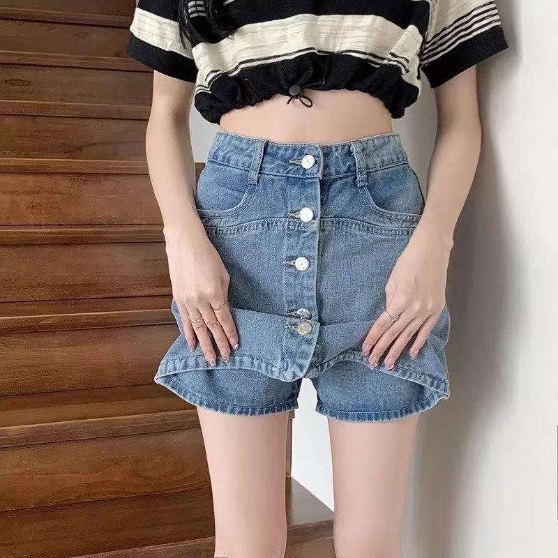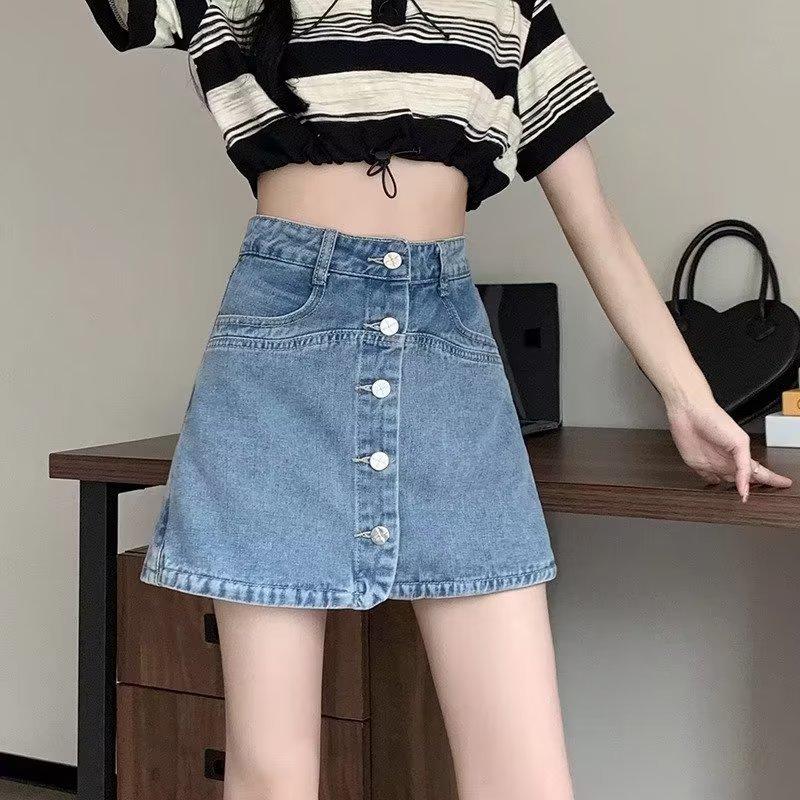 Falda corta de mezclilla de verano 2024 a prueba de exposición para mujer, pantalón falda de cintura alta, corte slim, estilo ins, holgada, con botones, falda acampanada