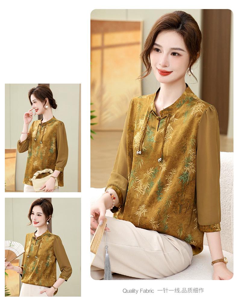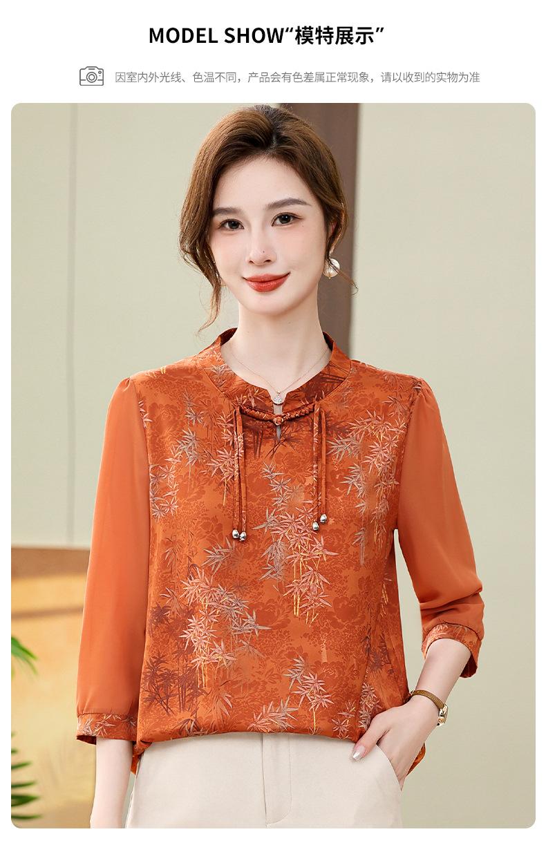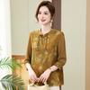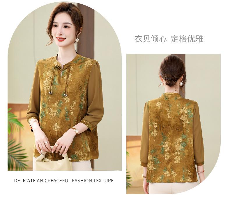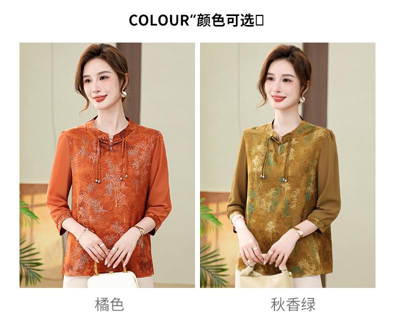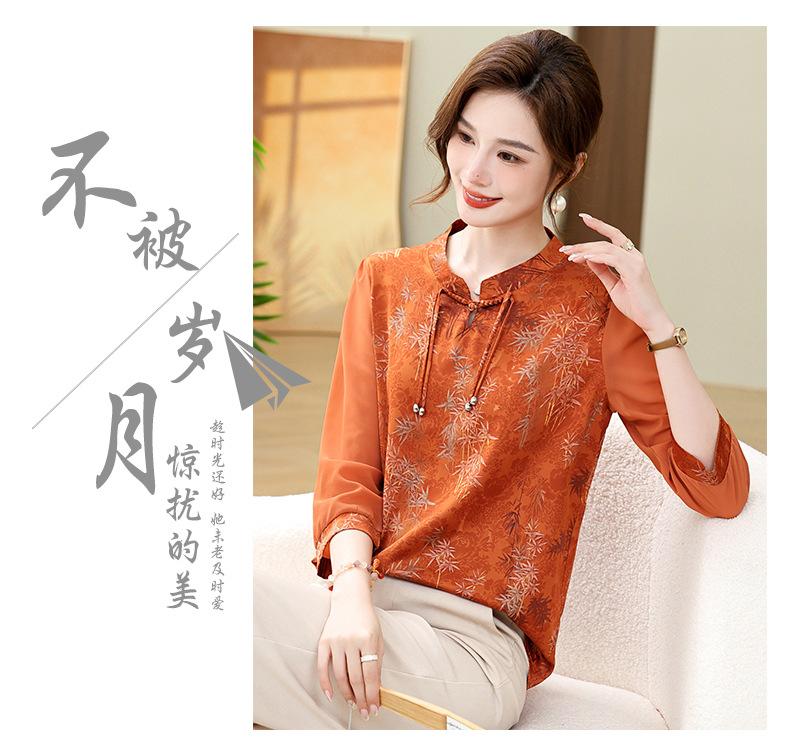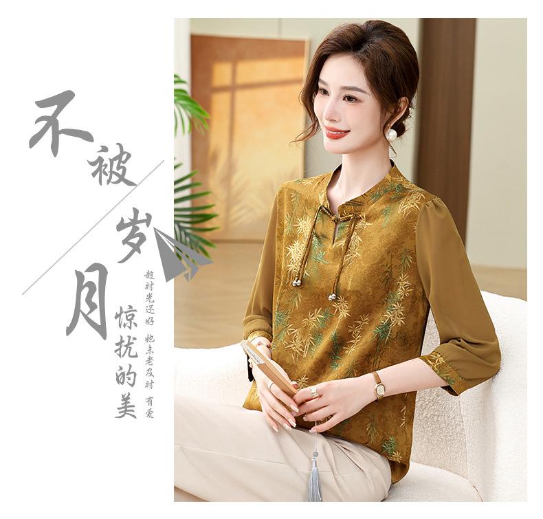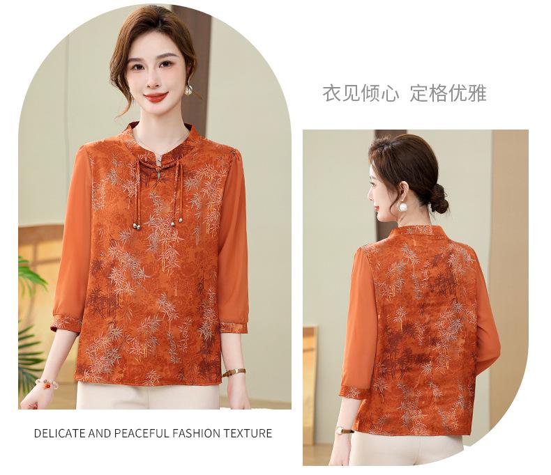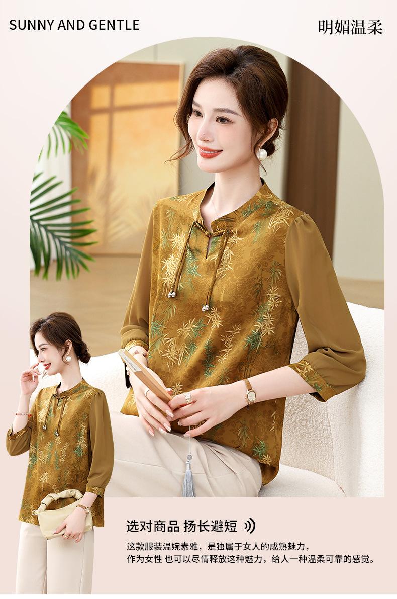 Nueva camiseta de manga larga estilo chino para madres, camisa pequeña de primavera para mujeres de mediana edad con cuello vertical, manga media, top nuevo de principios de verano 2024 para mujeres