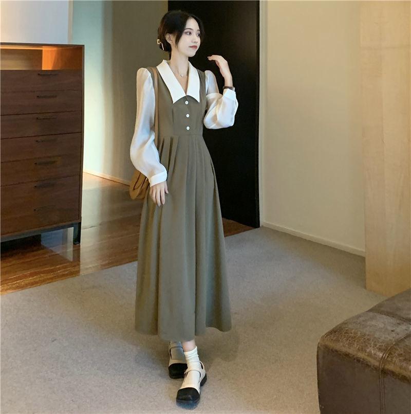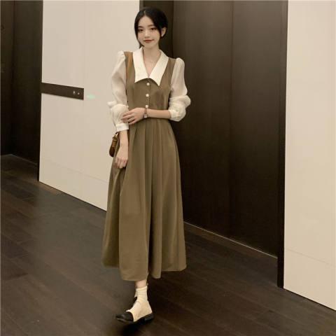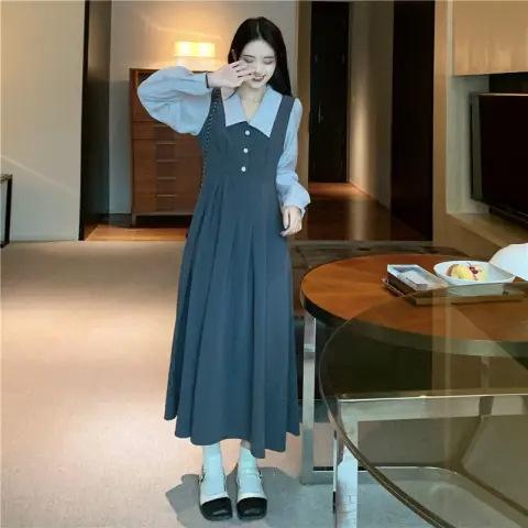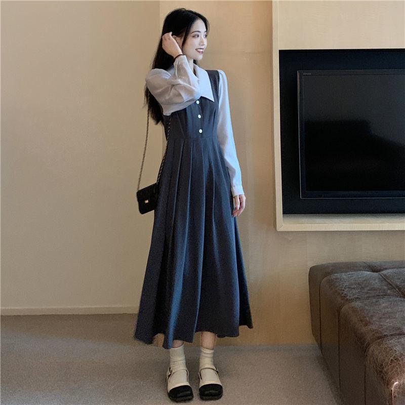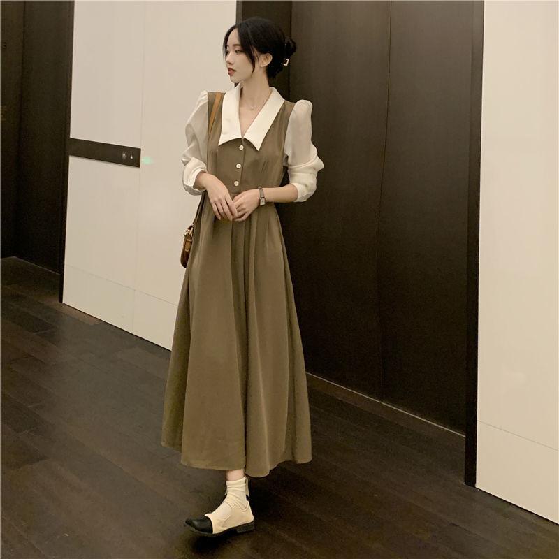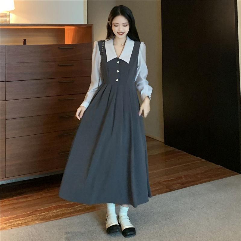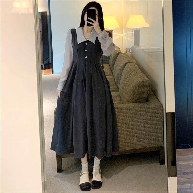 Vestido de dos piezas de manga larga con costuras retro francesas falsas para mujer, talla grande, primavera y otoño, nueva falda elegante de estilo universitario de nicho
