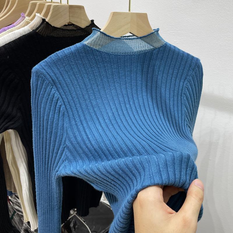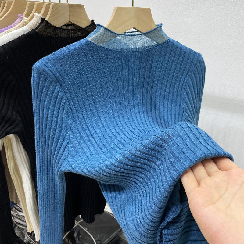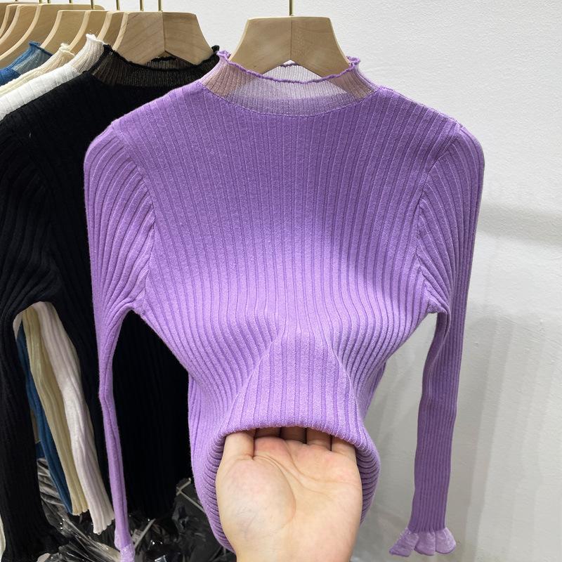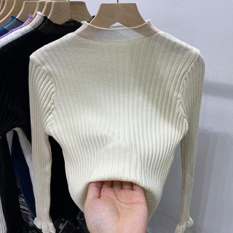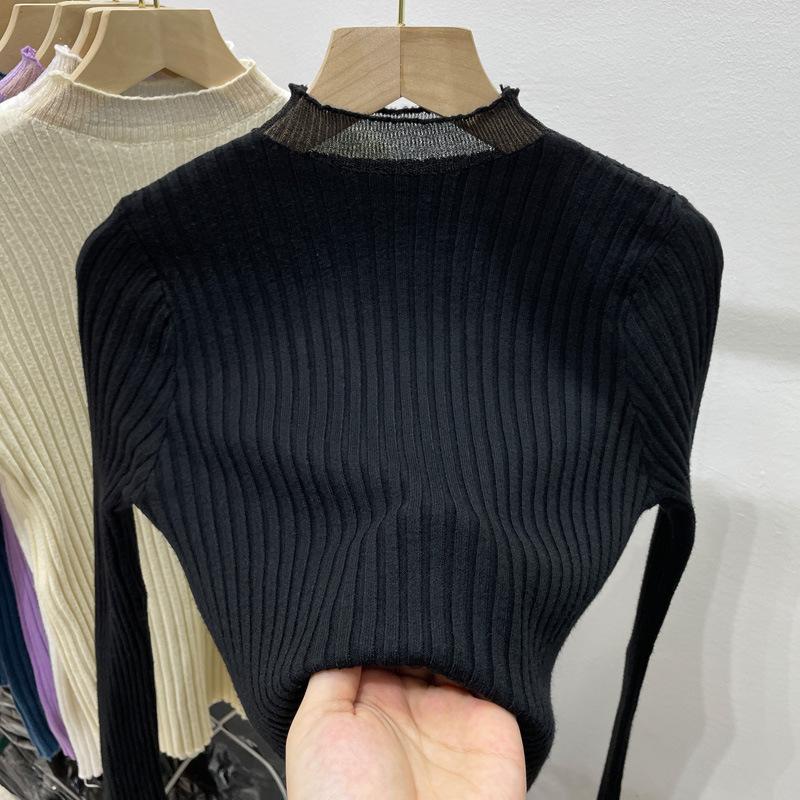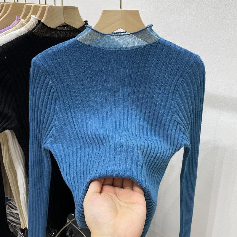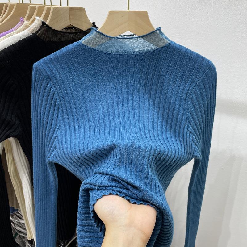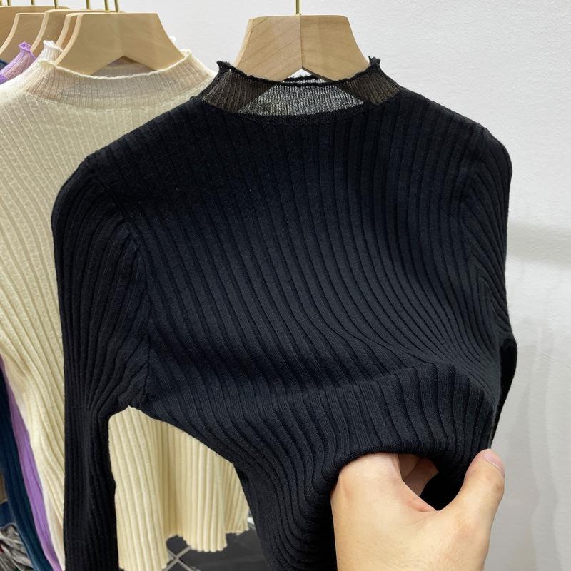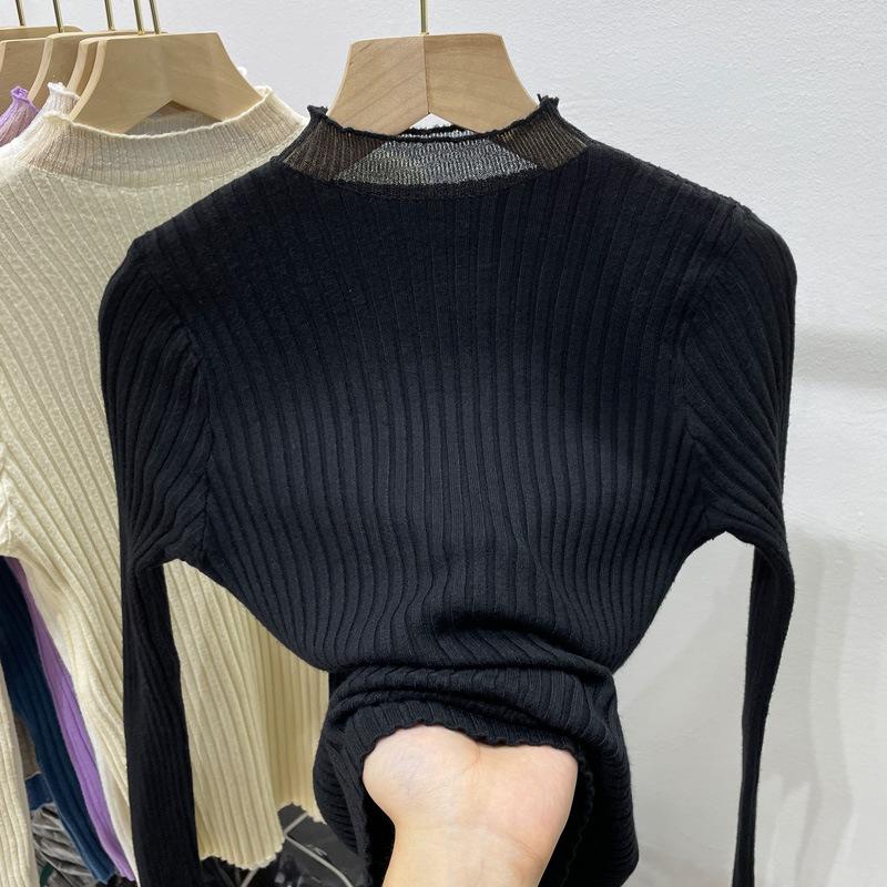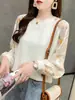 Camisa de punto de manga larga para mujer, nueva camisa de punto con diseño de encaje y costuras, estilo occidental, con mangas abullonadas, para primavera y otoño