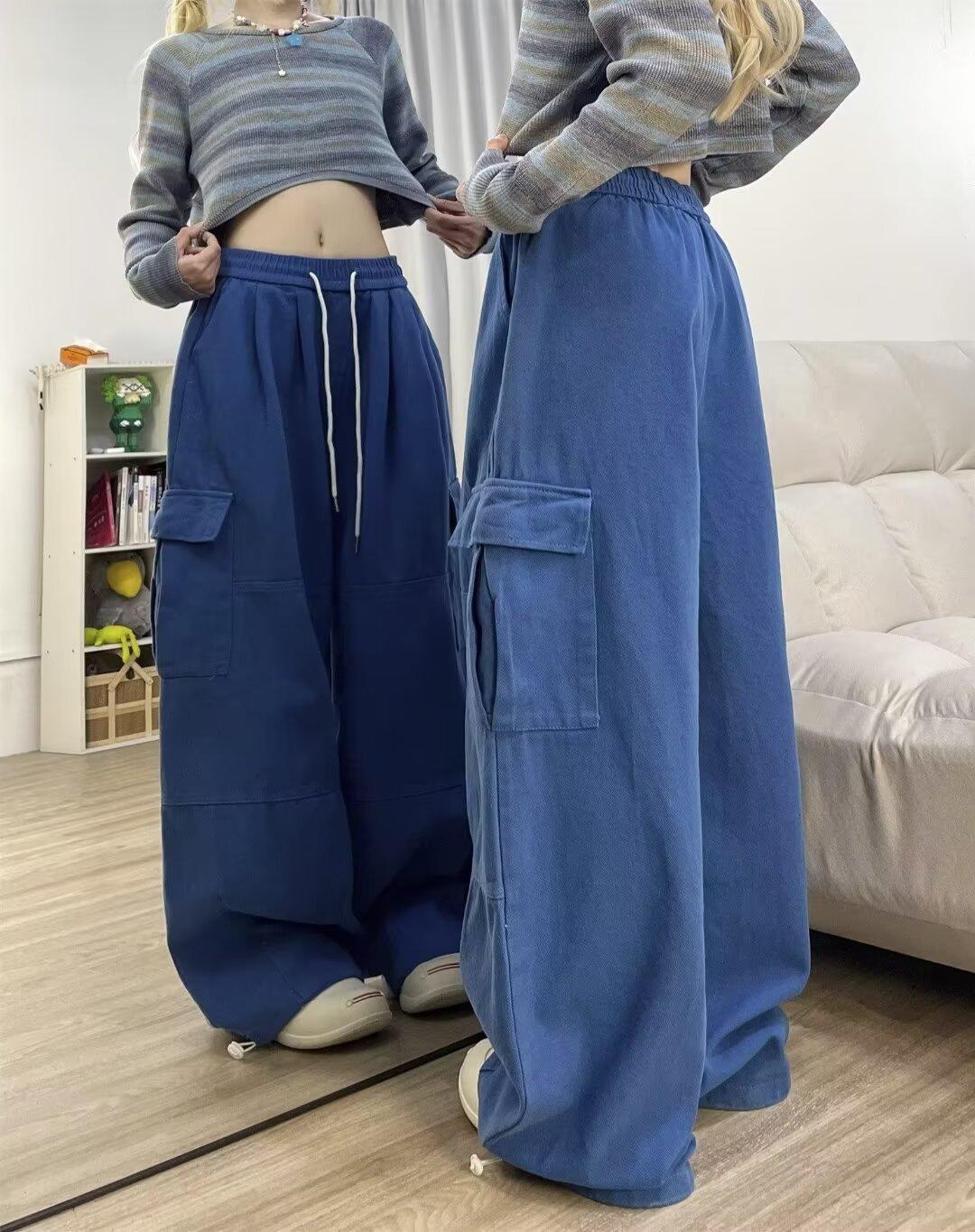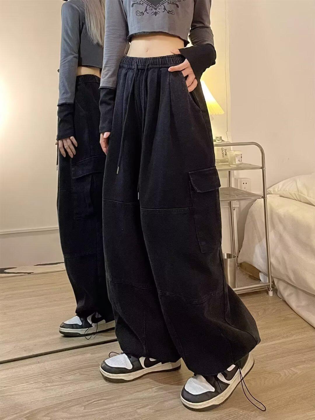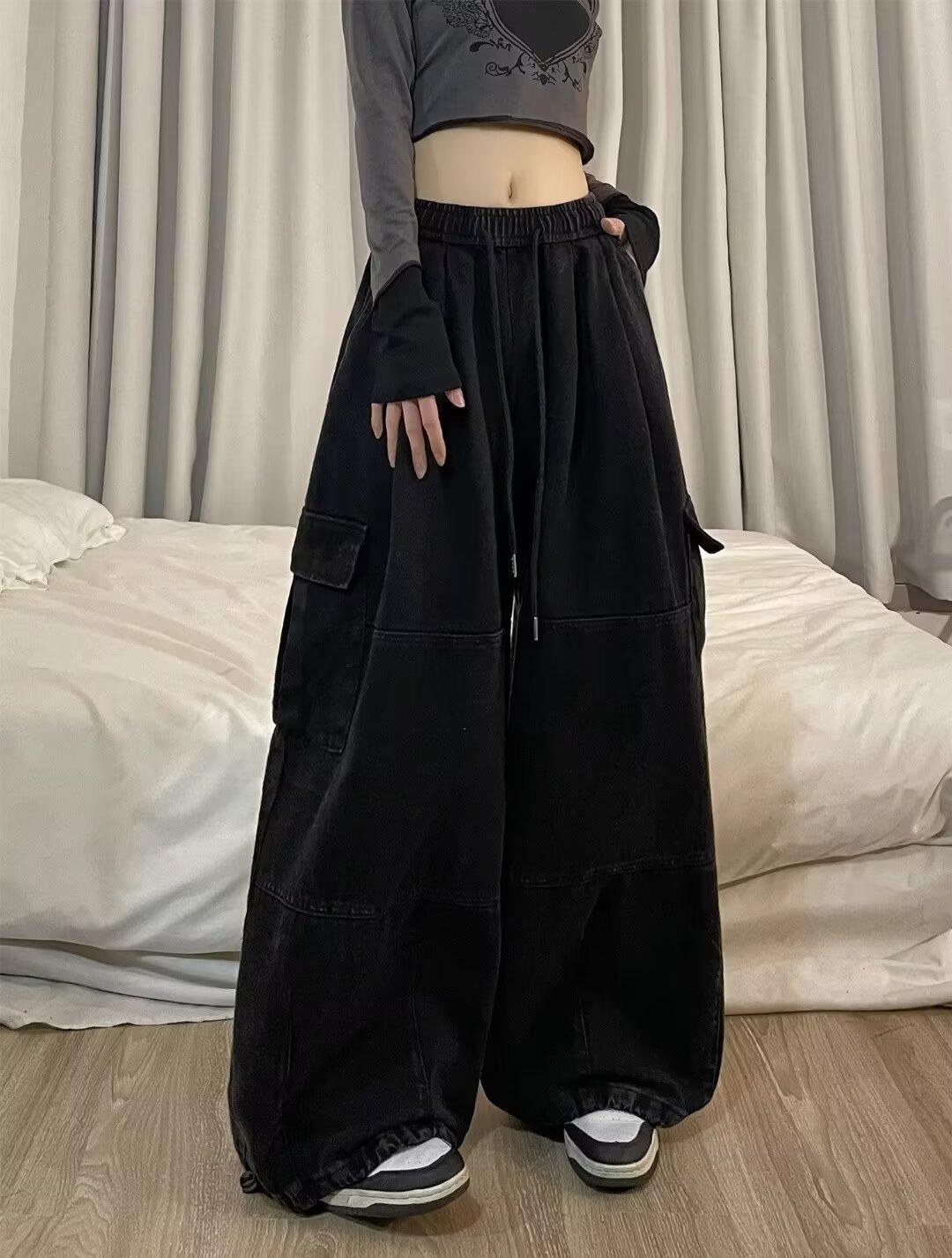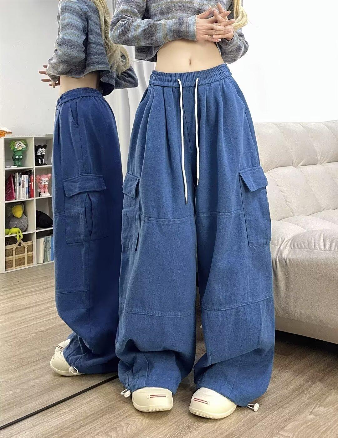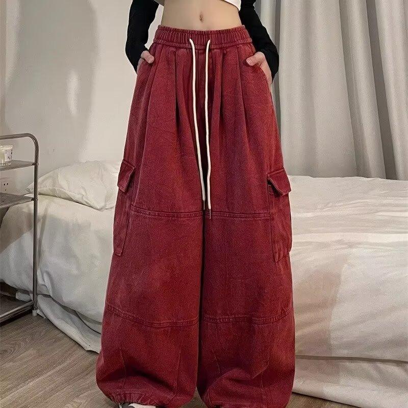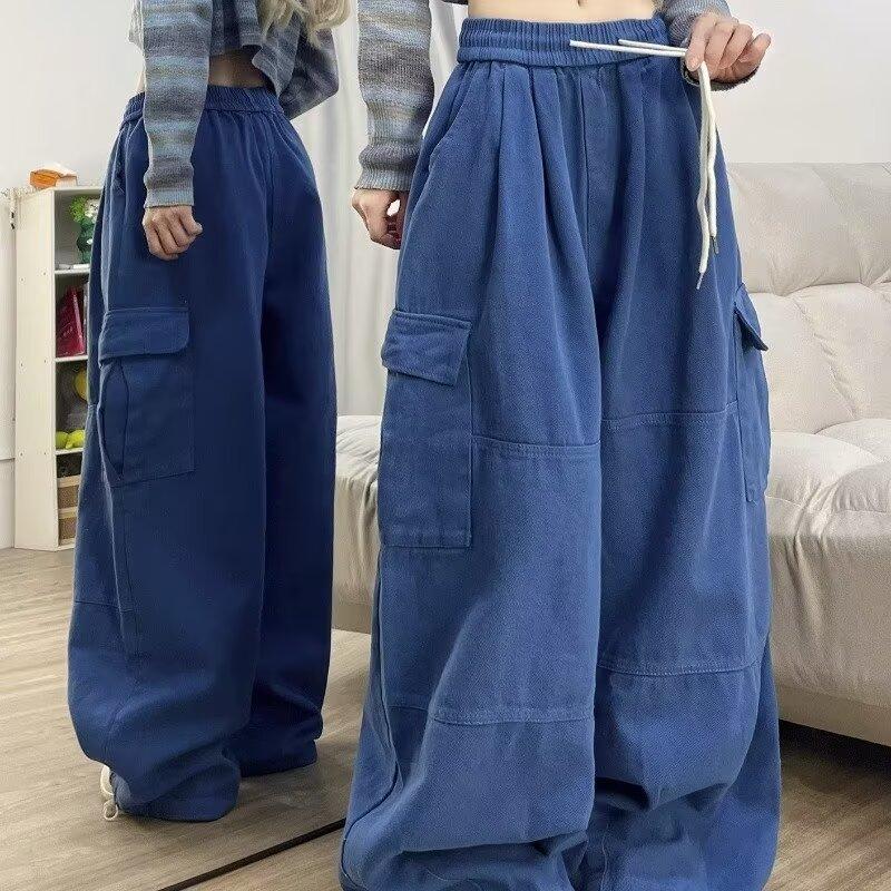 Pantalones vaqueros de trabajo lavados con múltiples bolsillos, estilo americano, estilo urbano, para mujer, de marca moderna, de cintura alta, holgados, adelgazantes y con pierna ancha.