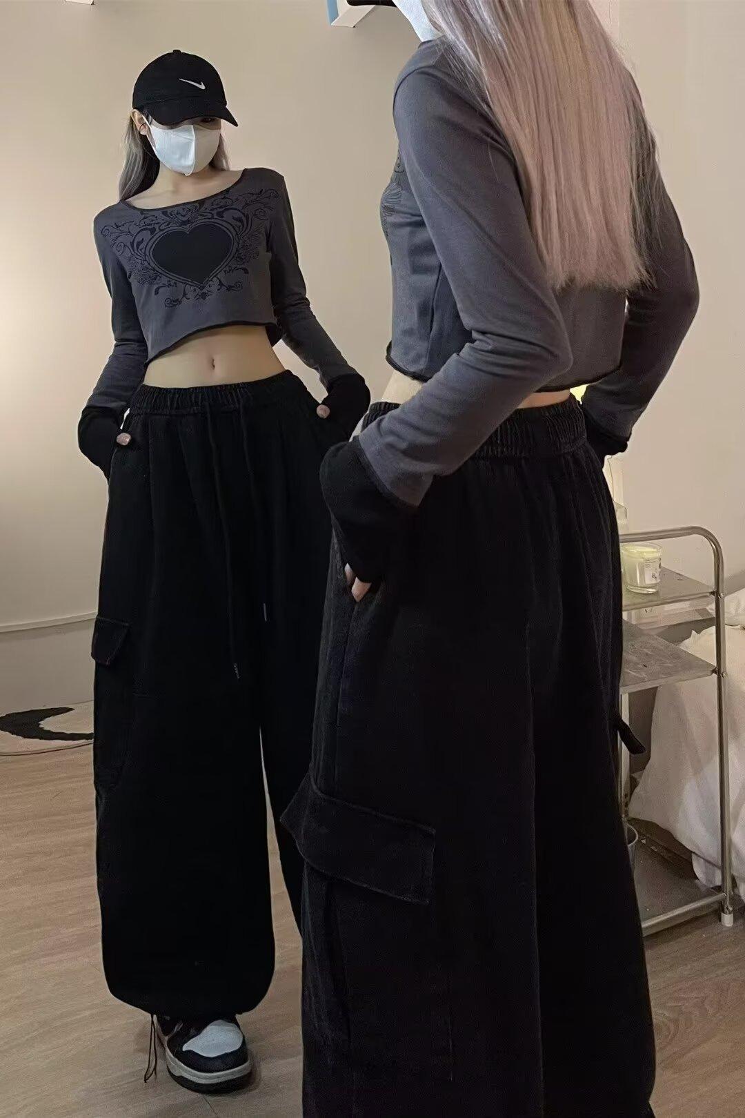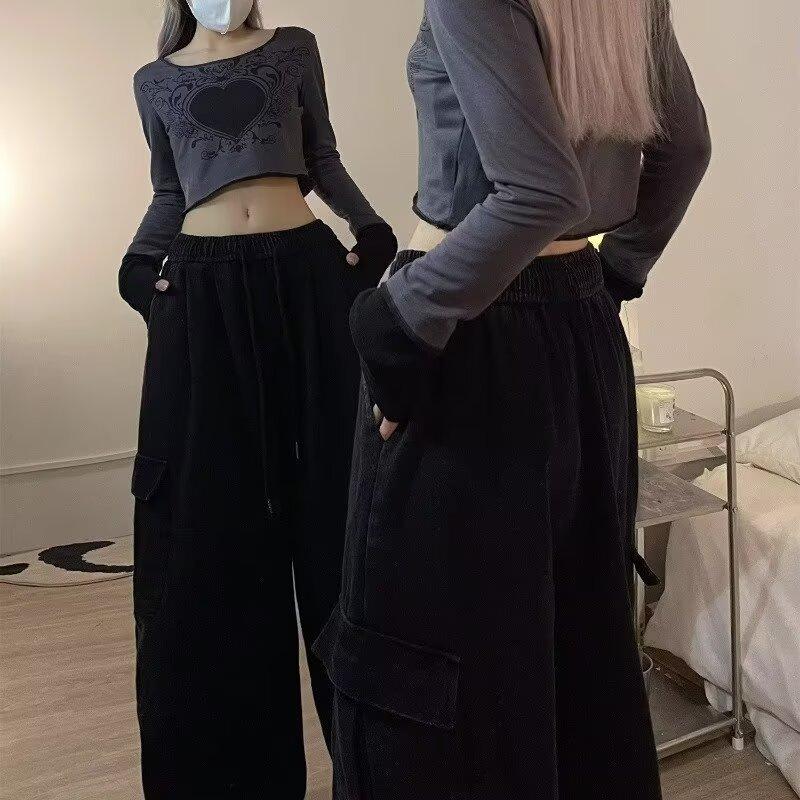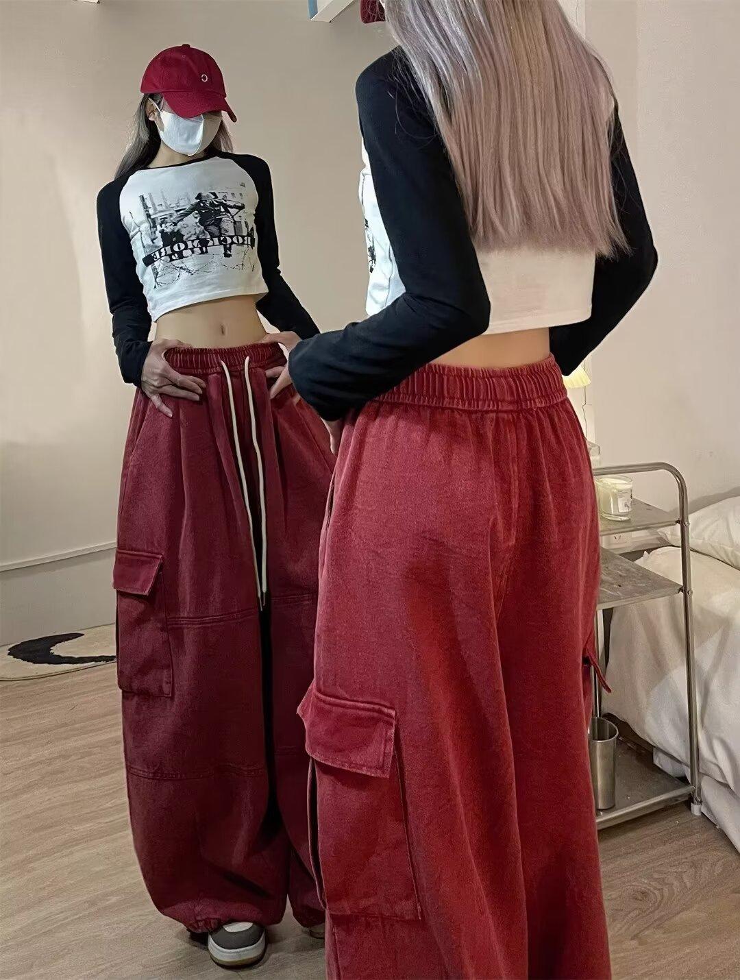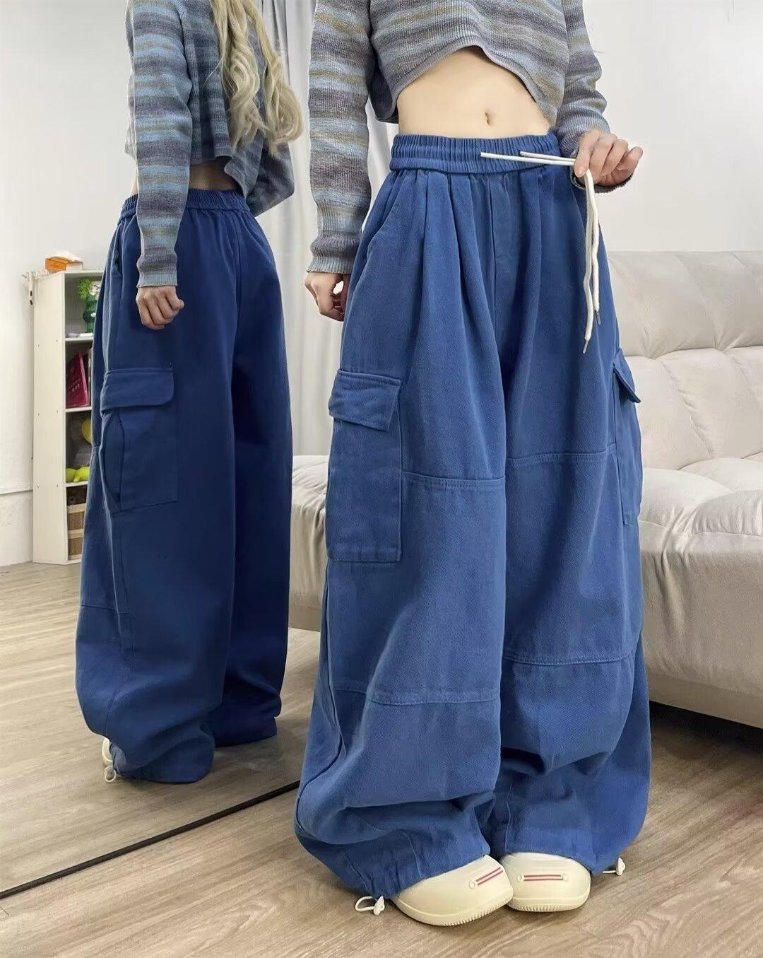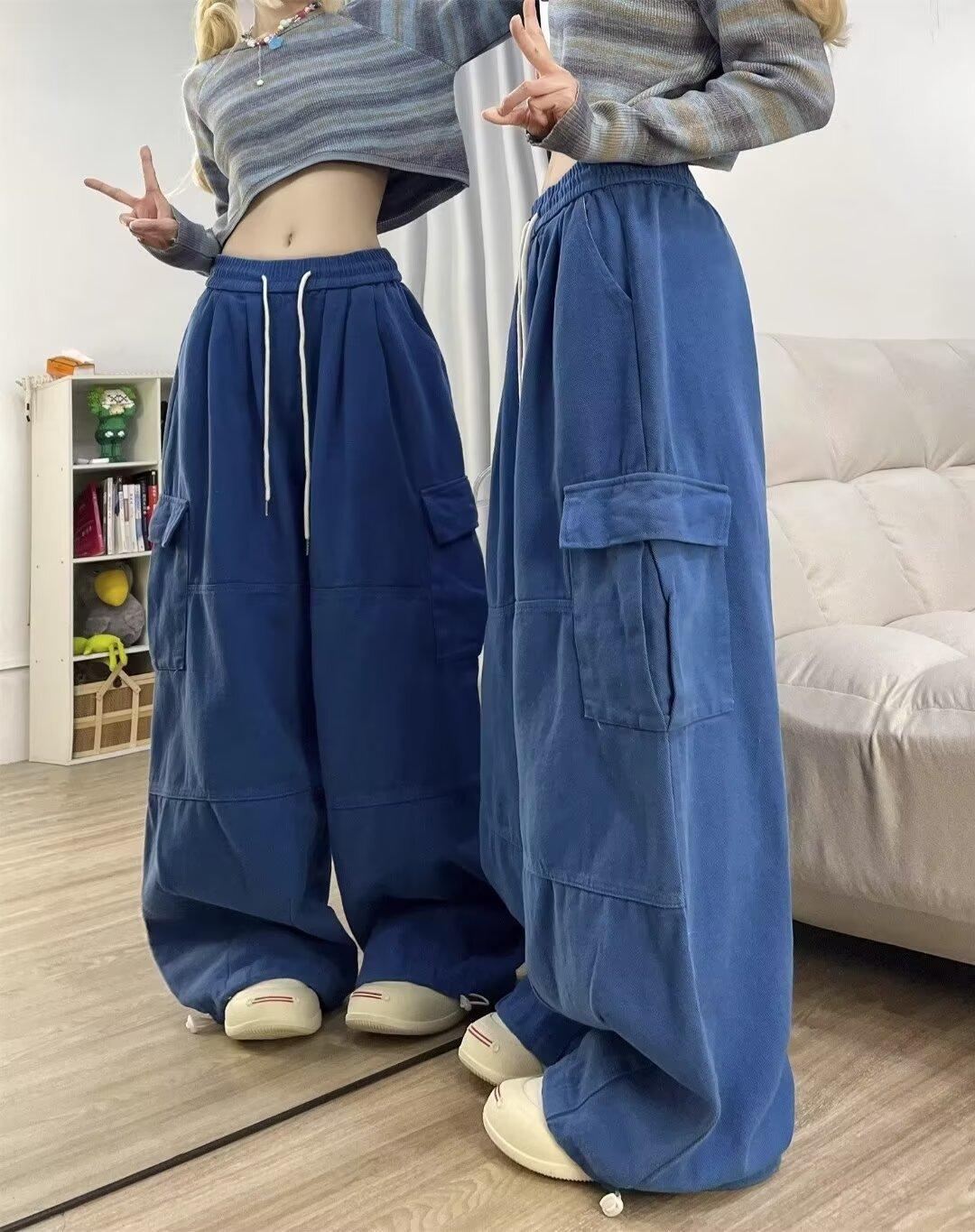 Pantalones vaqueros de trabajo lavados con múltiples bolsillos, estilo americano, estilo urbano, para mujer, de marca moderna, de cintura alta, holgados, adelgazantes y con pierna ancha.