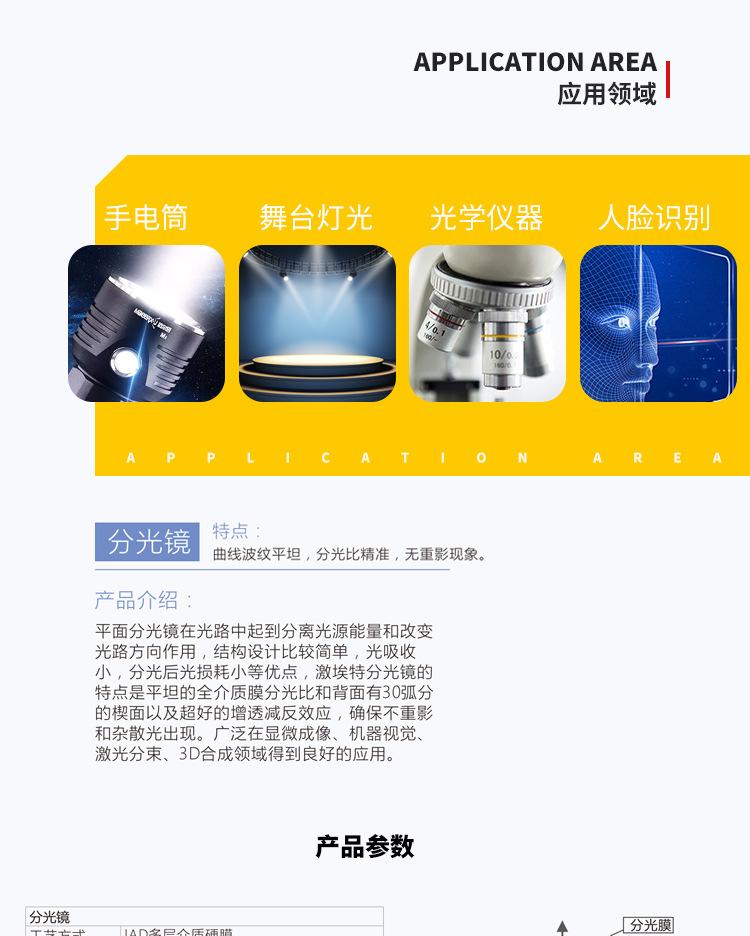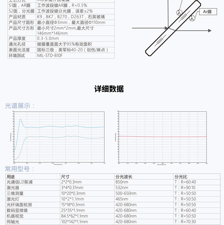 Banda de luz visible: división 400~700nm, relación de división T:R=50:50, T:R=70:30 (según las necesidades del cliente)