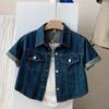 Verano Estilo Coreano Chic Estilo Retro Hong Kong Abrigo Camisa de Mezclilla Corta Casual Holgada de Manga Corta para Mujeres Pequeñas