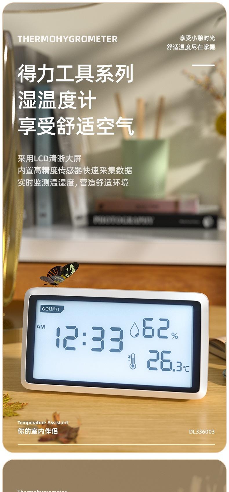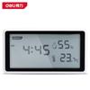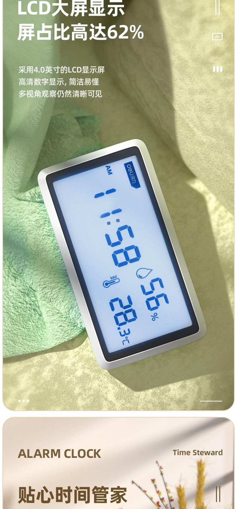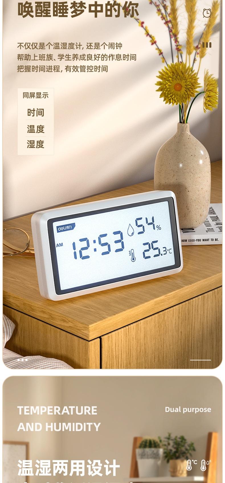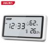 Medidor de temperatura y humedad Deli DL336001/2/3 con pantalla LCD digital, reloj despertador, pantalla grande para interiores, humedad seca
