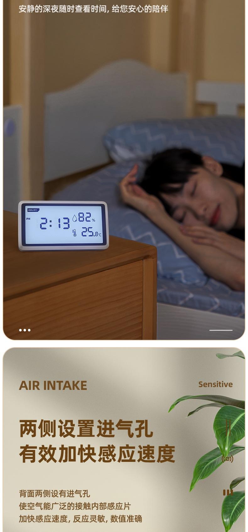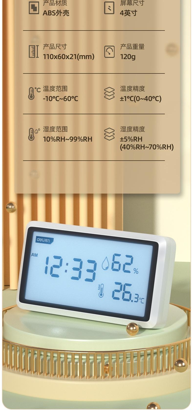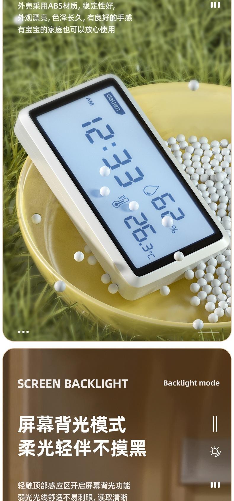 Medidor de temperatura y humedad Deli DL336001/2/3 con pantalla LCD digital, reloj despertador, pantalla grande para interiores, humedad seca