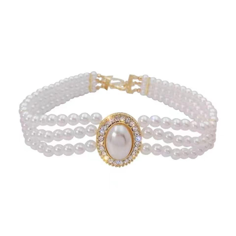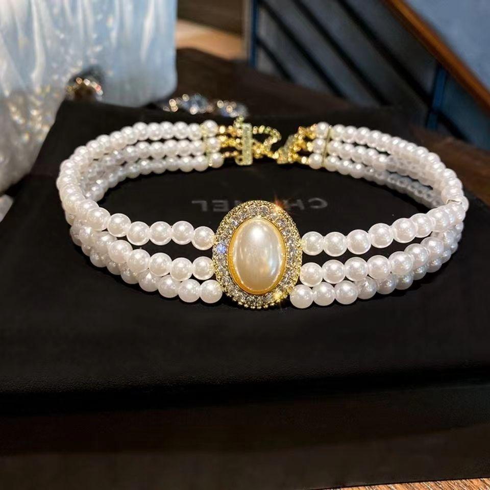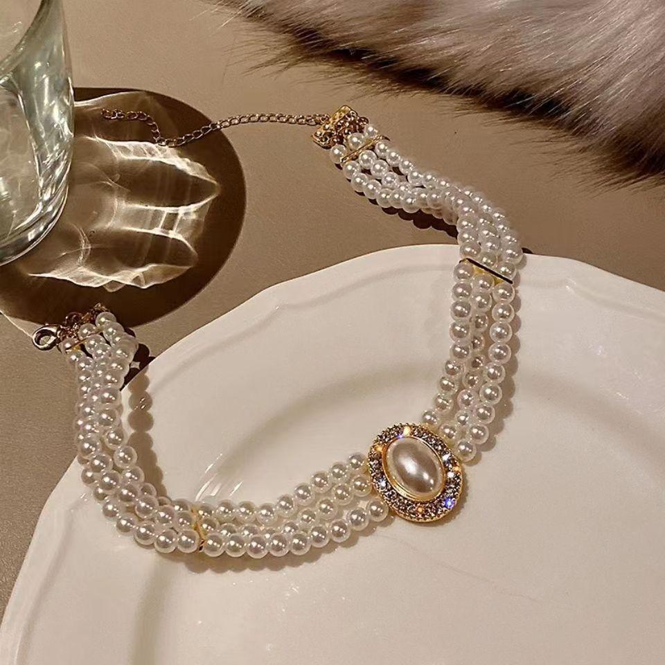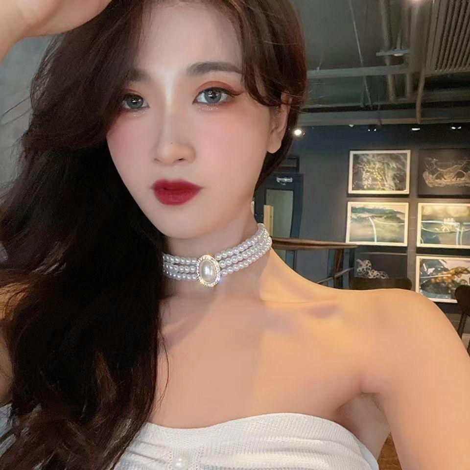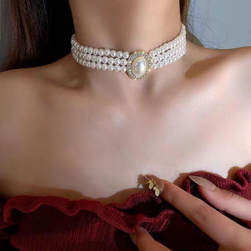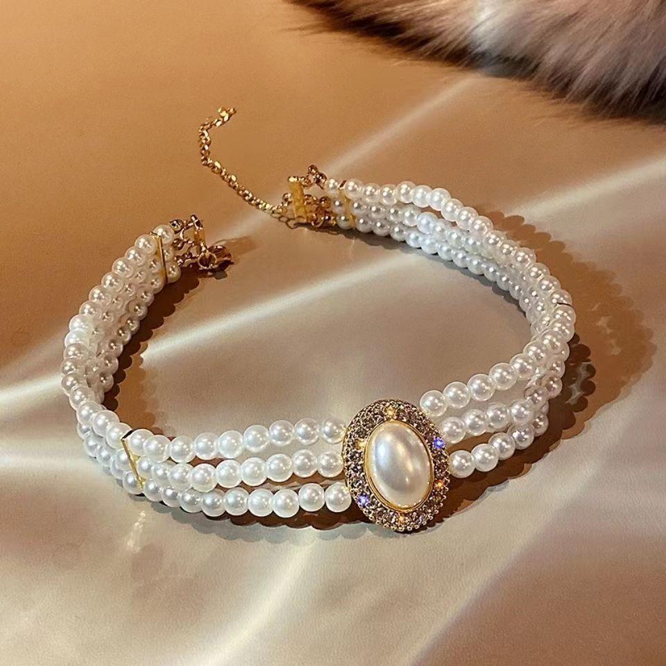 Collar corto de perlas y diamantes multicapa de estilo coreano, estilo retro, ligero, de lujo, de alta gama, elegante y sencillo, con cadena de clavícula.