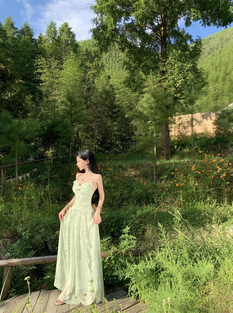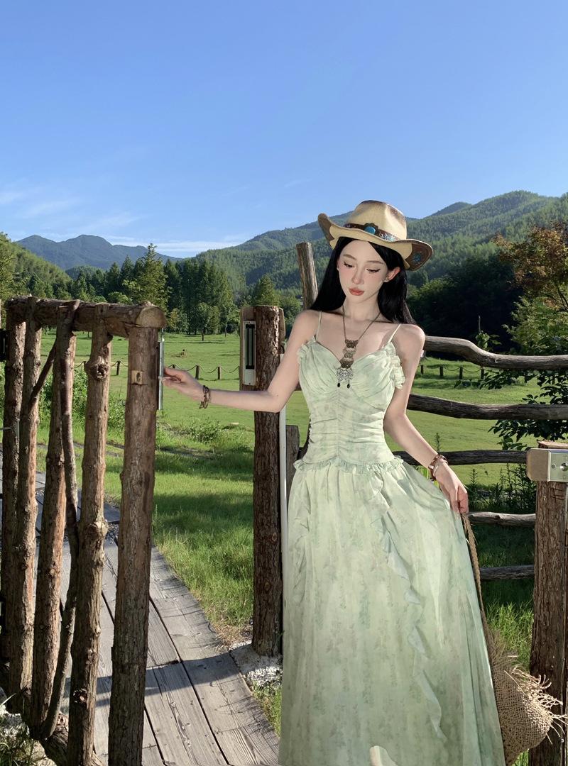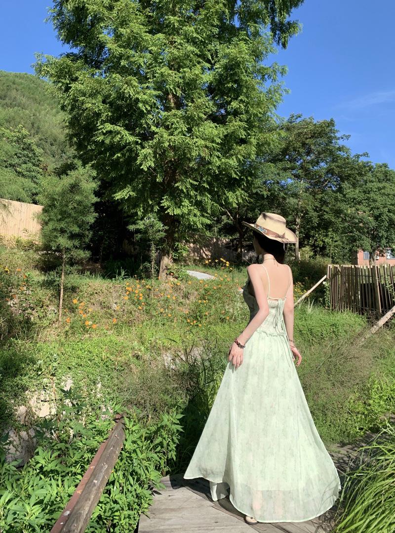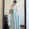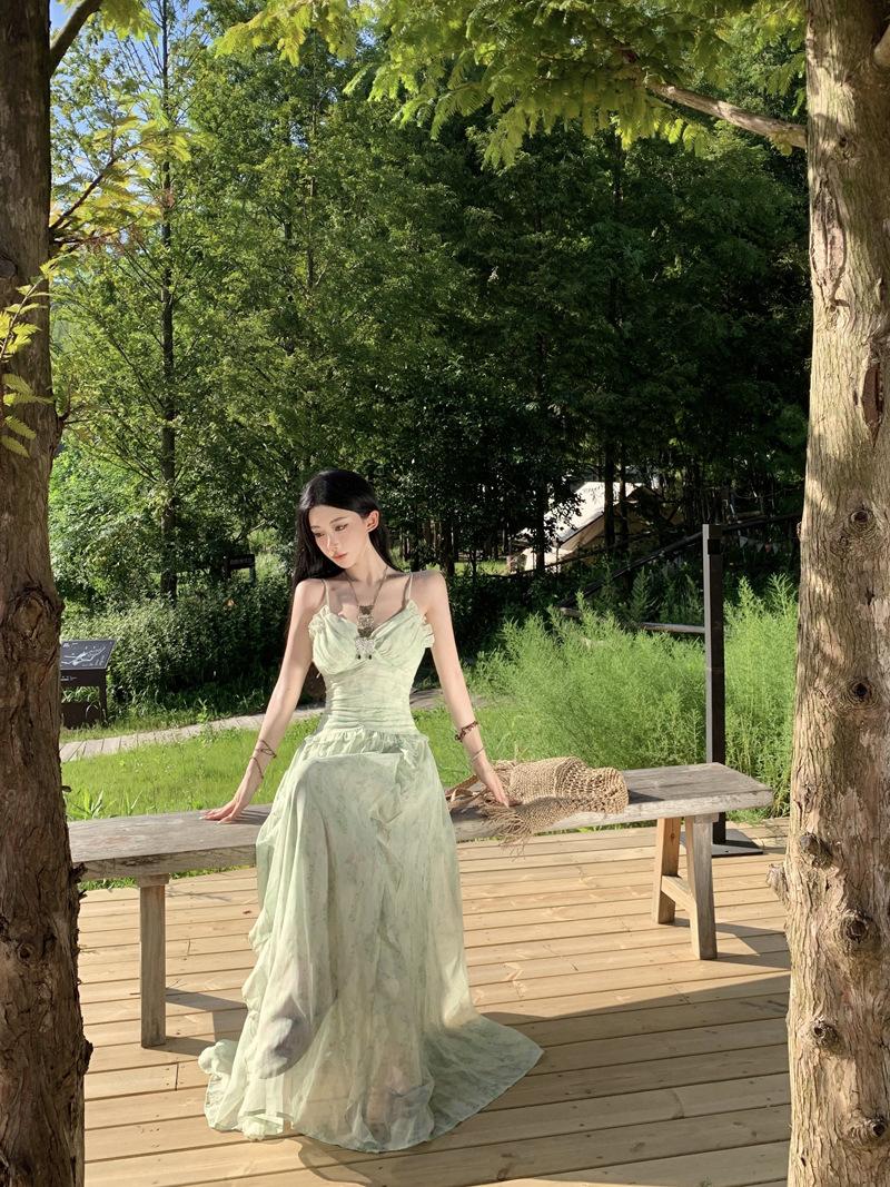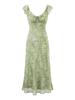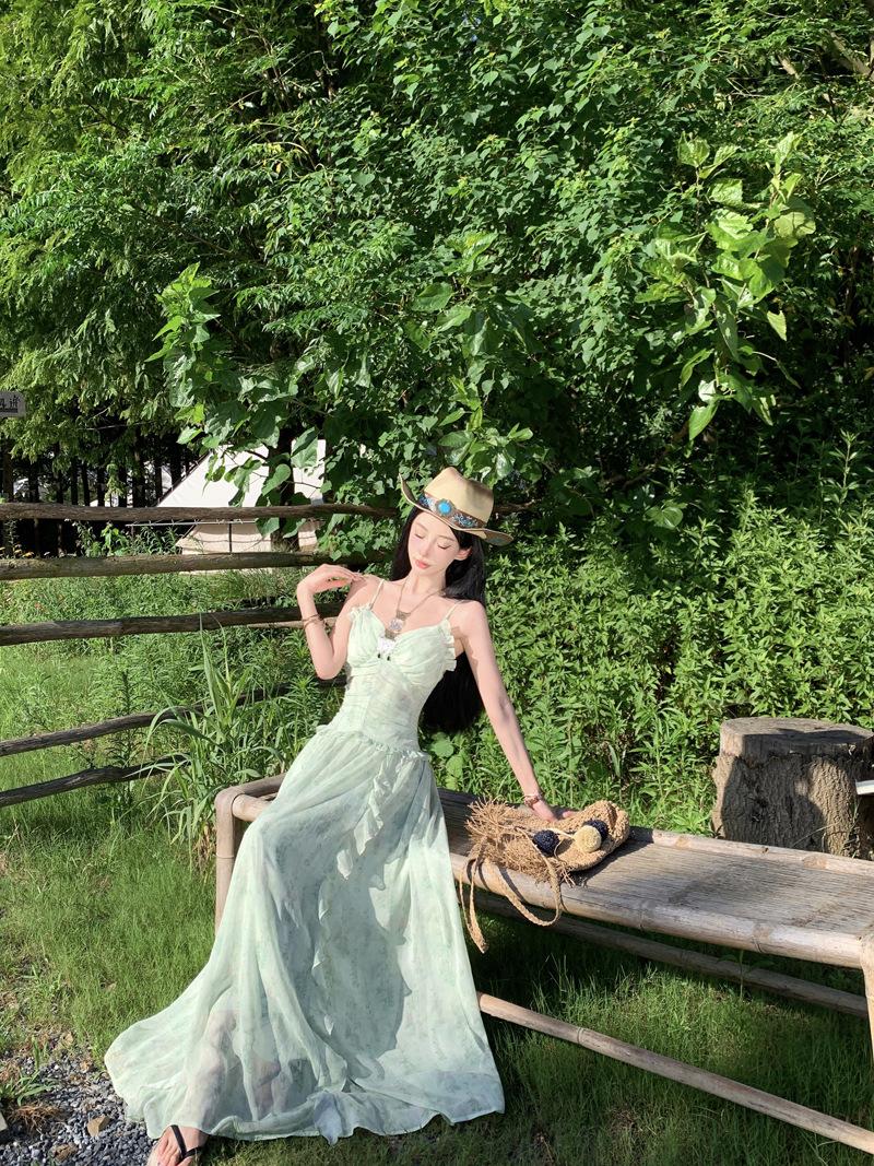 Vestido largo elegante de verano con diseño de hada y cintura con volantes en verde menta con estampado floral estilo vacaciones francés para mujer