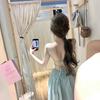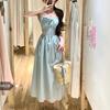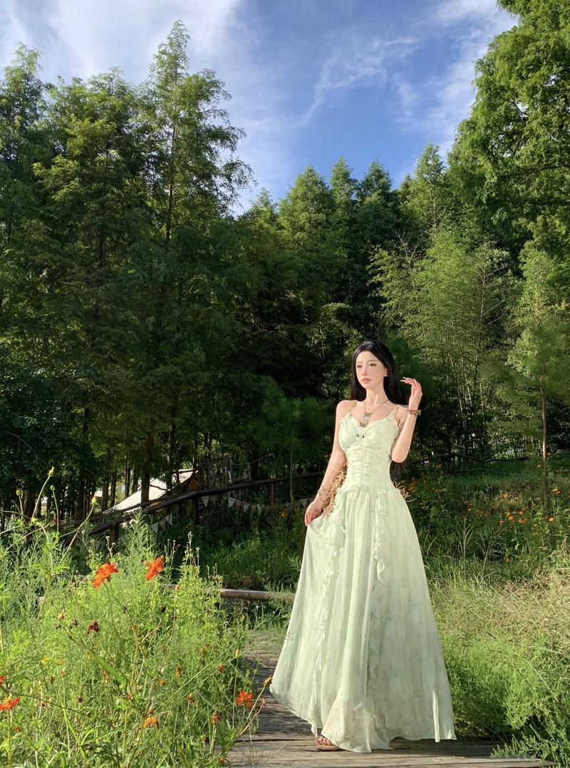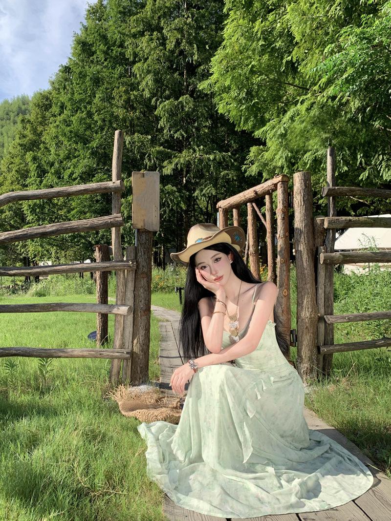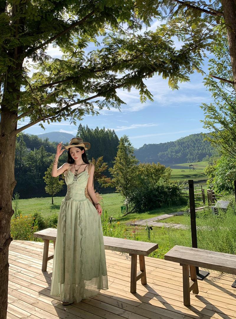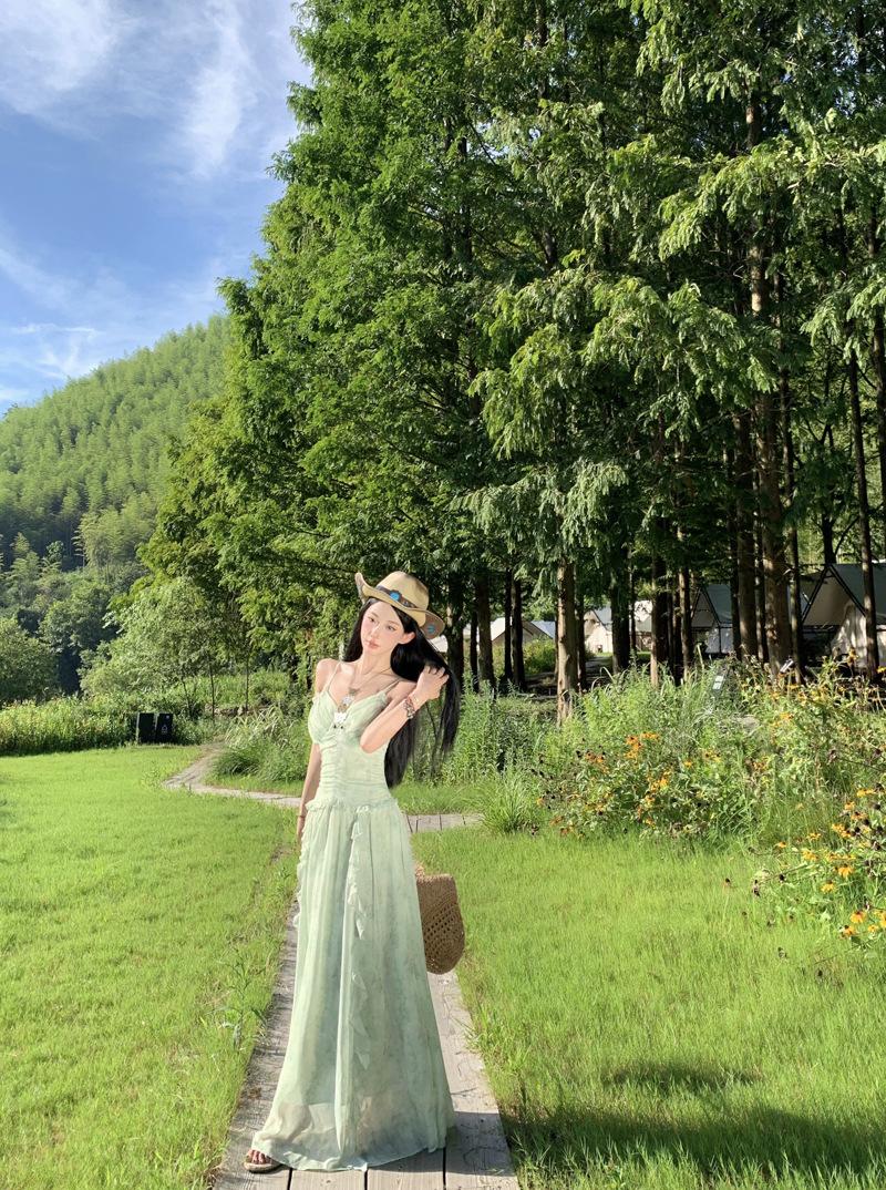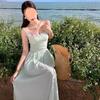 Vestido largo elegante de verano con diseño de hada y cintura con volantes en verde menta con estampado floral estilo vacaciones francés para mujer