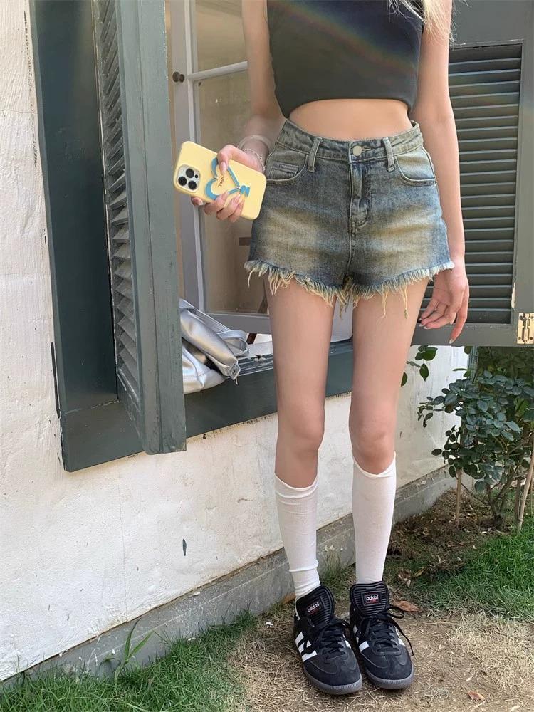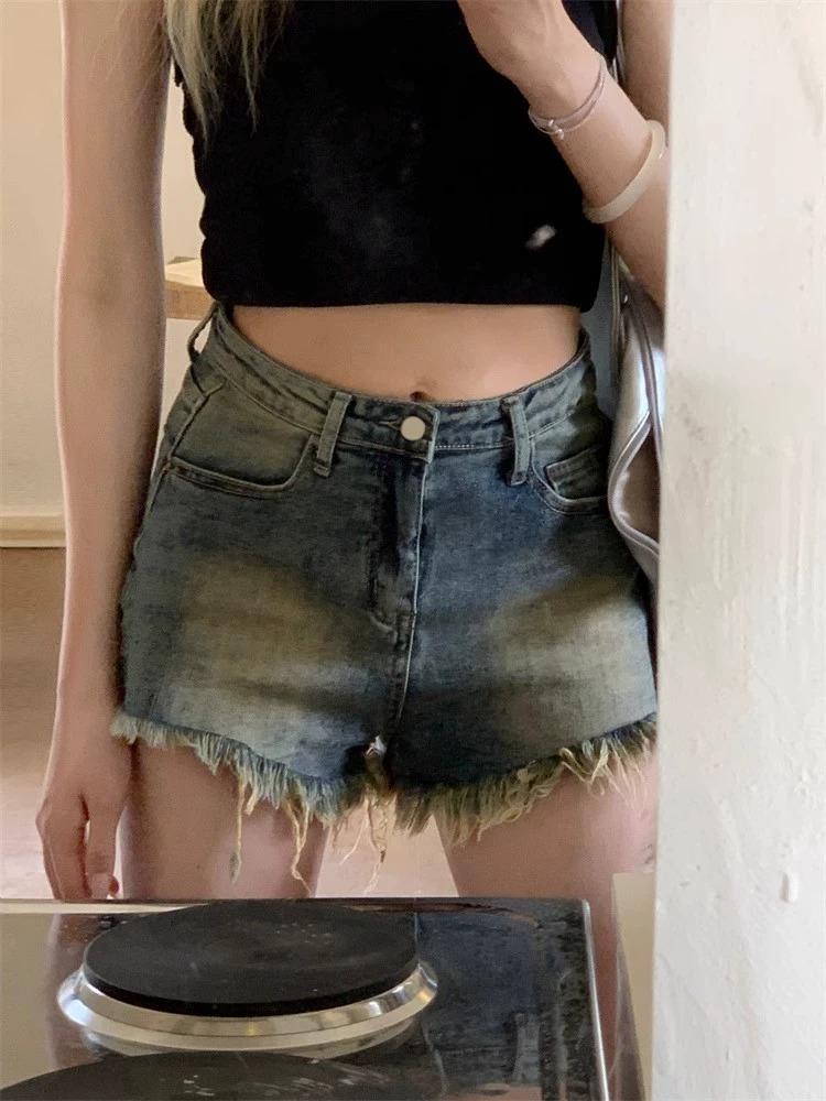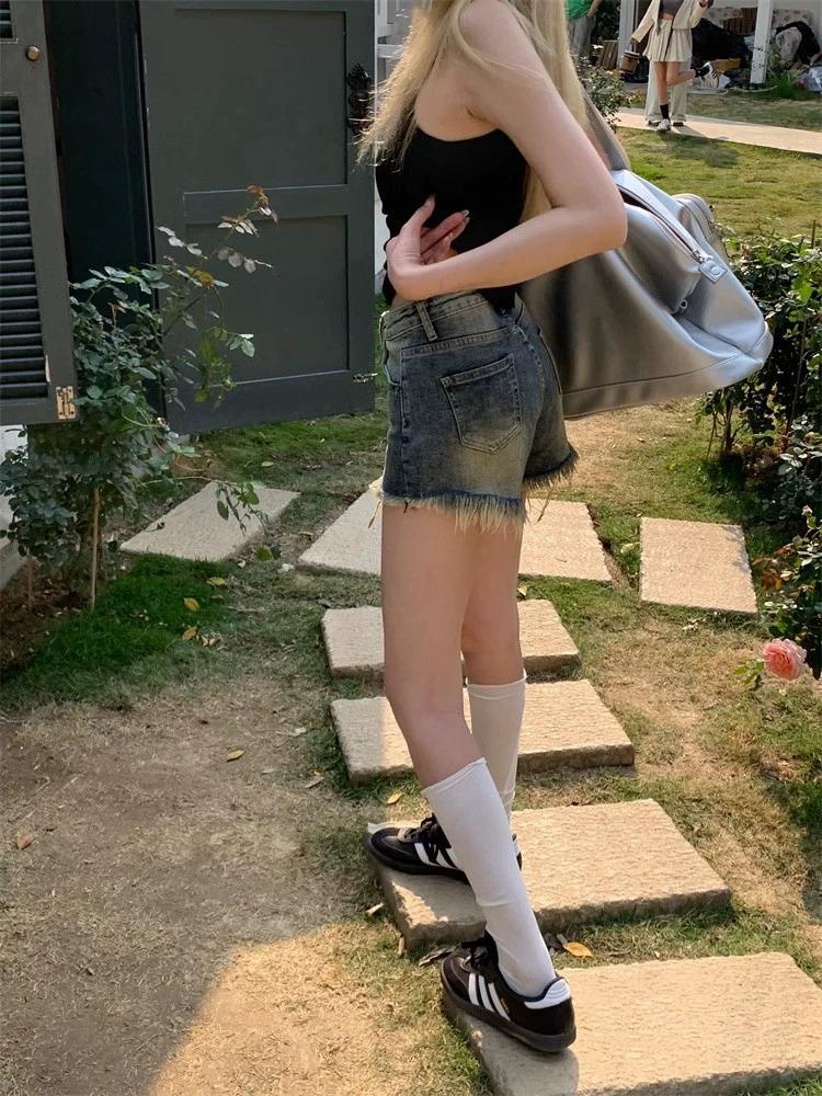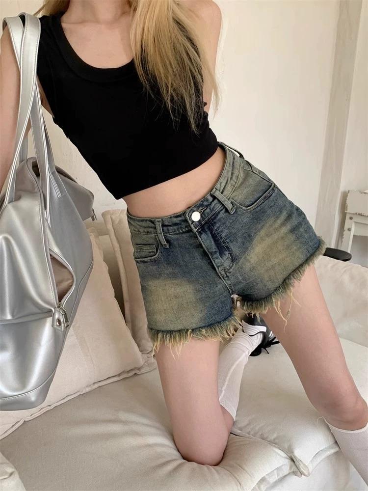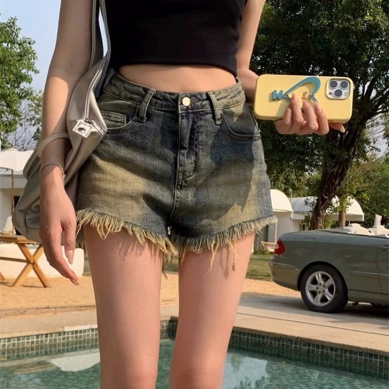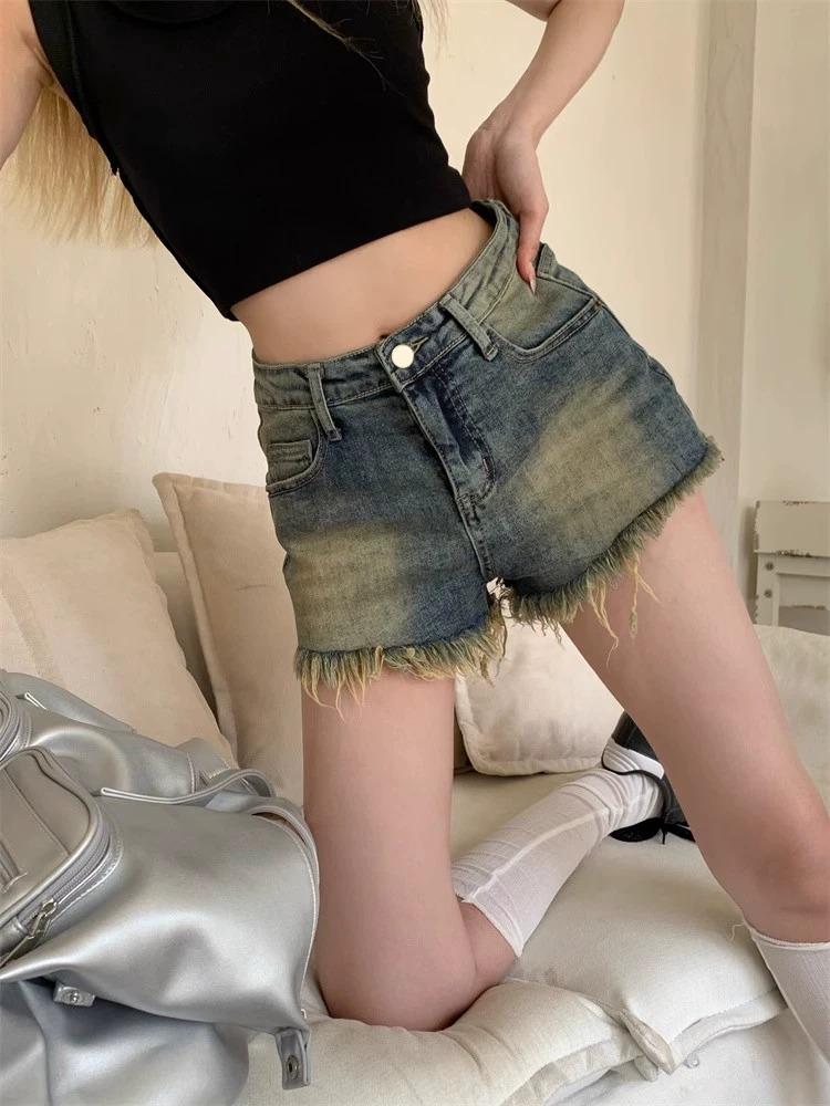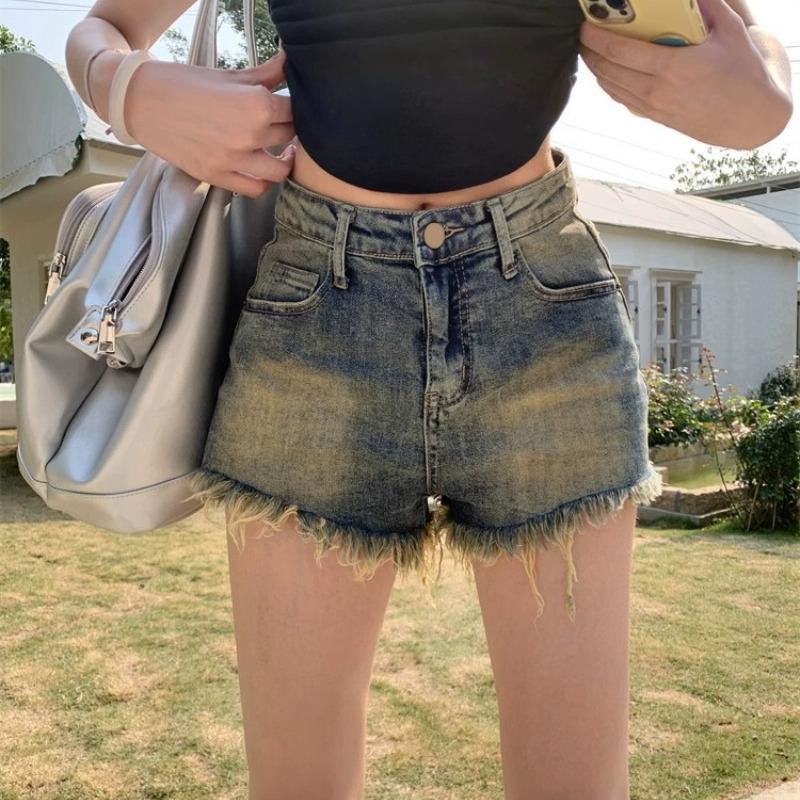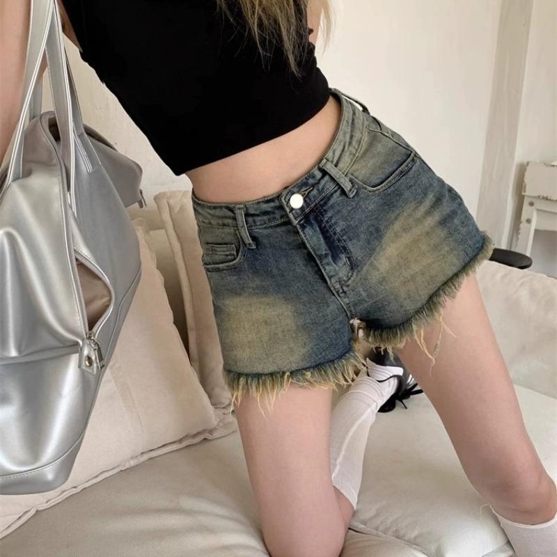 Jeans Retro Rapped para Mujer Pumpty Ins Pantalones Cortos Calientes A-line Pantalones Cortos Estilo Americano Chica Caliente Cintura Alta Rectos Pierna Ancha