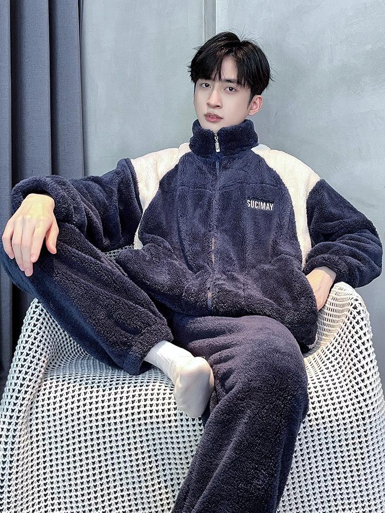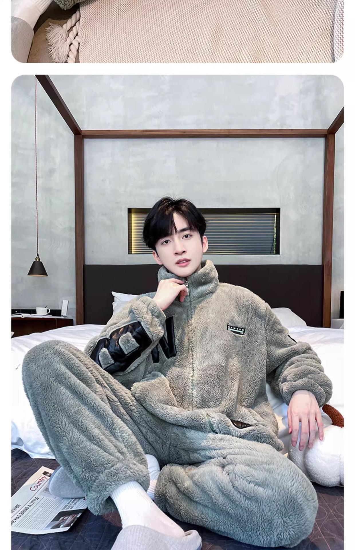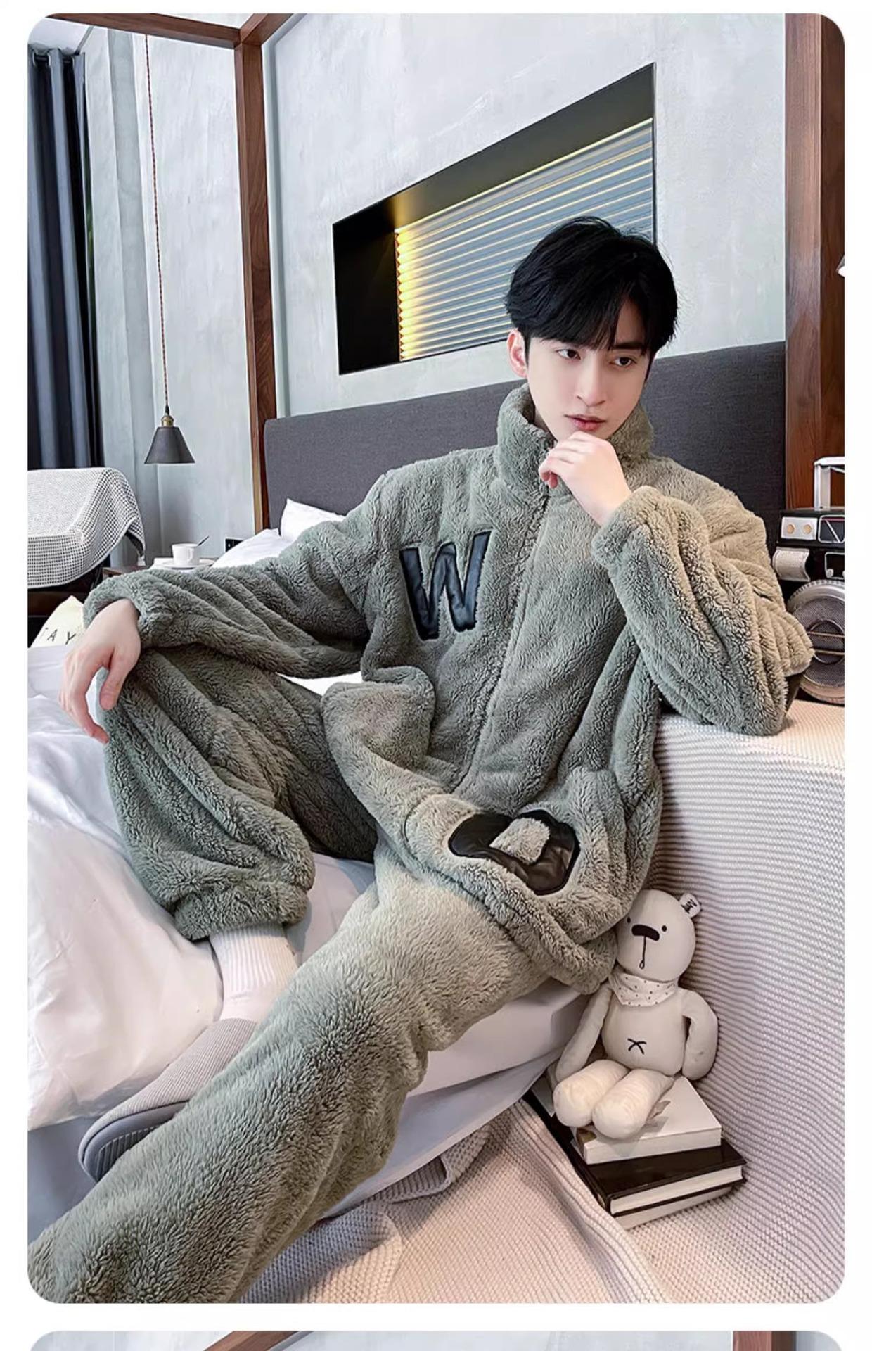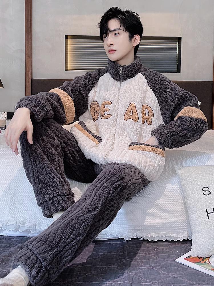 Pijama nuevo para hombre, de invierno, de franela polar coral con cremallera, forro polar grueso, ropa de casa, traje de talla grande