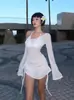 Estilo europeo y americano 2025 otoño nuevo falda corta de mujer sexy moda cuello redondo parche de malla fruncido vestido de manga larga