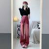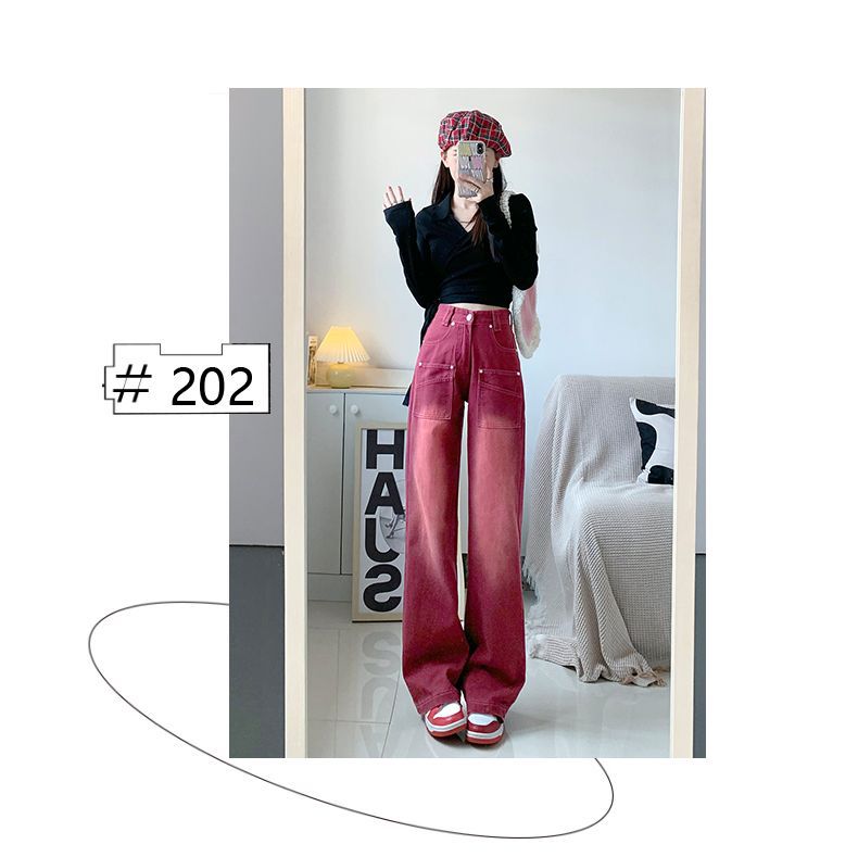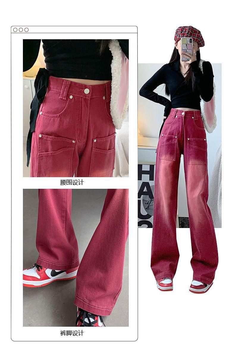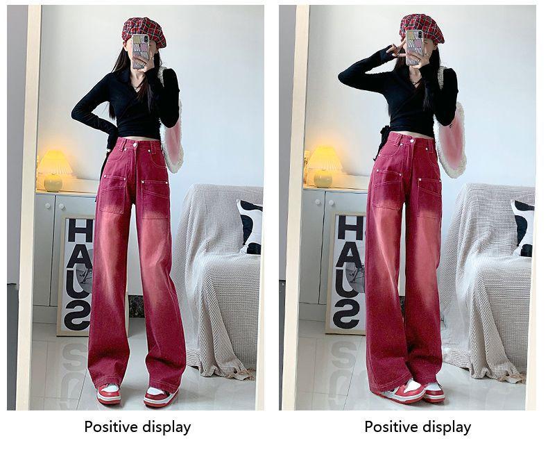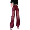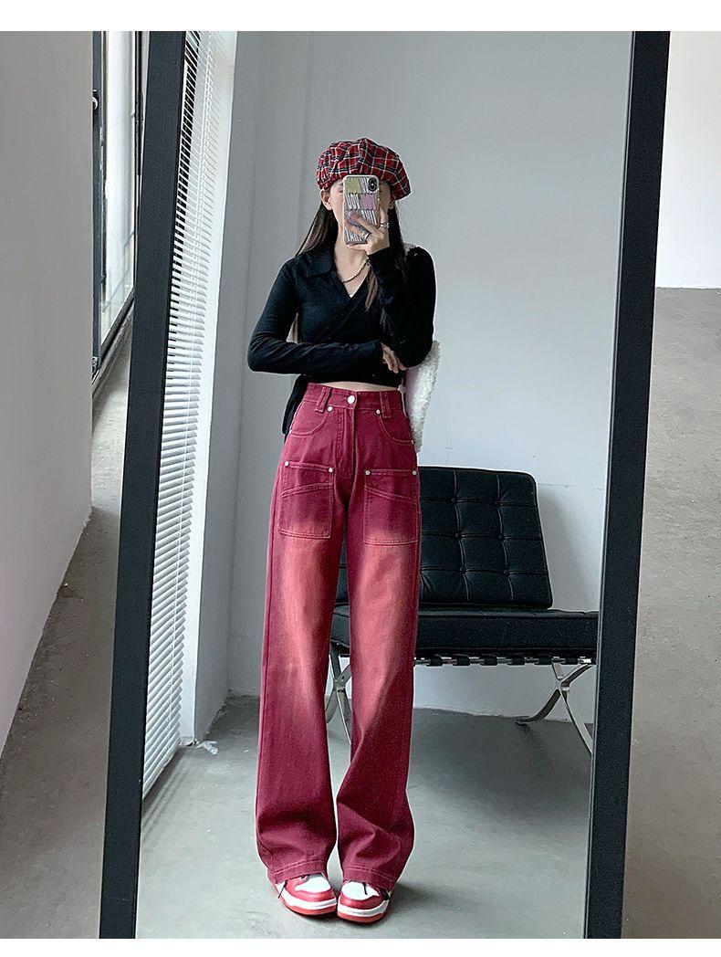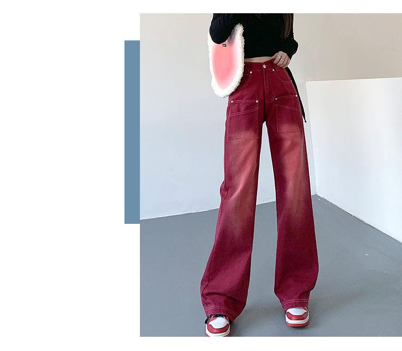 Vaqueros rectos de cintura alta estilo americano de color rojo vino para mujer, diseño de bolsillo con costuras, pantalones de papá de pierna ancha adelgazantes retro para mujer