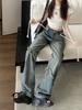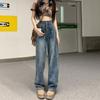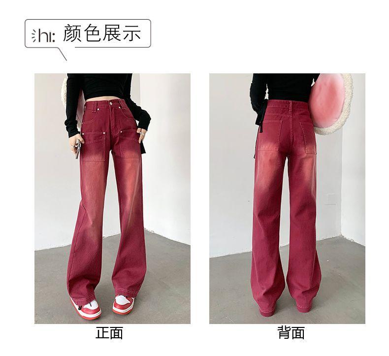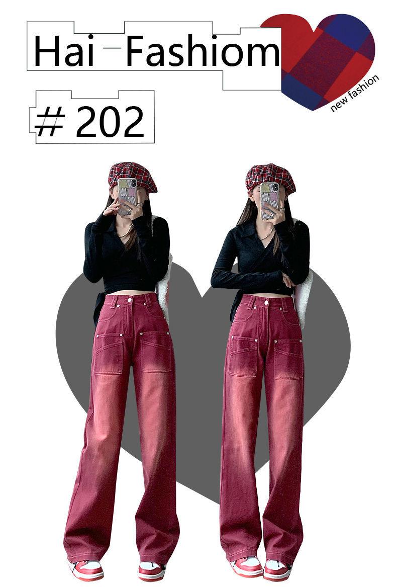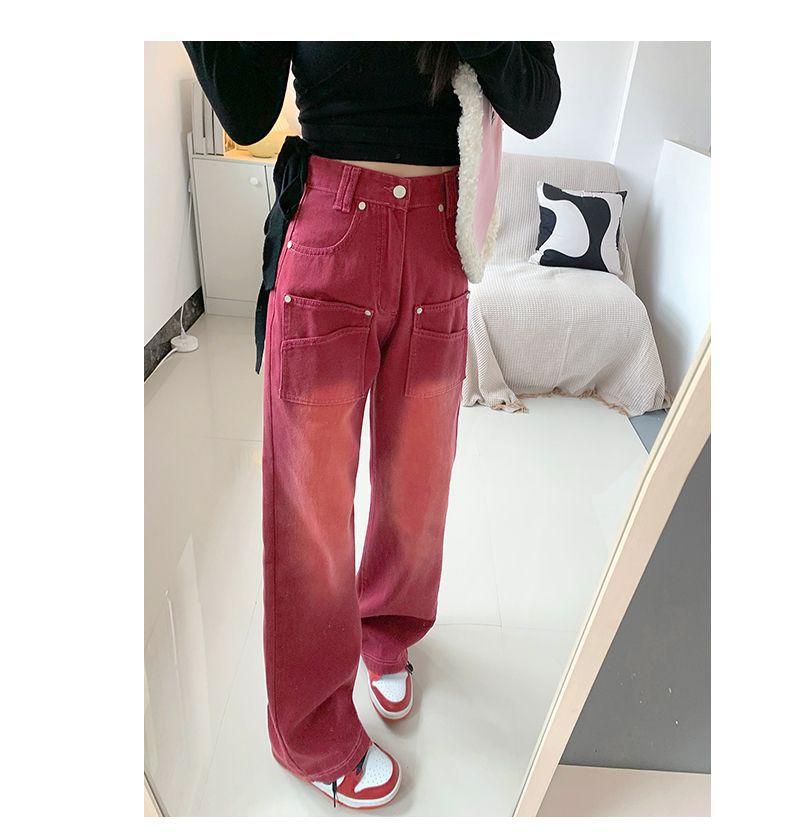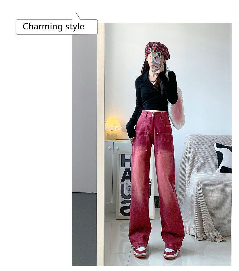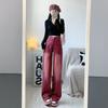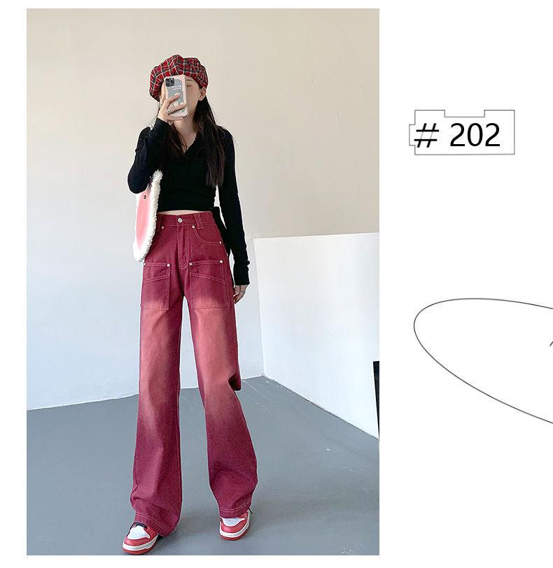 Vaqueros rectos de cintura alta estilo americano de color rojo vino para mujer, diseño de bolsillo con costuras, pantalones de papá de pierna ancha adelgazantes retro para mujer
