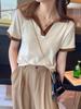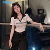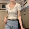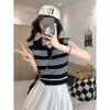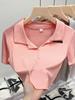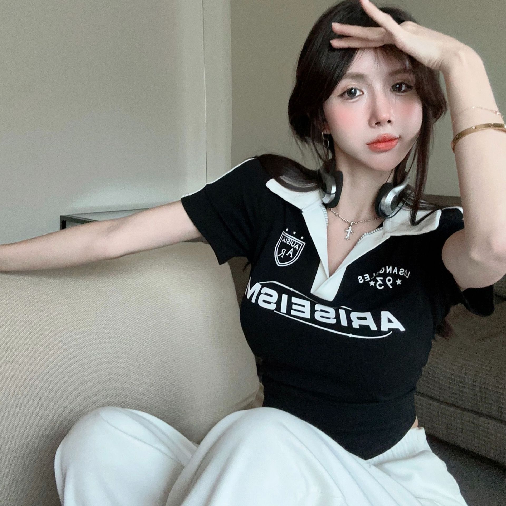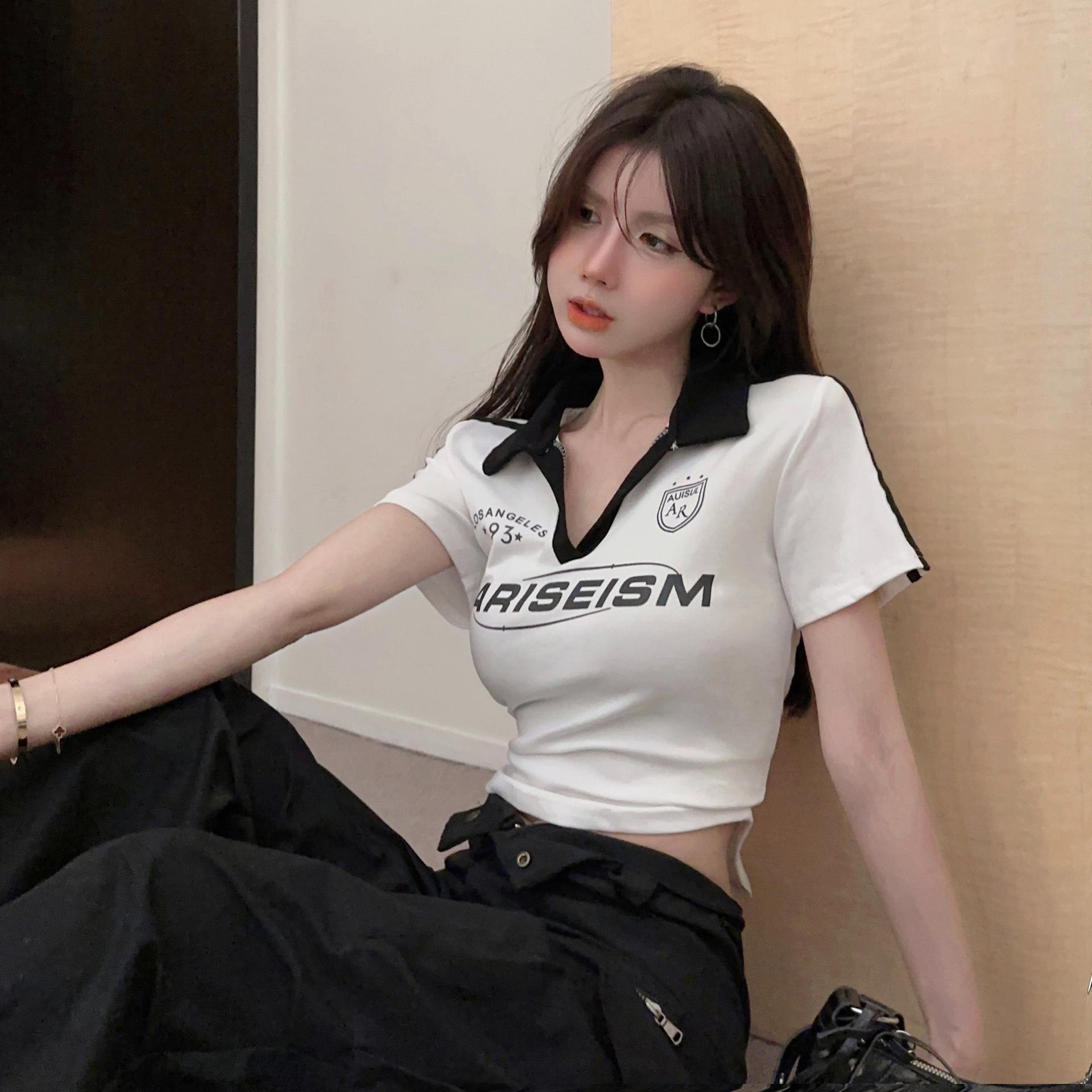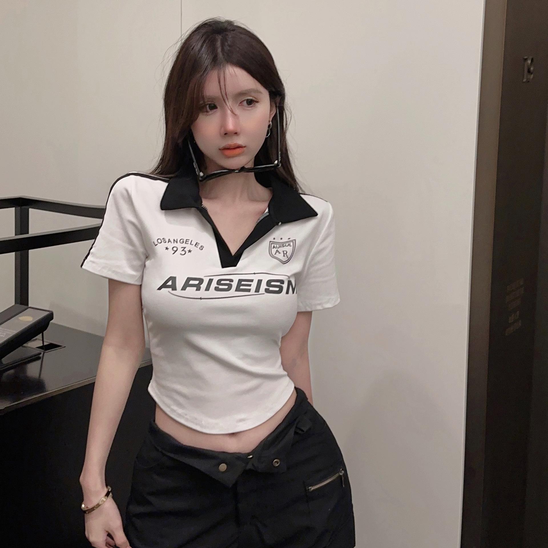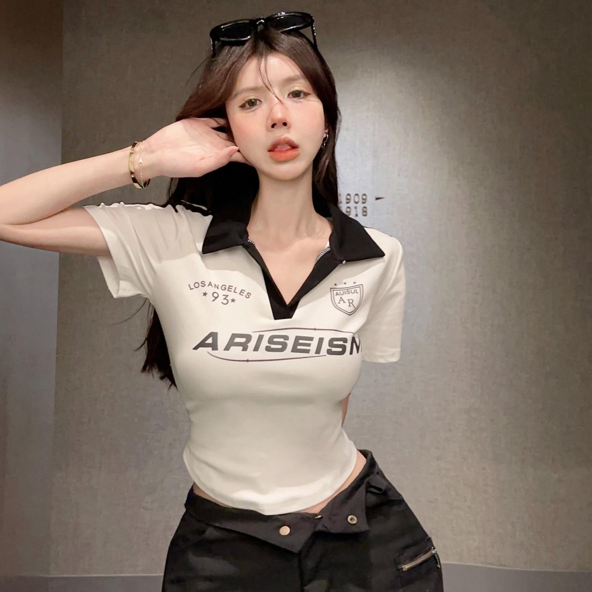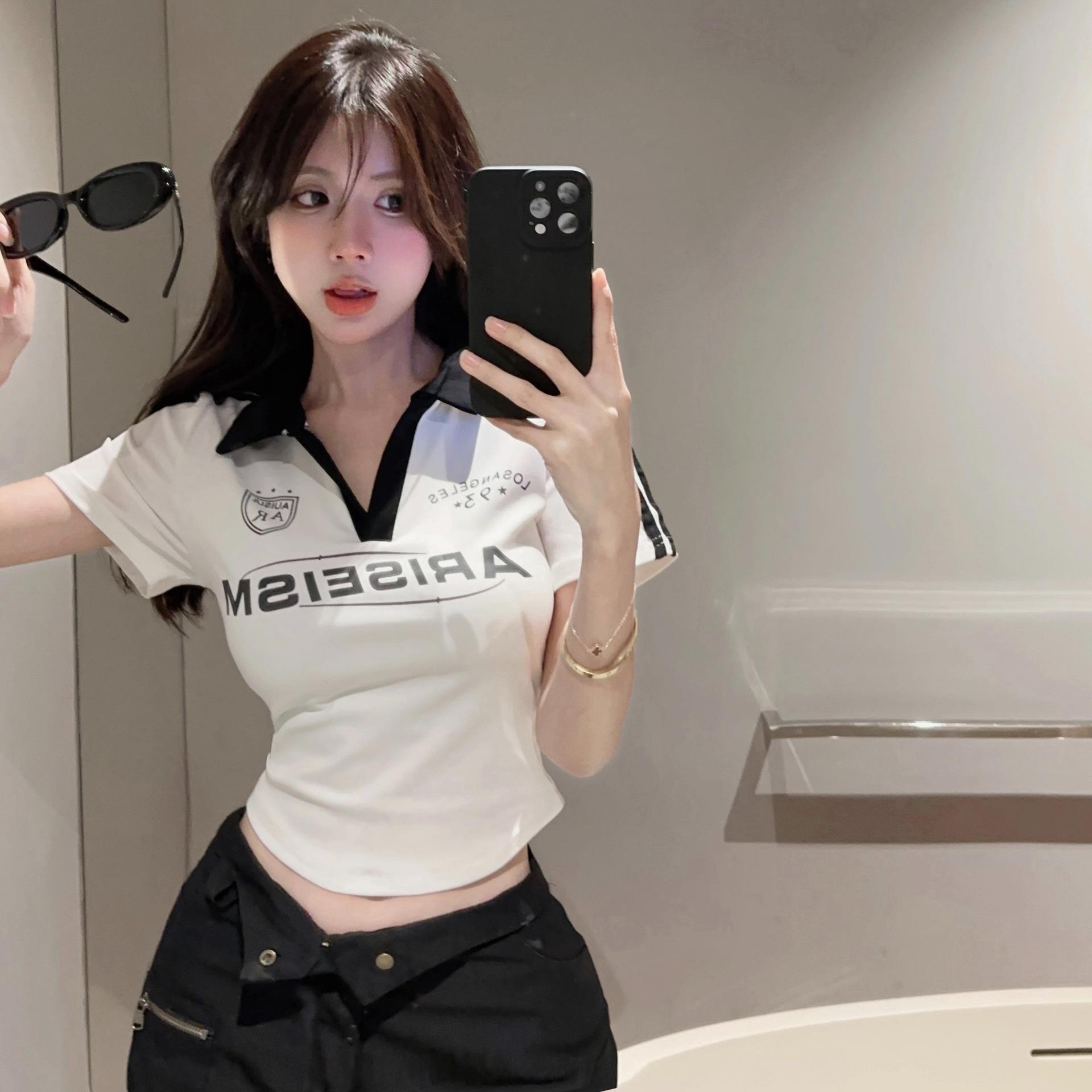 Camiseta de algodón de manga corta con cuello polo y hombros descubiertos para mujer, verano 2024, nuevo diseño, estilo nicho americano, top corto de verano