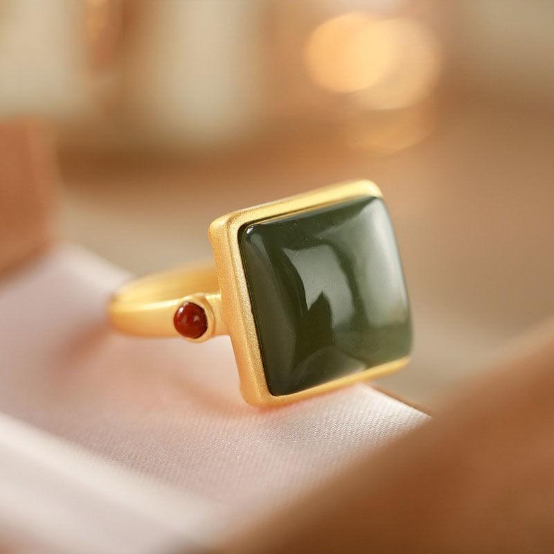 Anillo de jade Hetian 925 oro antiguo anillo de boca anillo cuadrado de jade retro femenino