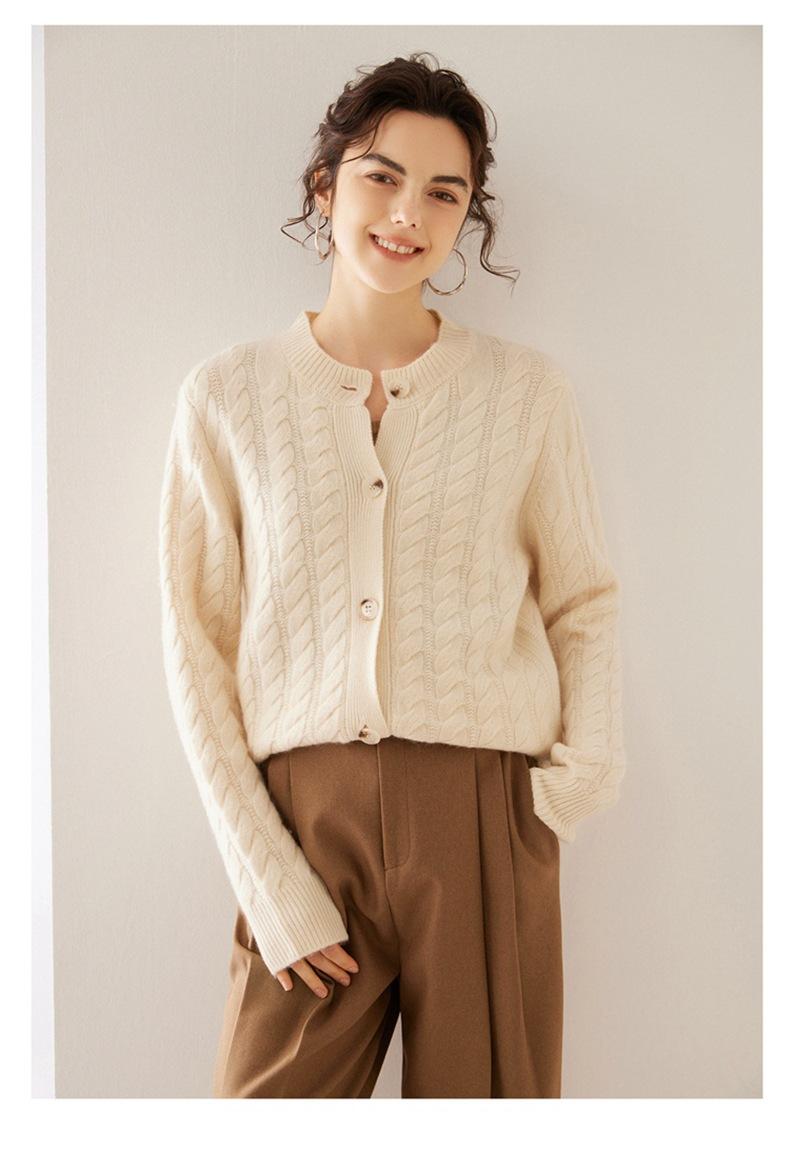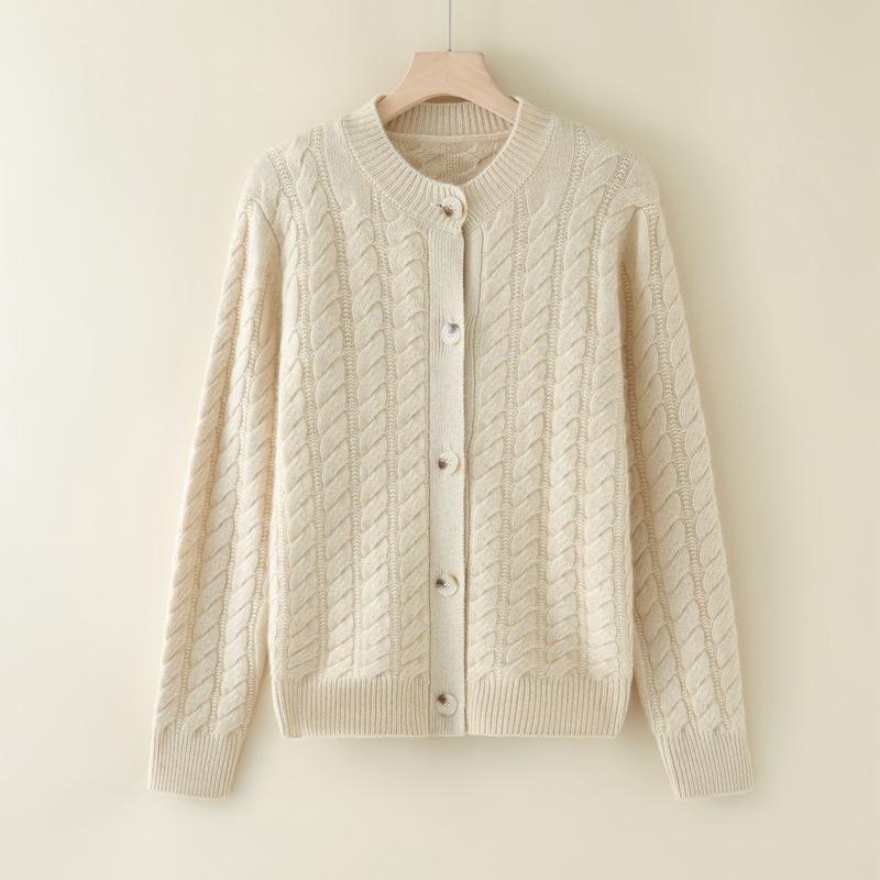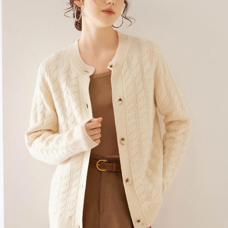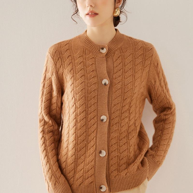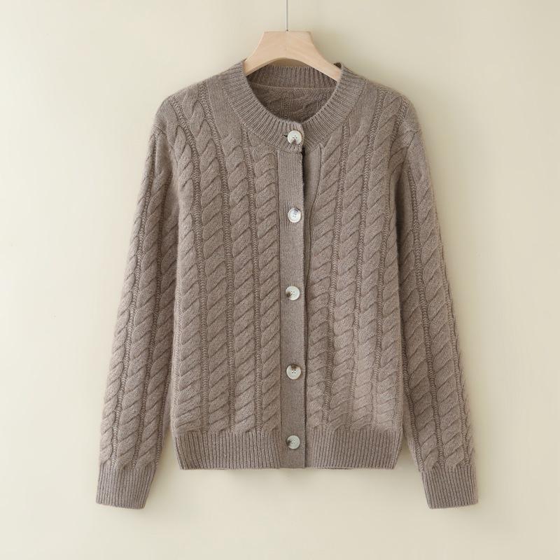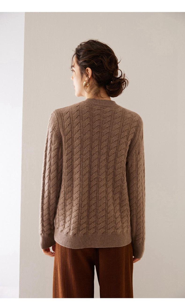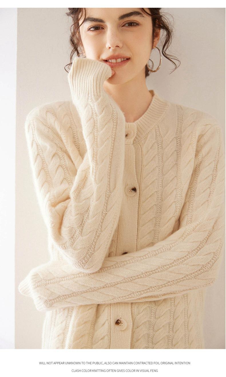 Suéter de cachemira de punto con cable grueso y cuello redondo para mujer, cárdigan de otoño e invierno con parte superior torcida, suéter torcido, prenda exterior de manga larga