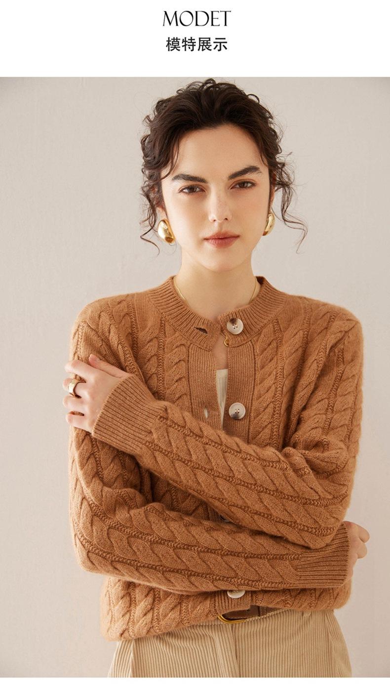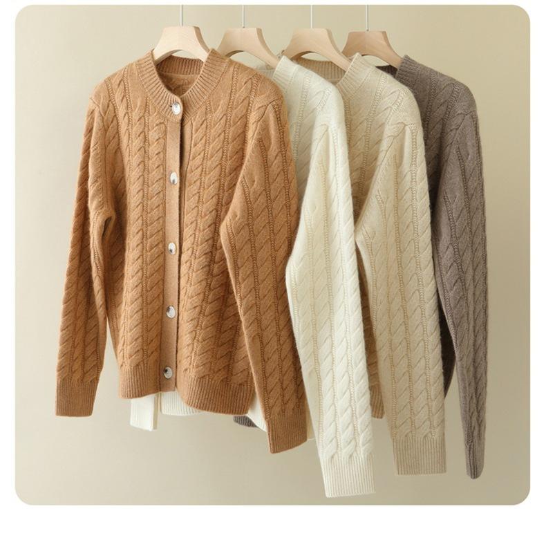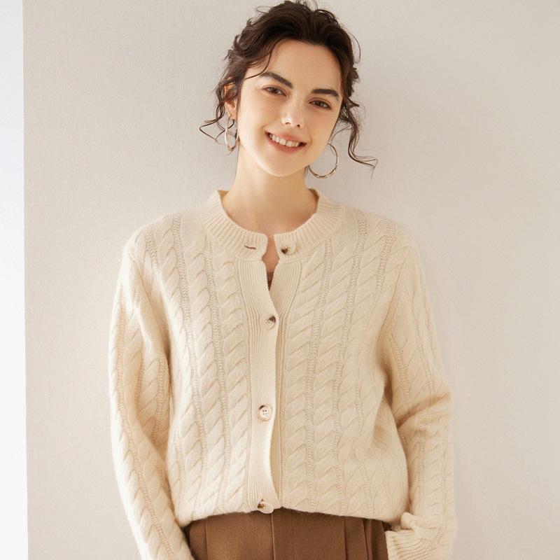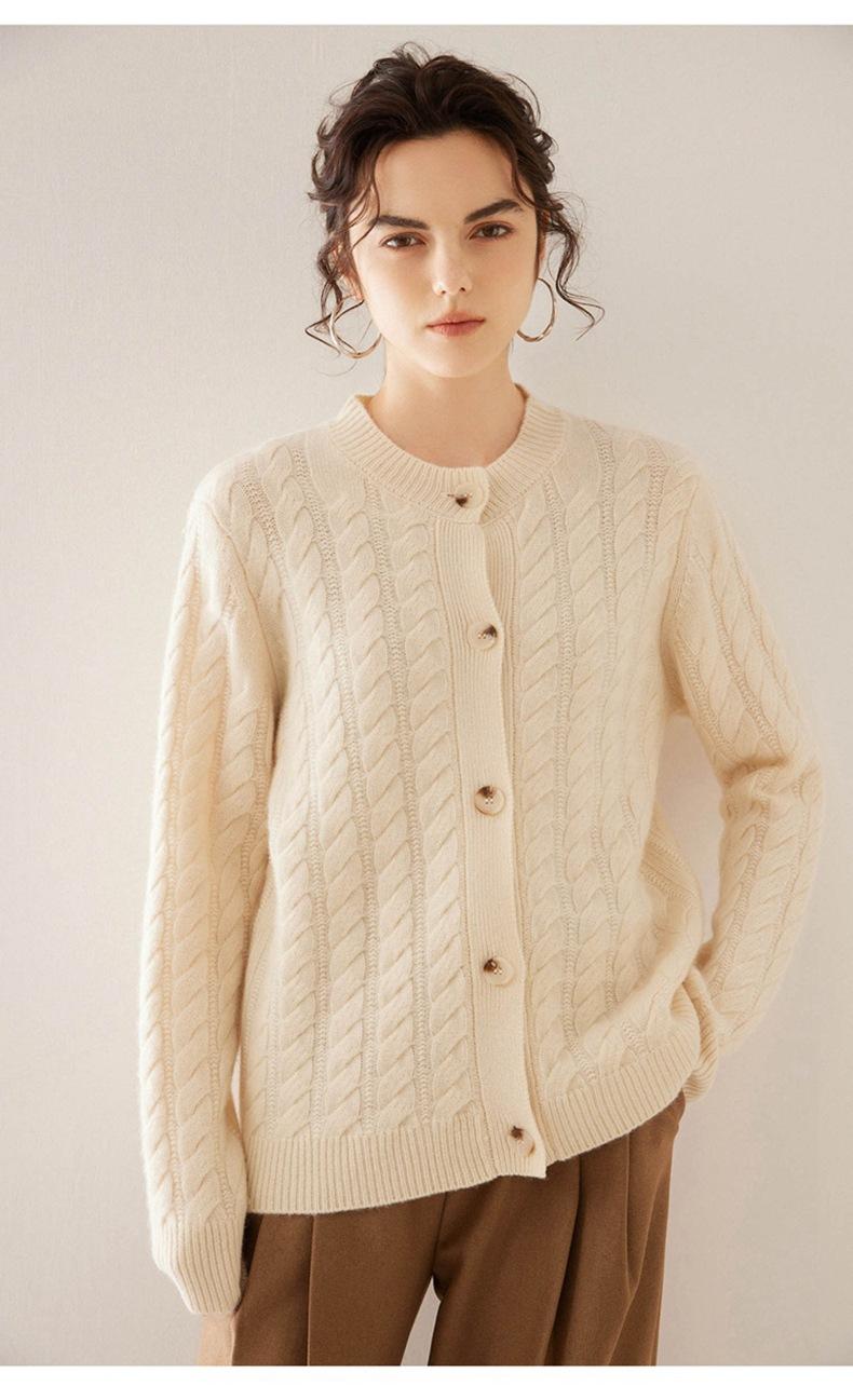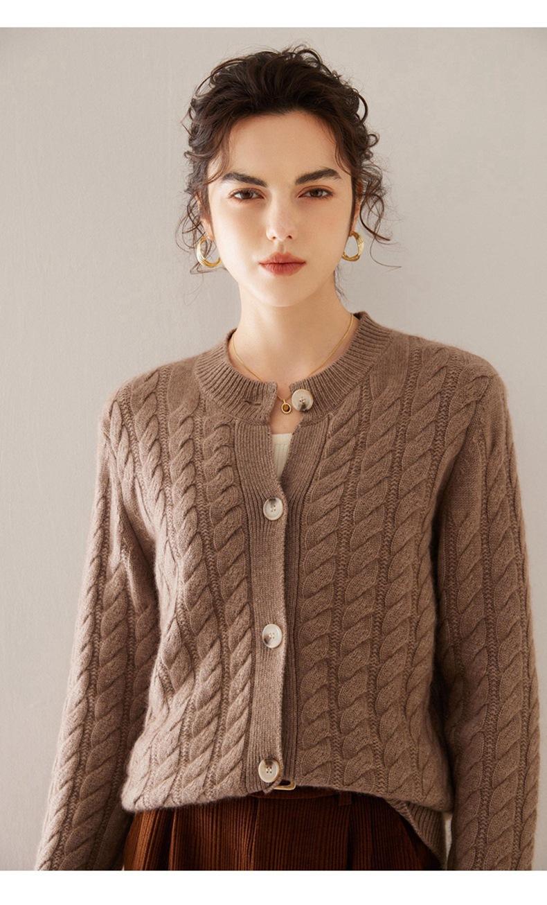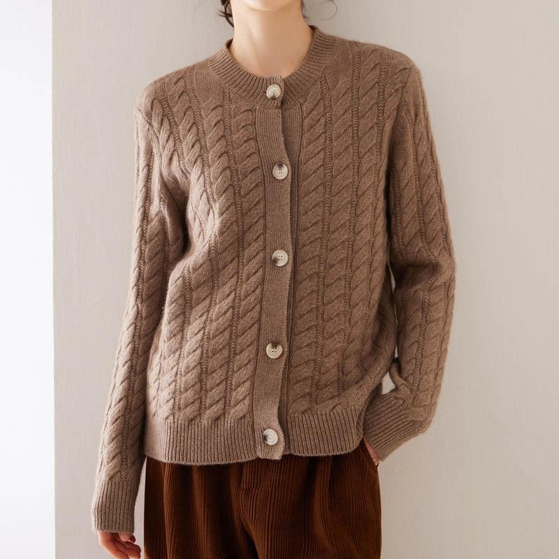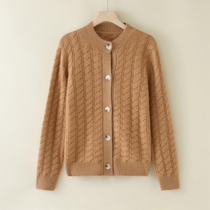 Suéter de cachemira de punto con cable grueso y cuello redondo para mujer, cárdigan de otoño e invierno con parte superior torcida, suéter torcido, prenda exterior de manga larga