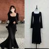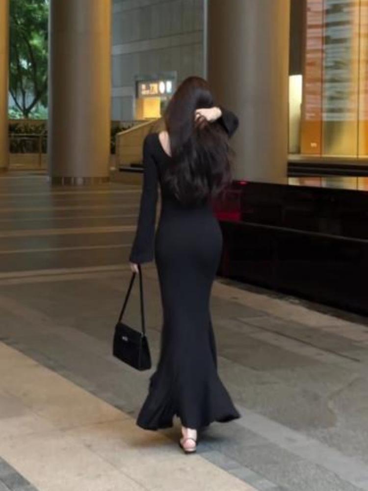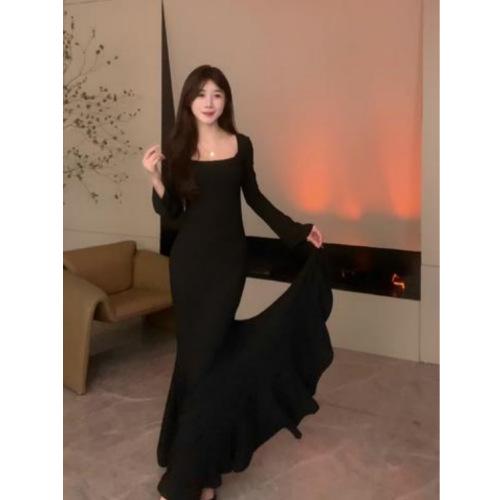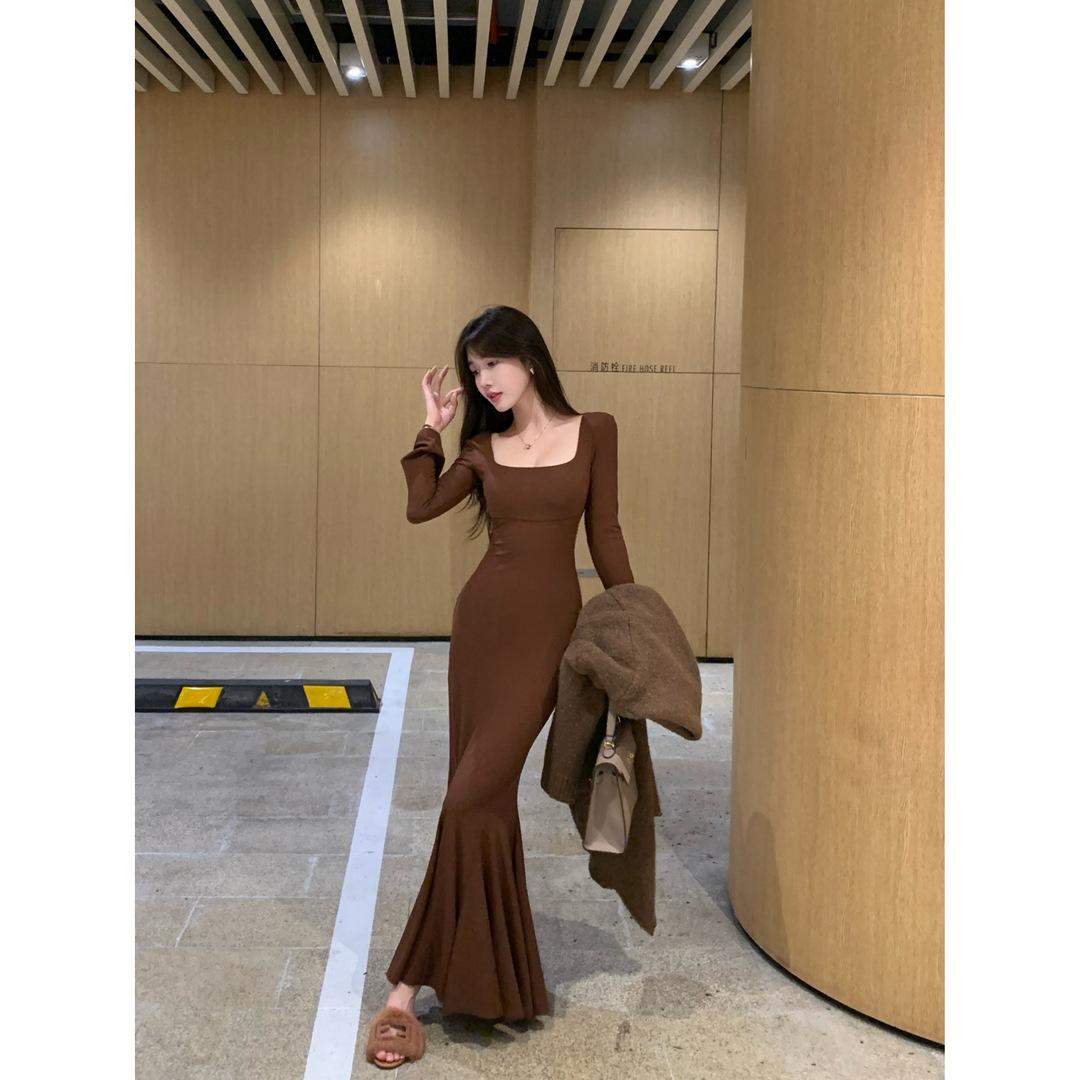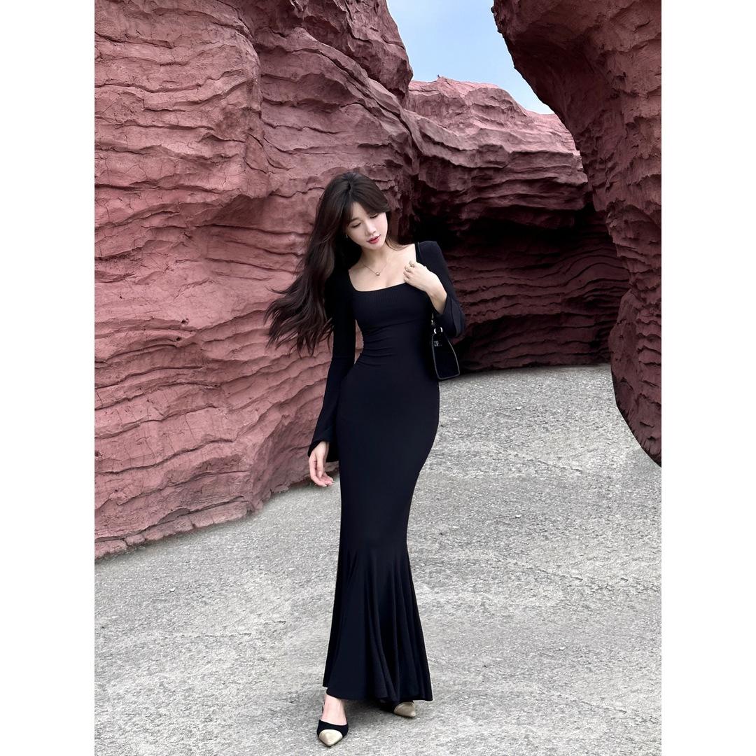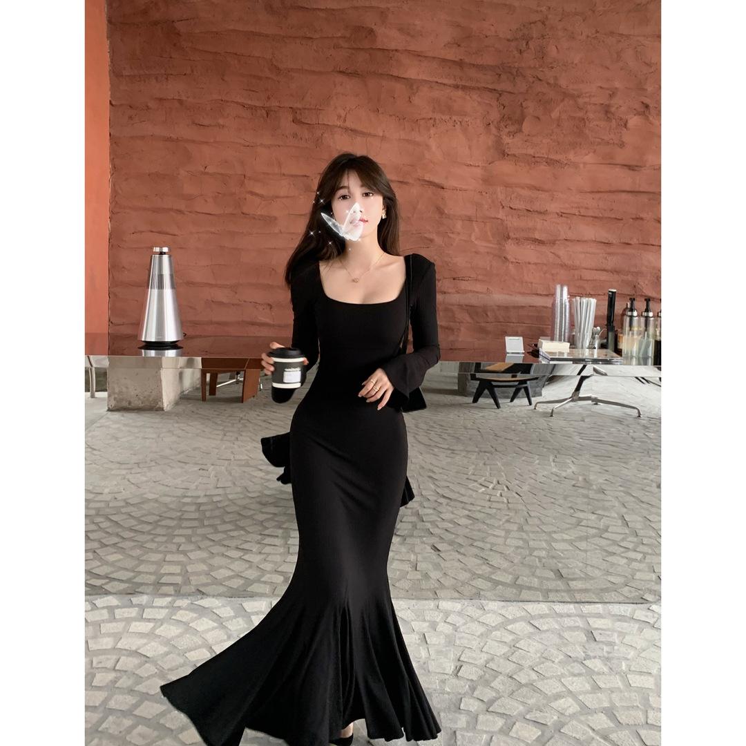 Huahai danza otoño sentido del diseño delgado adelgazante tirantes falda cola de pez temperamento sexy vaina vestido largo mujeres