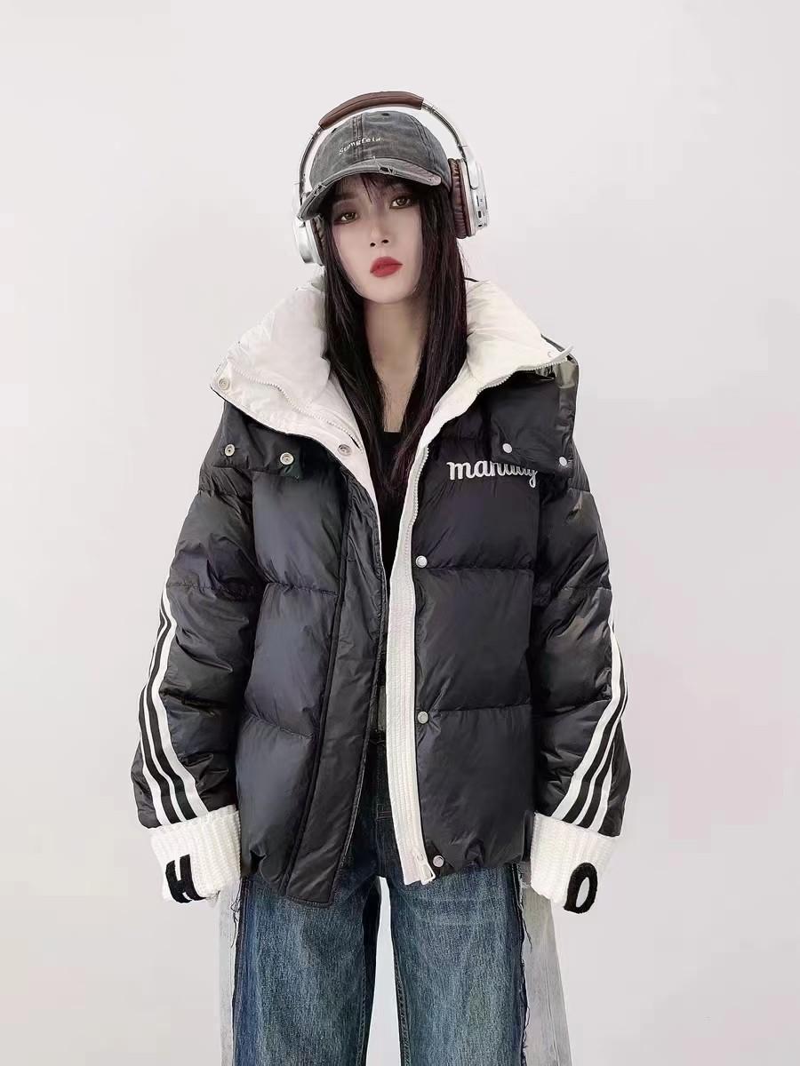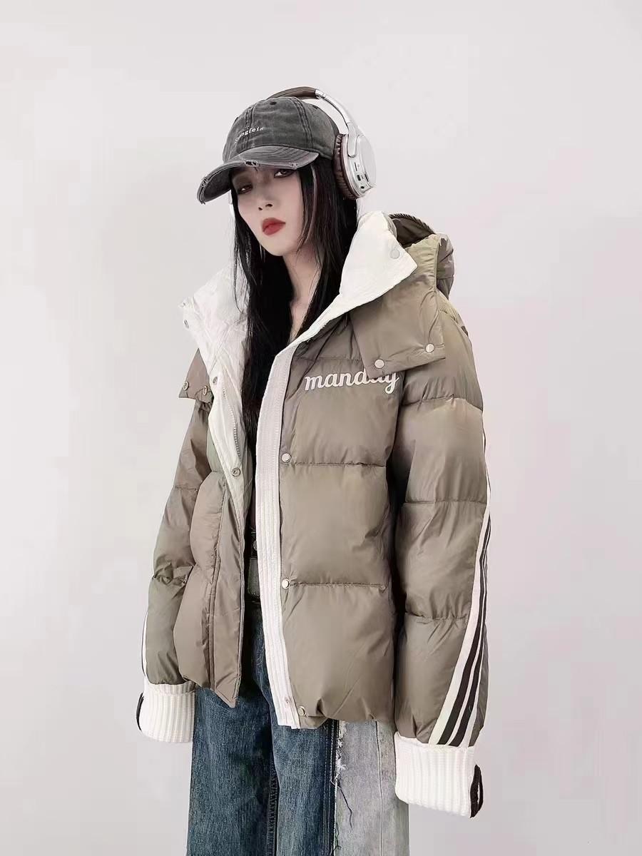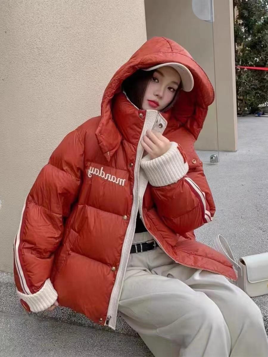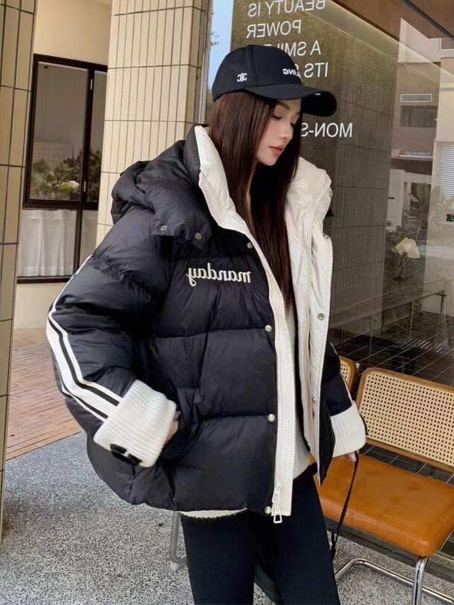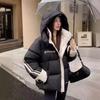 Moda europea color contraste tejido de punto costura chamarra de plumón para mujer invierno pequeña engrosada cálida plumón de pato blanco abrigo pan
