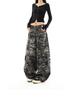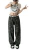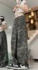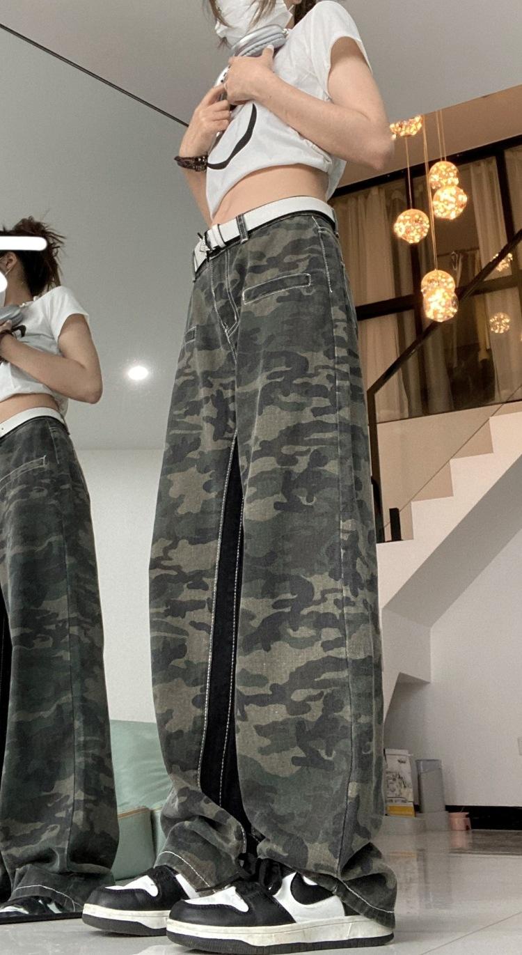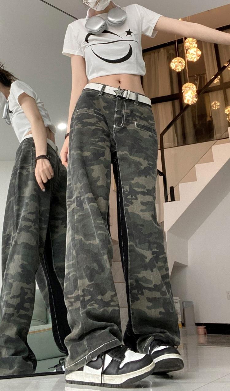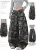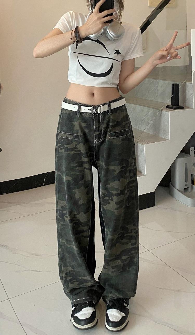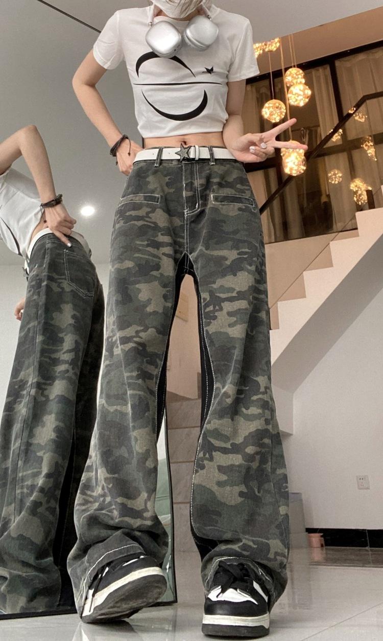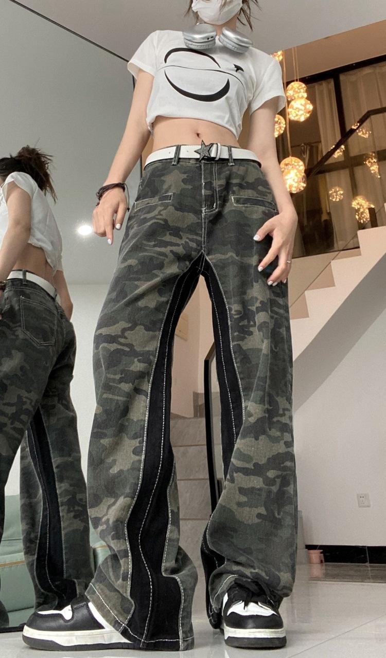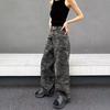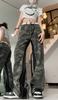 Pantalones vaqueros cargo con camuflaje retro americano para mujer, de cintura alta, holgados, rectos, largos, anchos y de pierna verde militar.