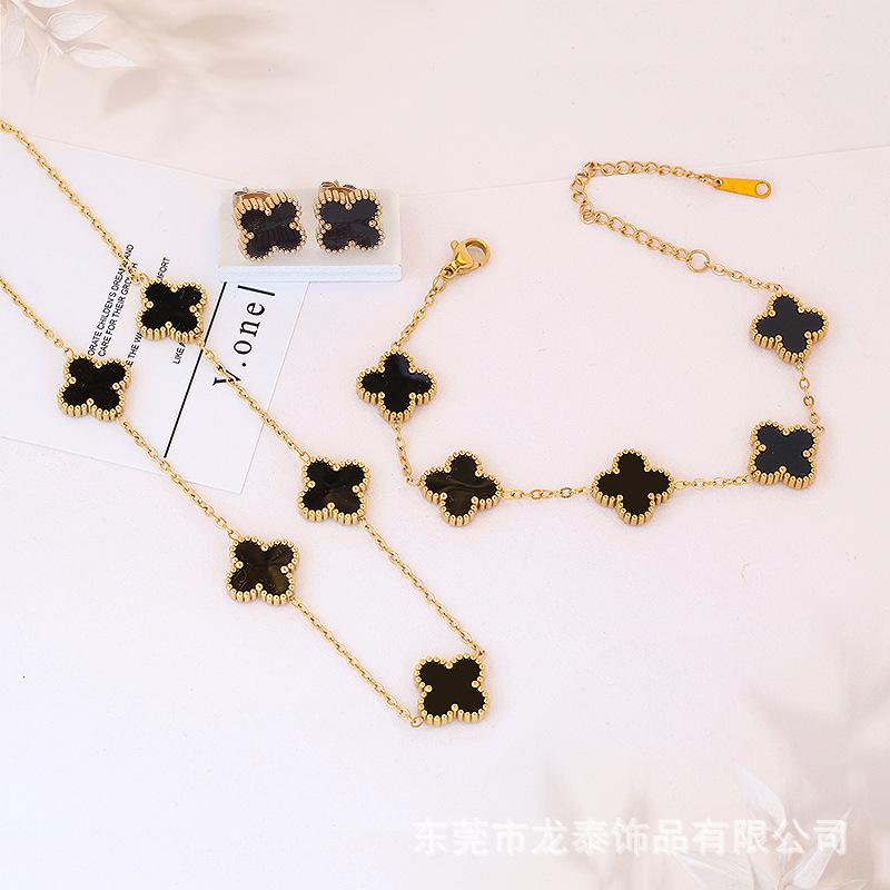 Golden double-sided five-flower necklace bracelet earrings (black shell)