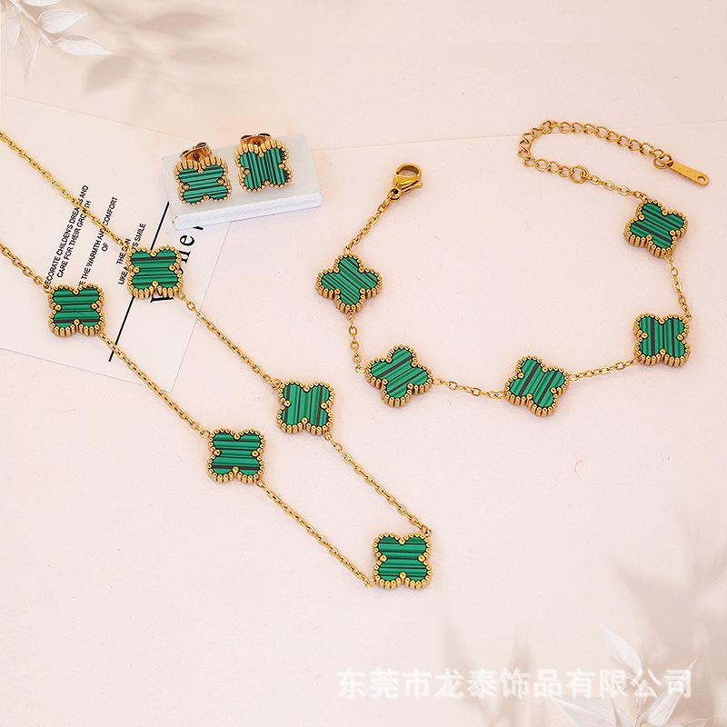 Golden double-sided five-flower necklace bracelet earrings (green shellfish)