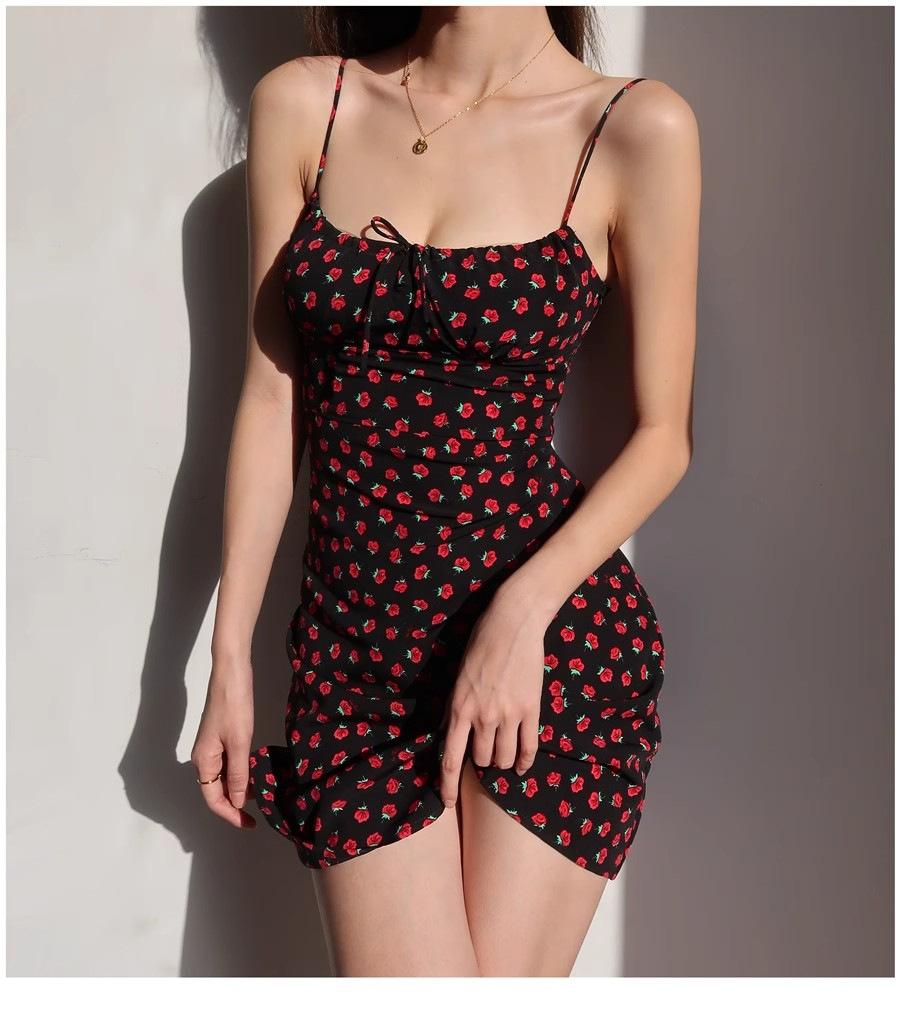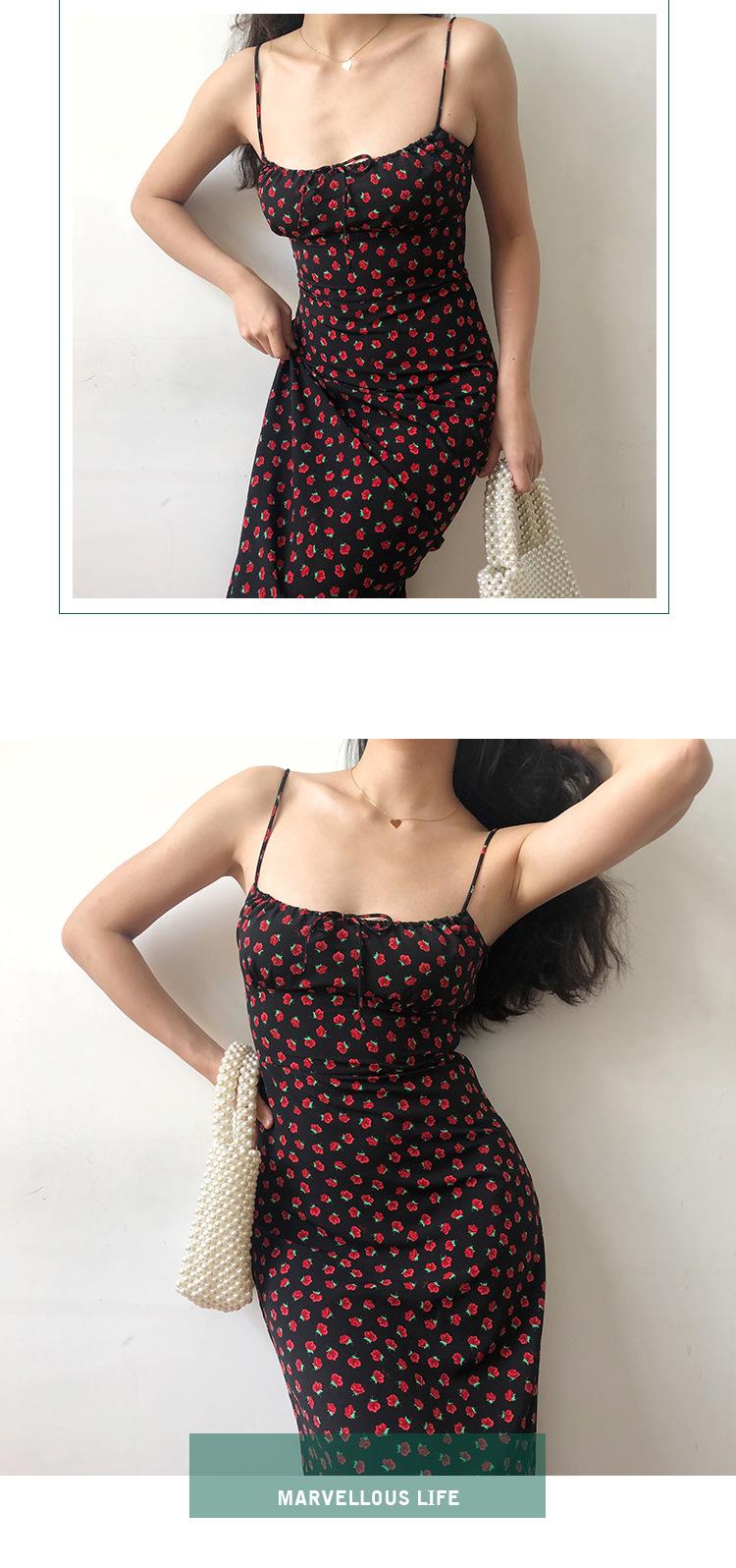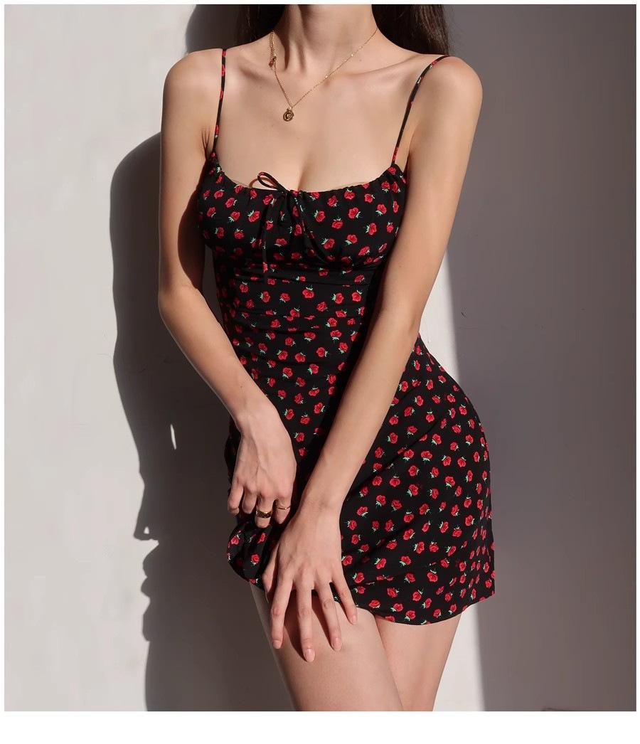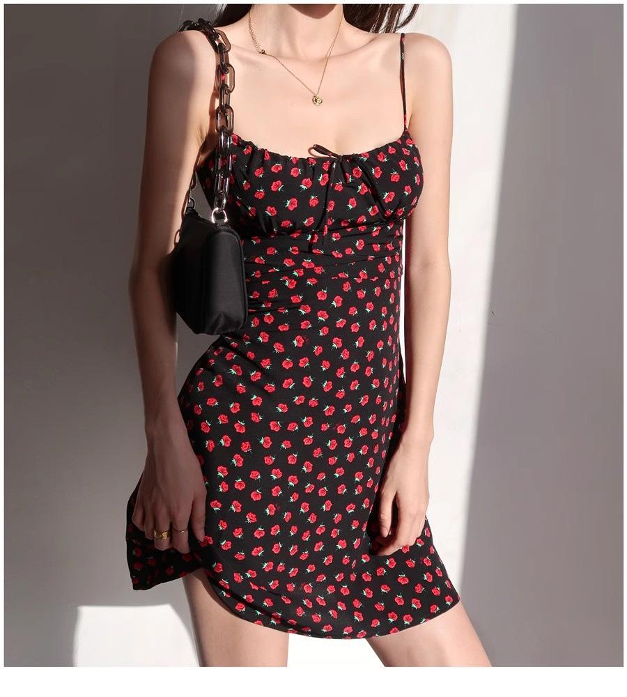 Vestido de verano estilo retro francés para chica, nuevo, con estampado floral, color negro y rosa salvaje, con efecto adelgazante y cintura alta.