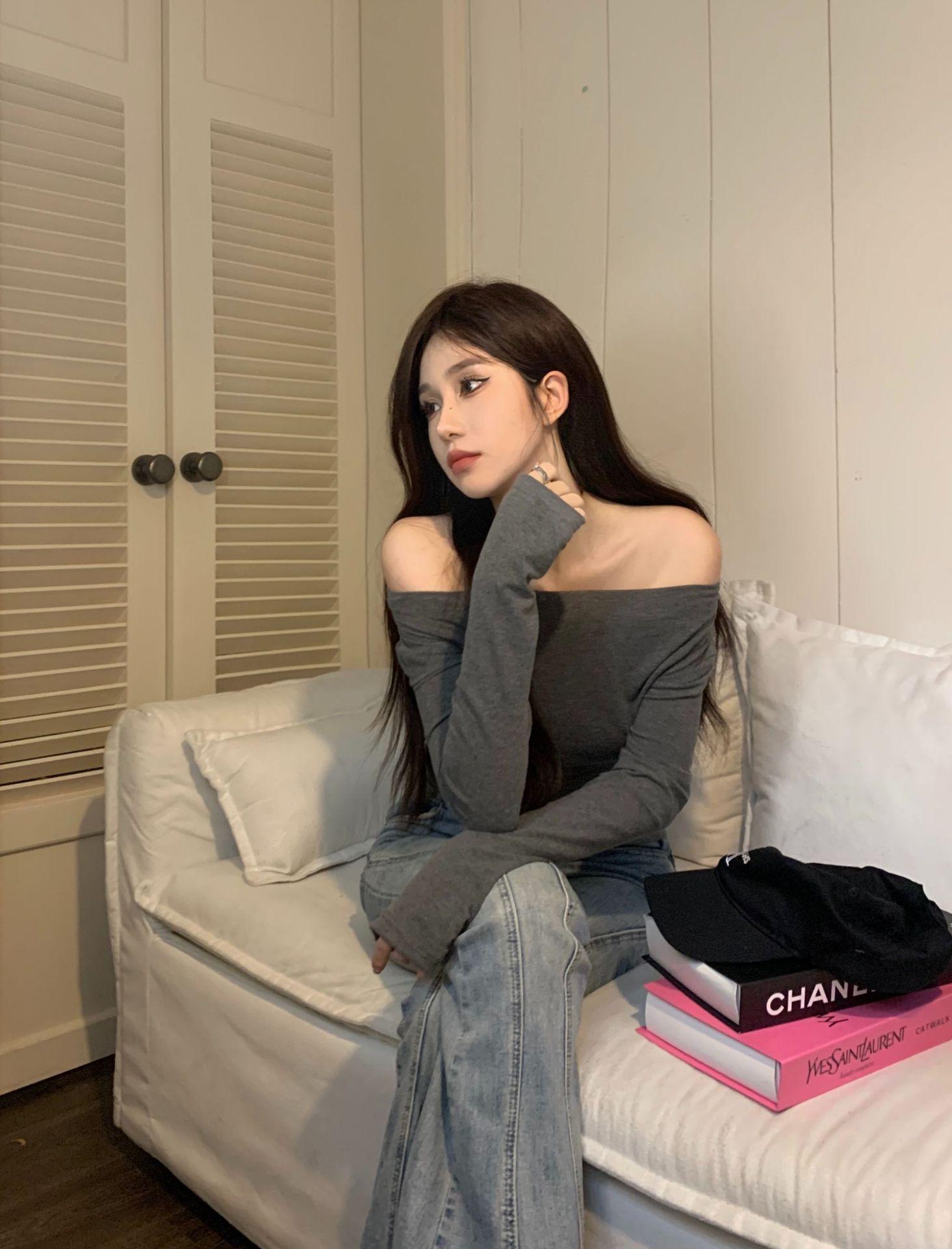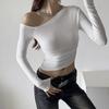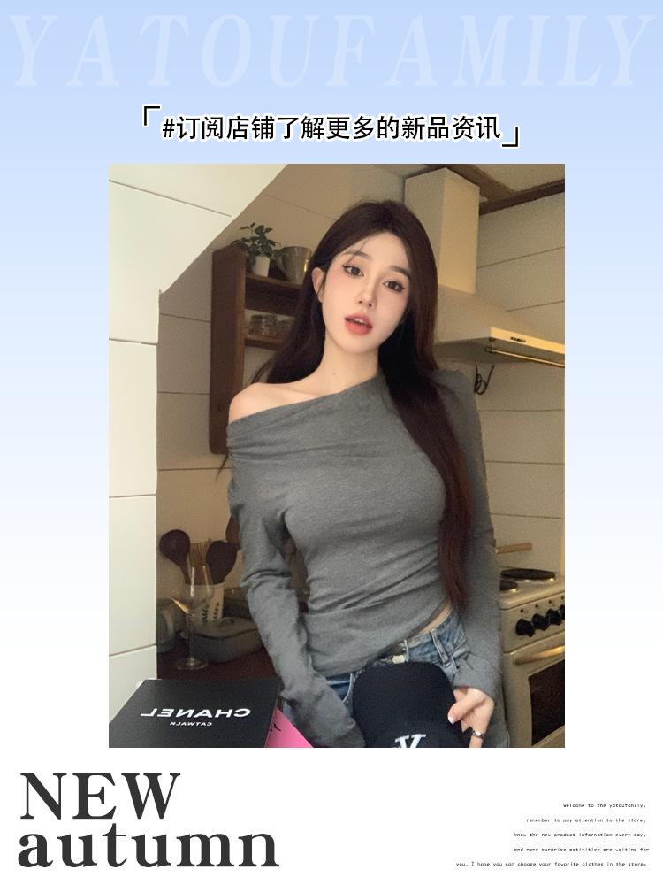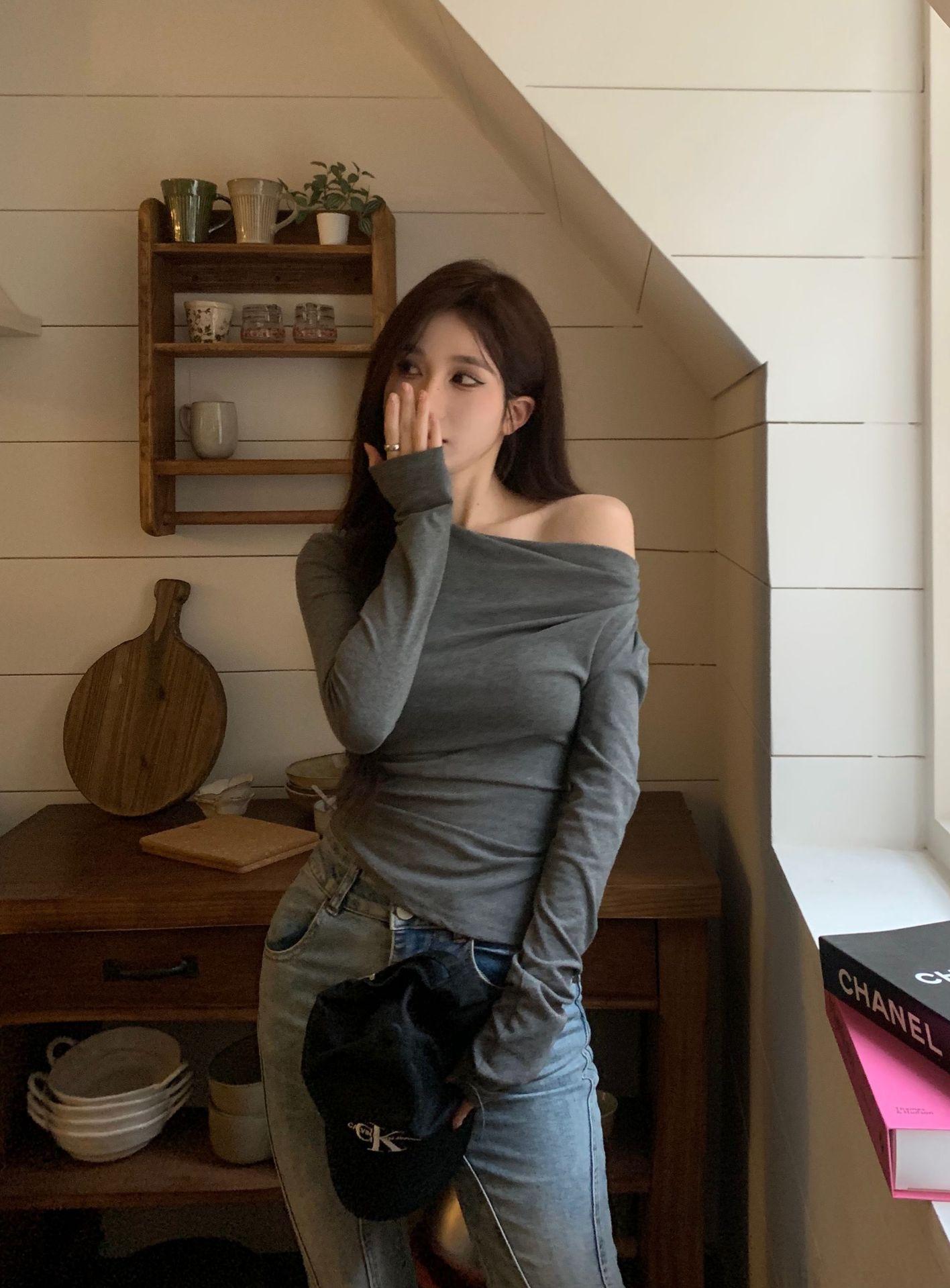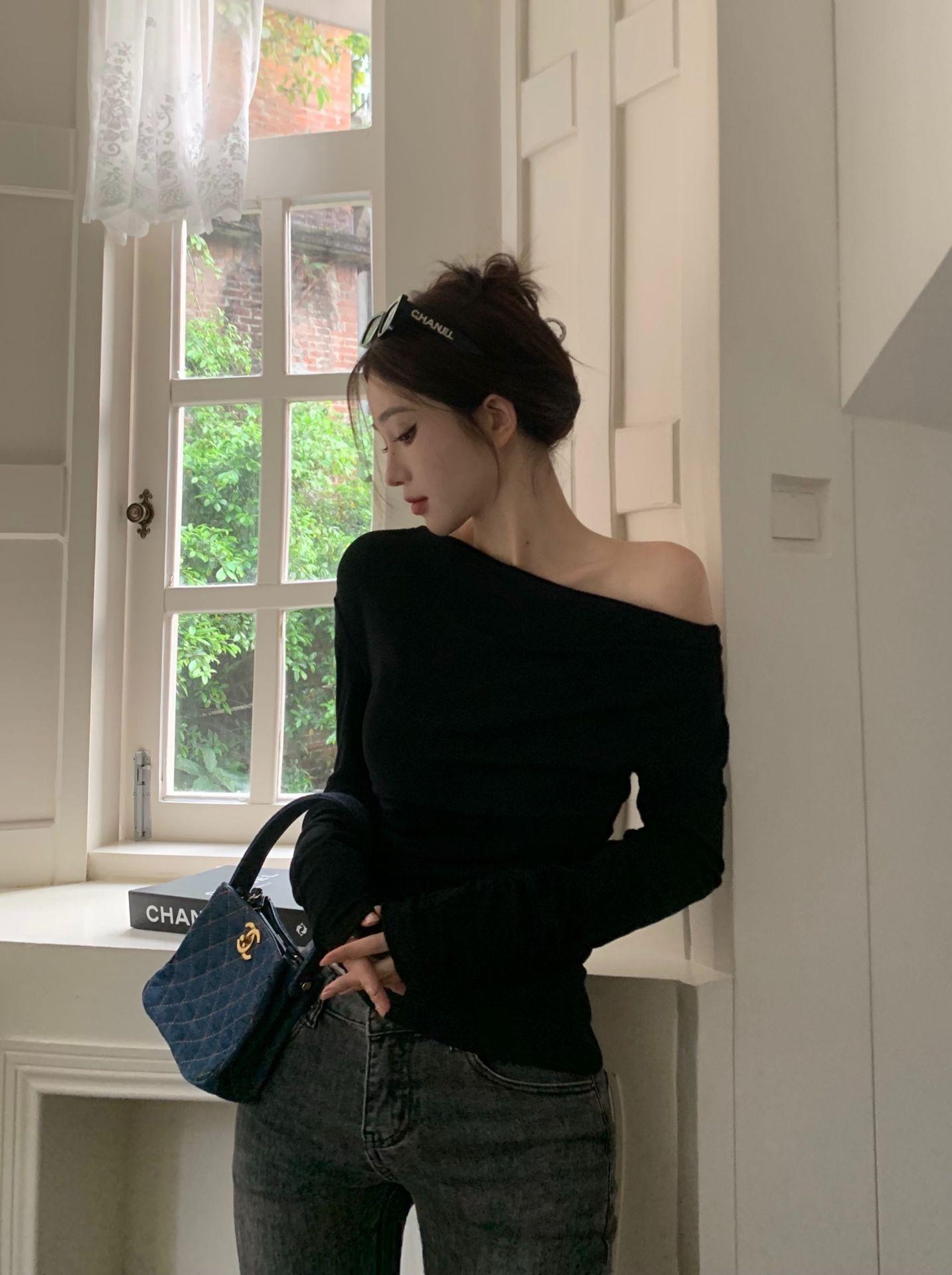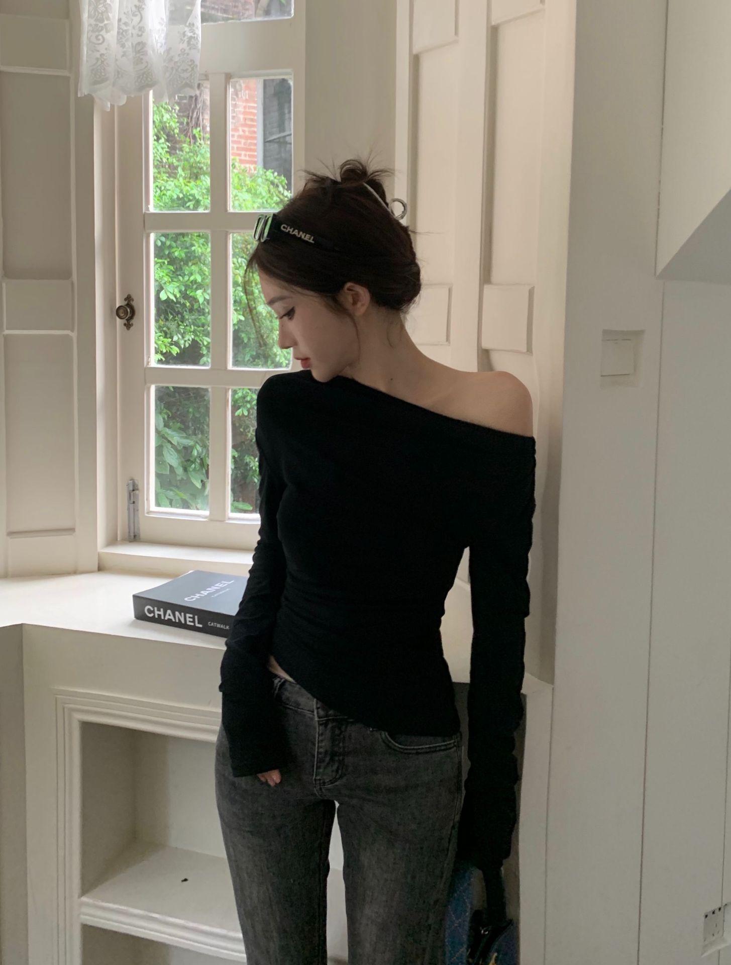 Camisa de fondo irregular para mujer 2023 nueva ropa interior de principios de otoño, top de manga larga con hombros descubiertos y clavícula con hombros descubiertos de alta calidad