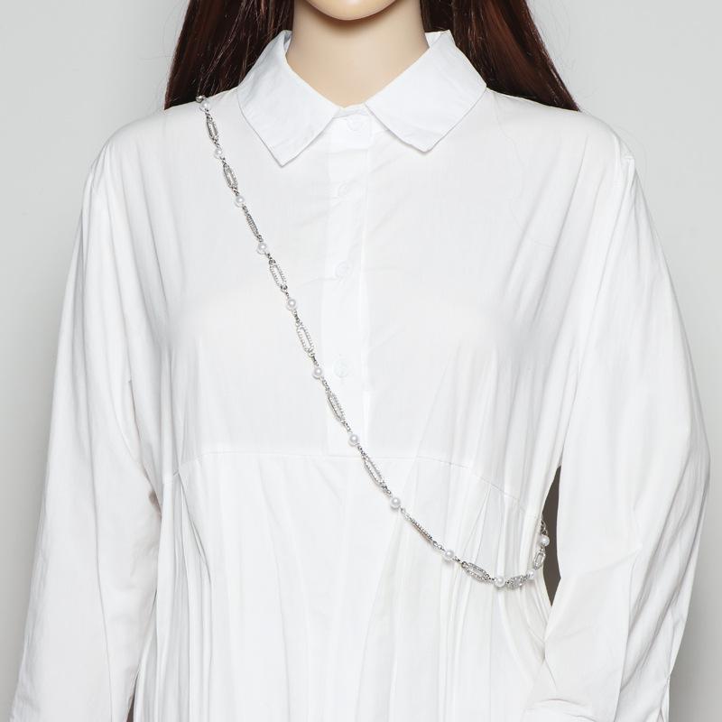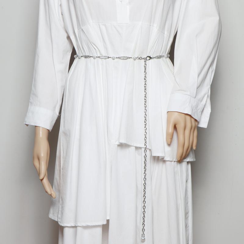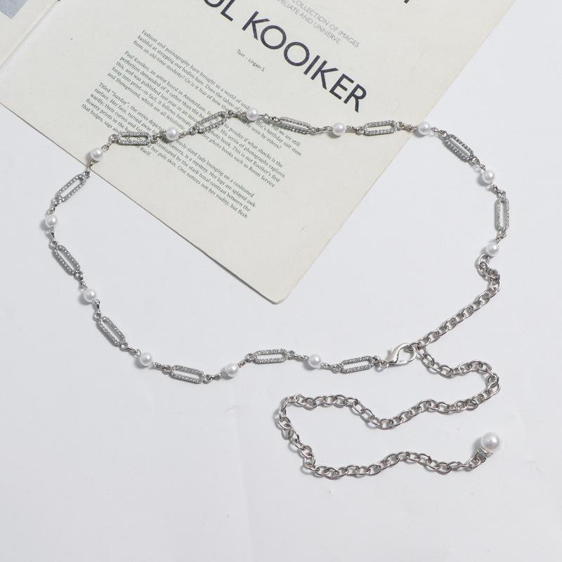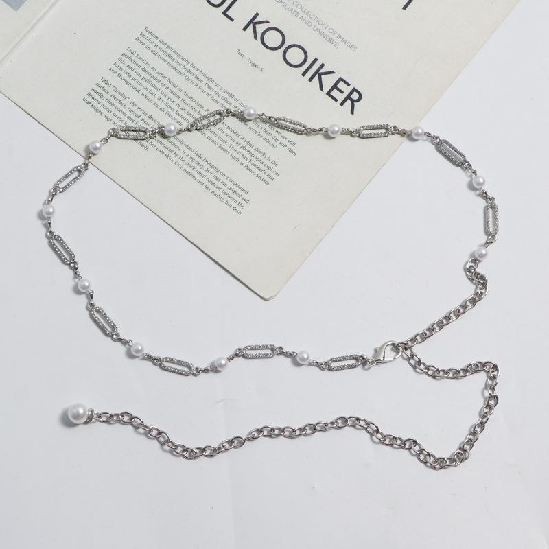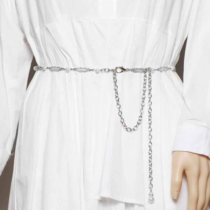 Accesorios de cadena para la cintura 2023, nuevo cinturón fino de alta gama con decoración de perlas y diamantes de imitación, cadena de metal plateada para mujer.