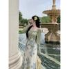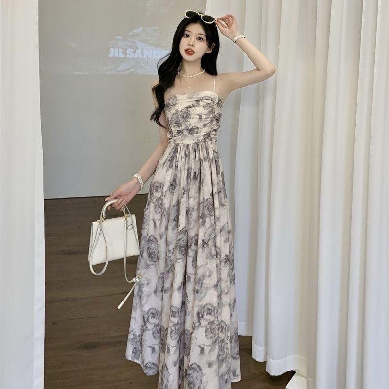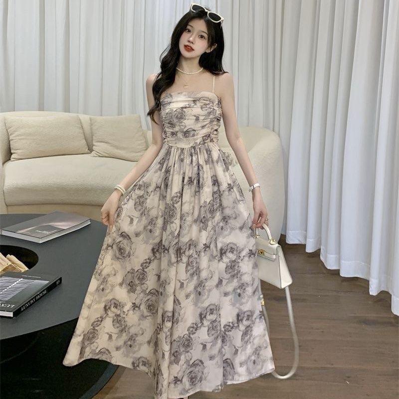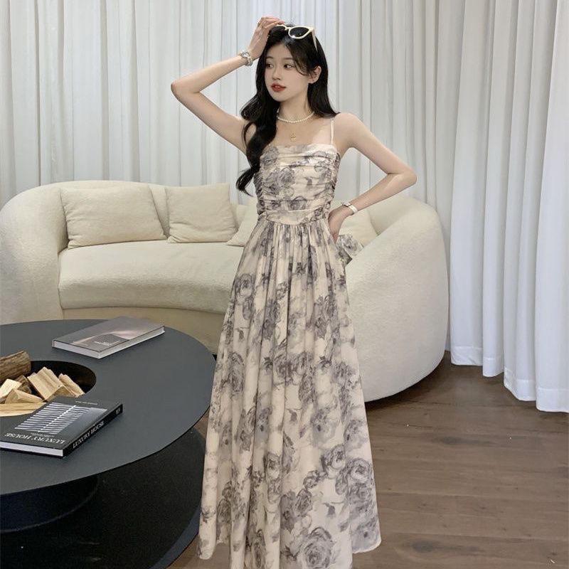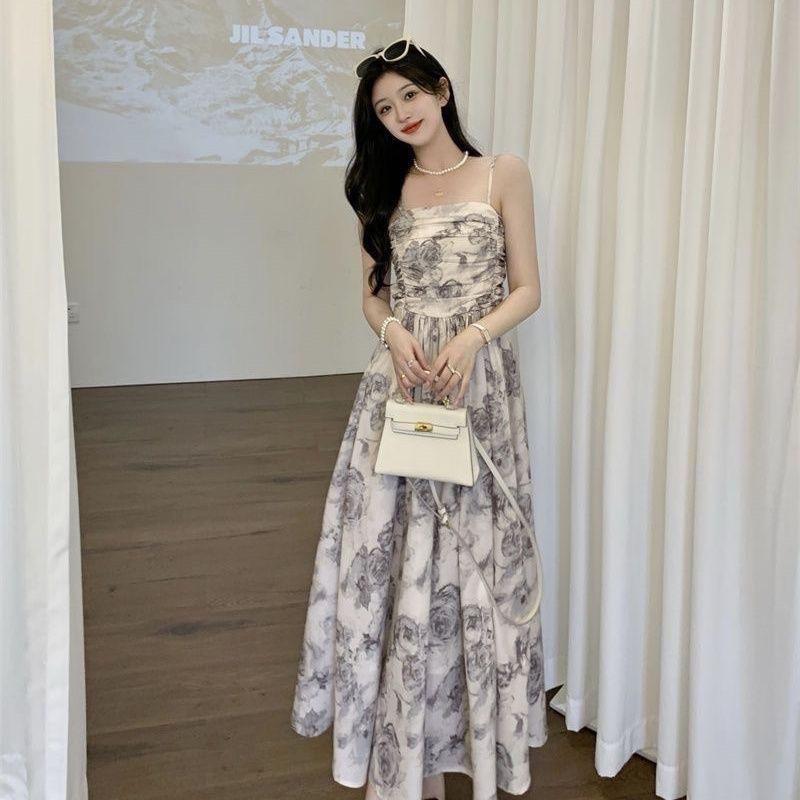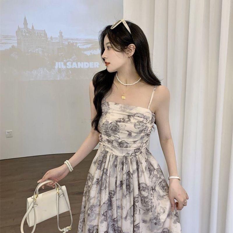Deseo Puro Traje de Falda Floral de Rosa Secado al Viento Ropa de Verano Fina Protectora del Sol Cárdigan Vestido de Estilo Francés con Cintura Ajustada y Tirantes