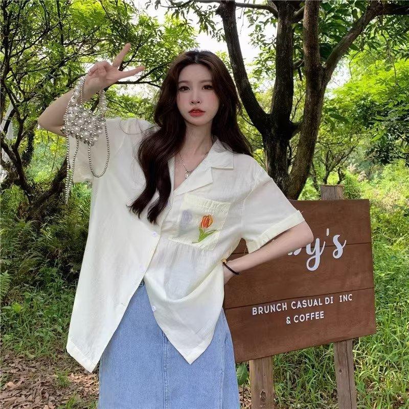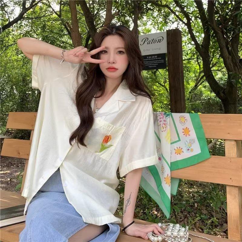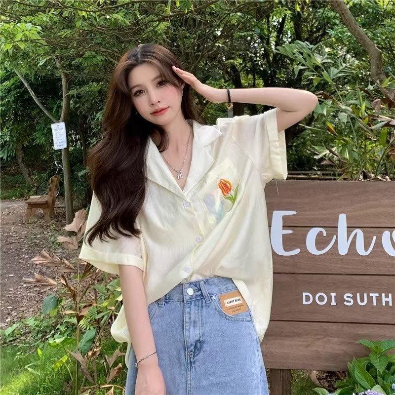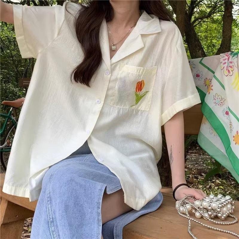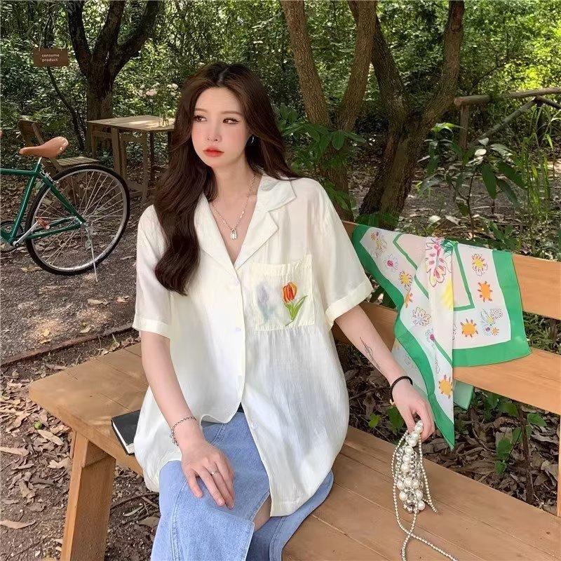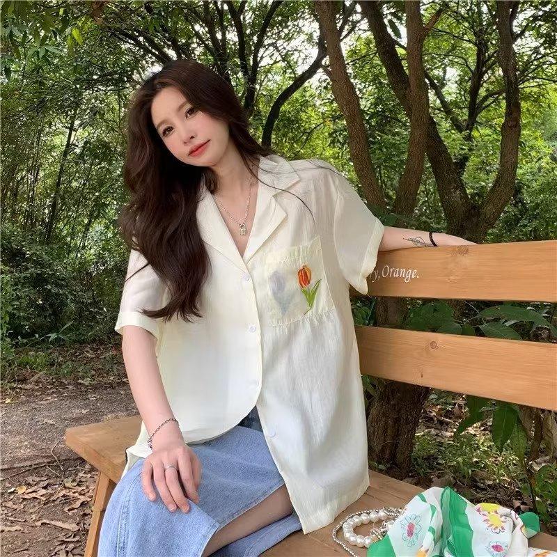 Camisa de manga corta fina con bordado de tulipán y diseño de chica gordita, nueva camisa fina y holgada de verano para mujer, moda