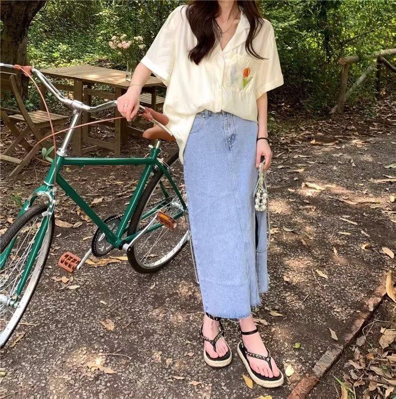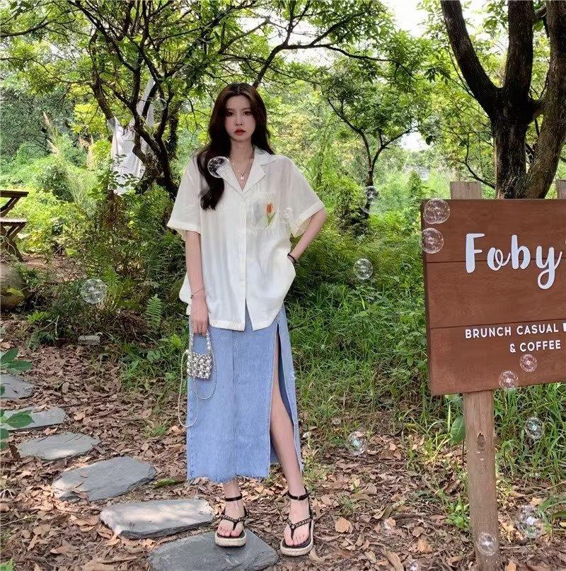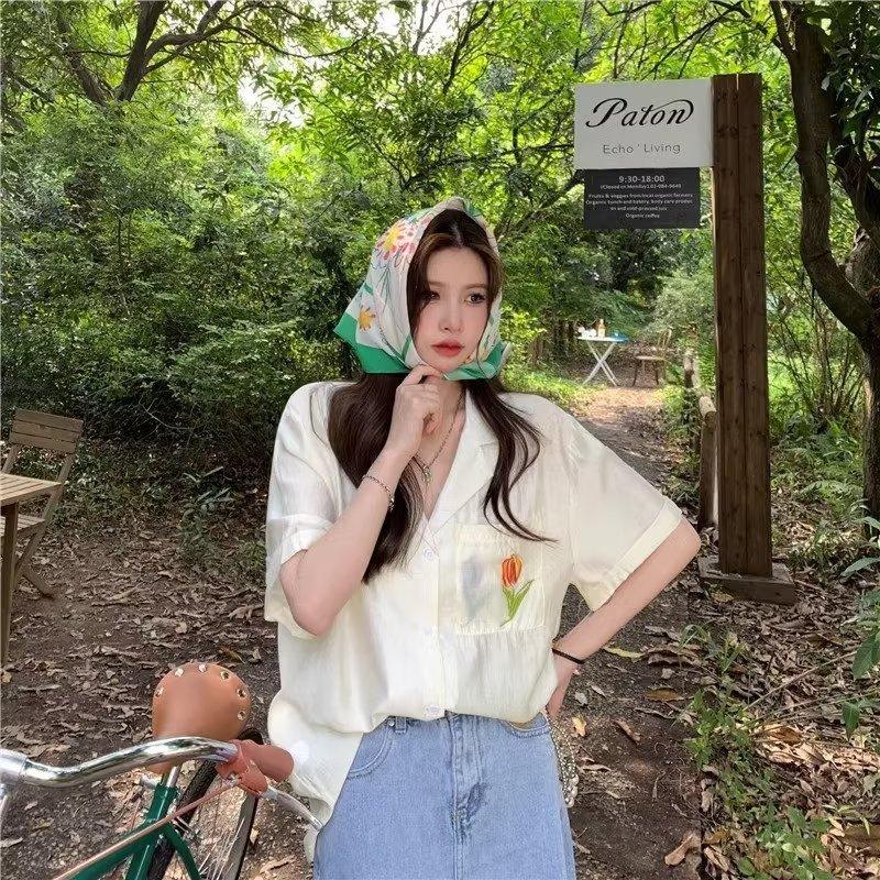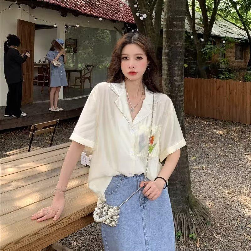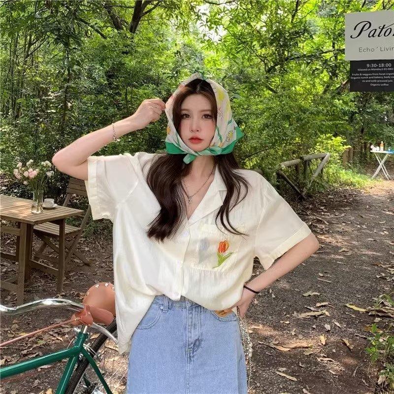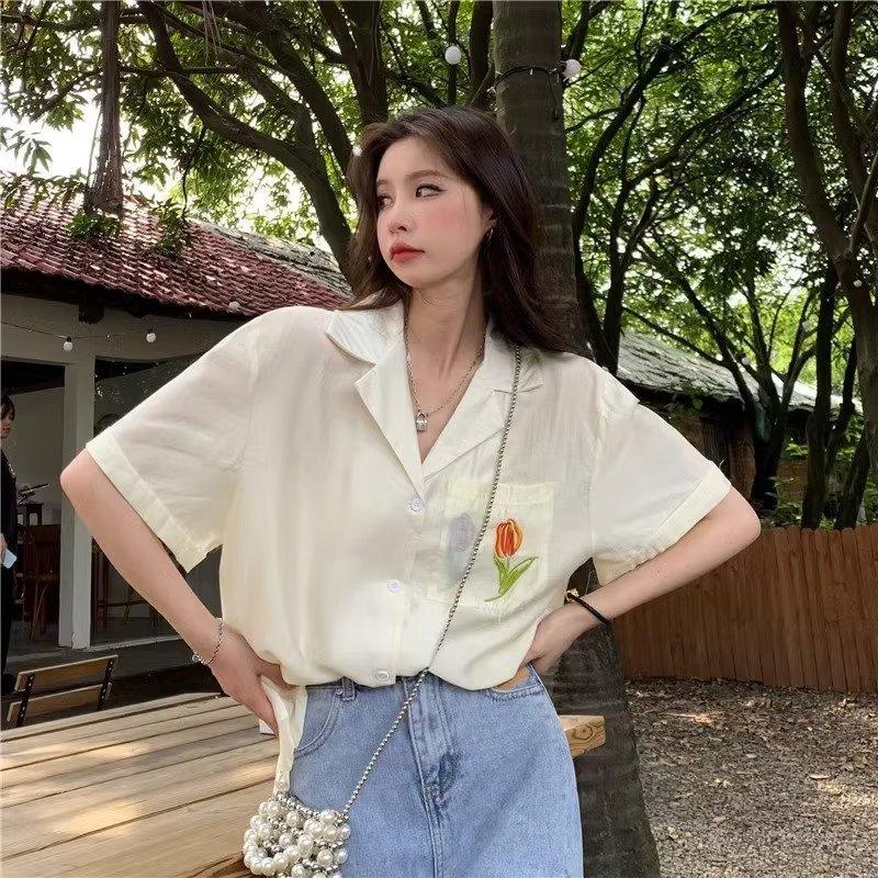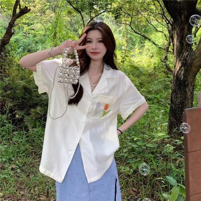 Camisa de manga corta fina con bordado de tulipán y diseño de chica gordita, nueva camisa fina y holgada de verano para mujer, moda