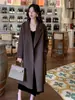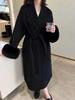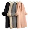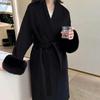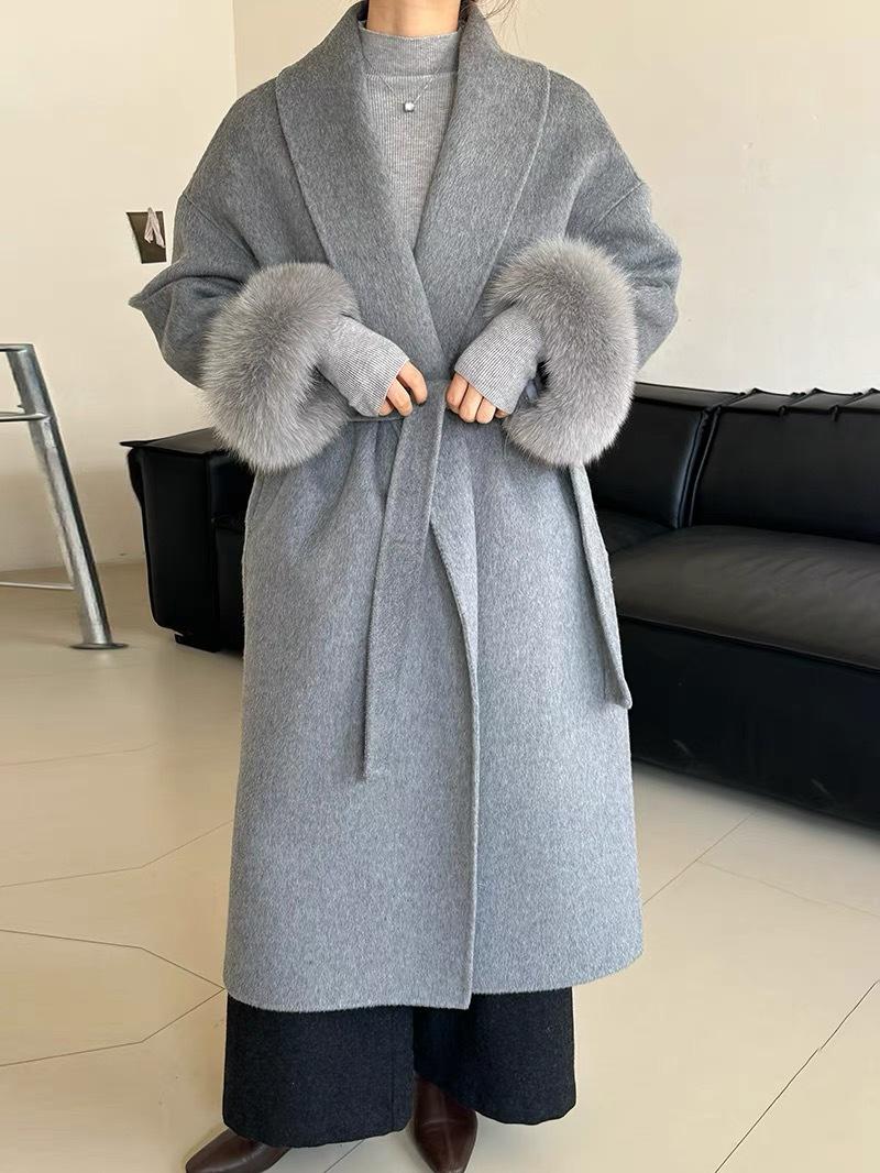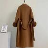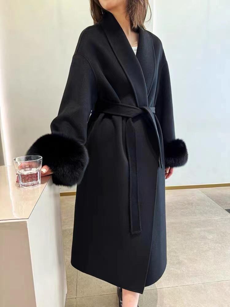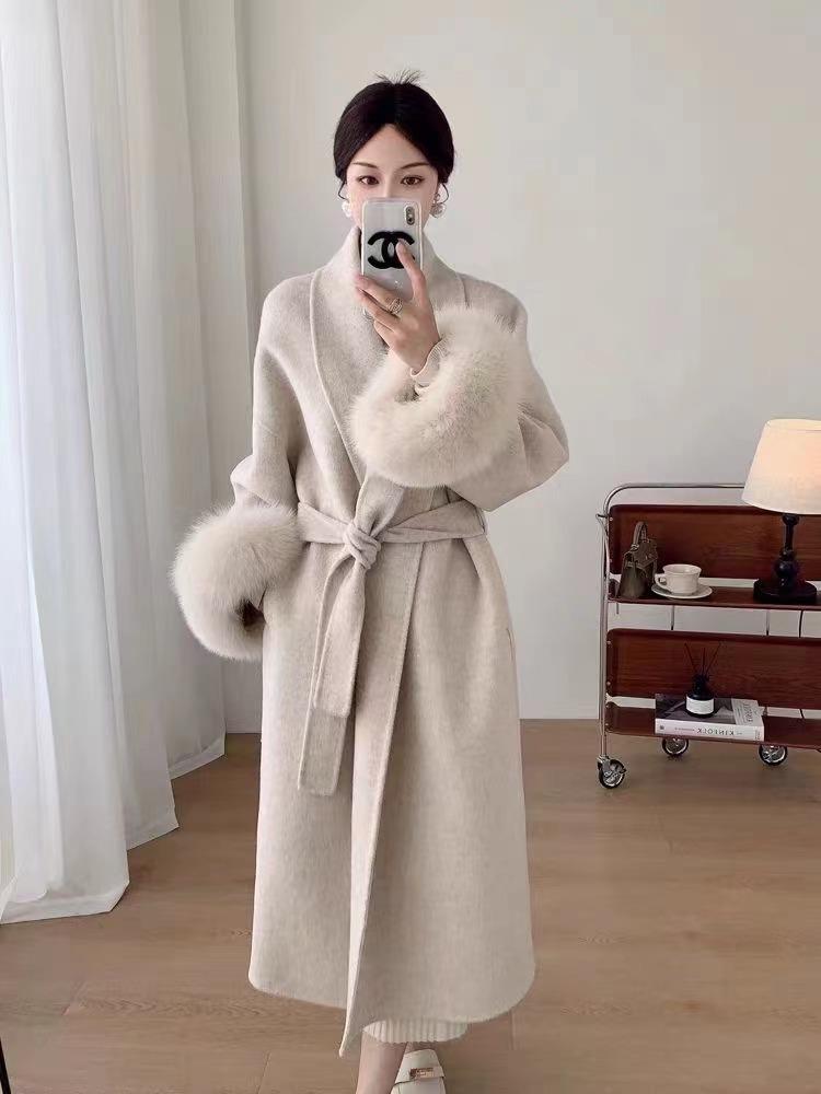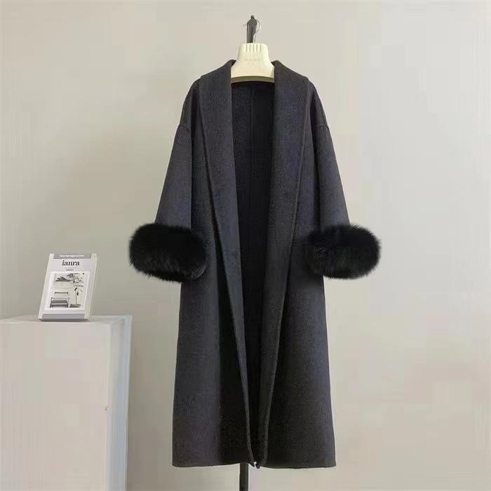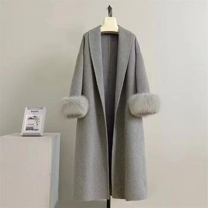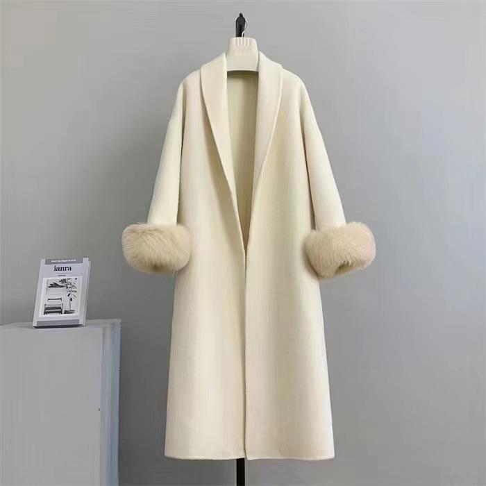 Abrigo de lana de doble cara estilo Hepburn extendido con puños de piel de zorro otoño e invierno 2023