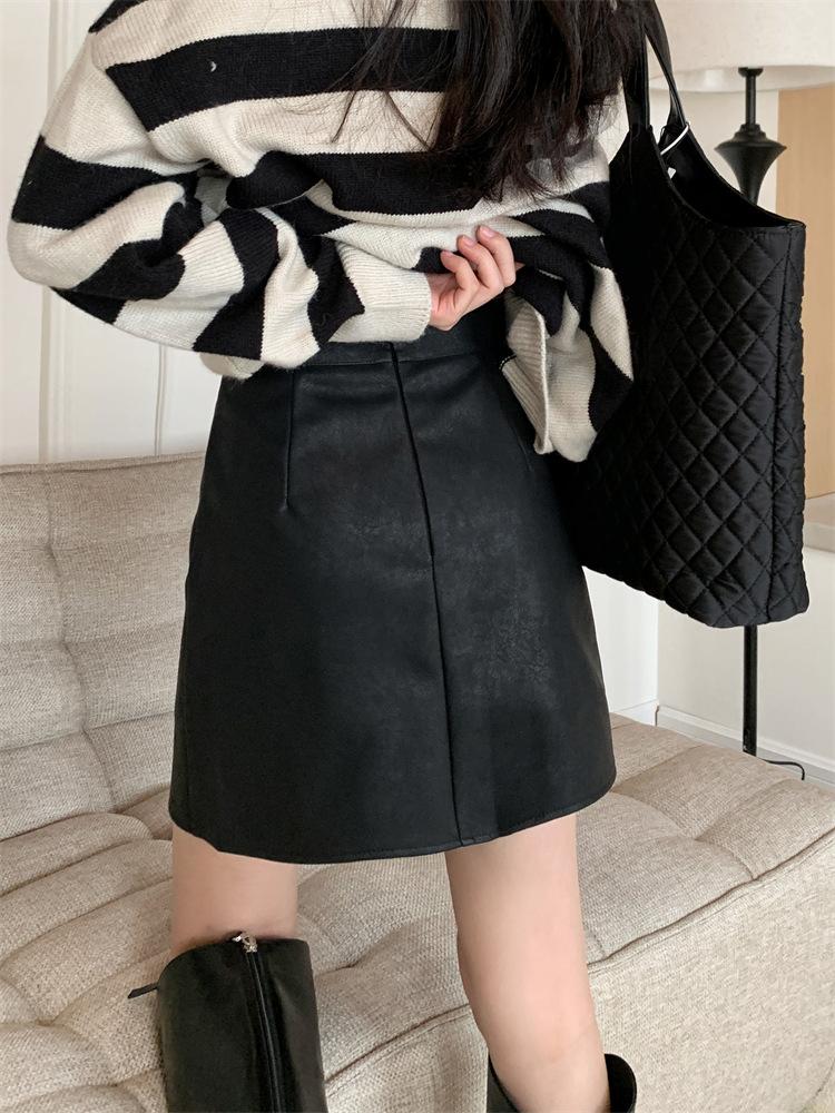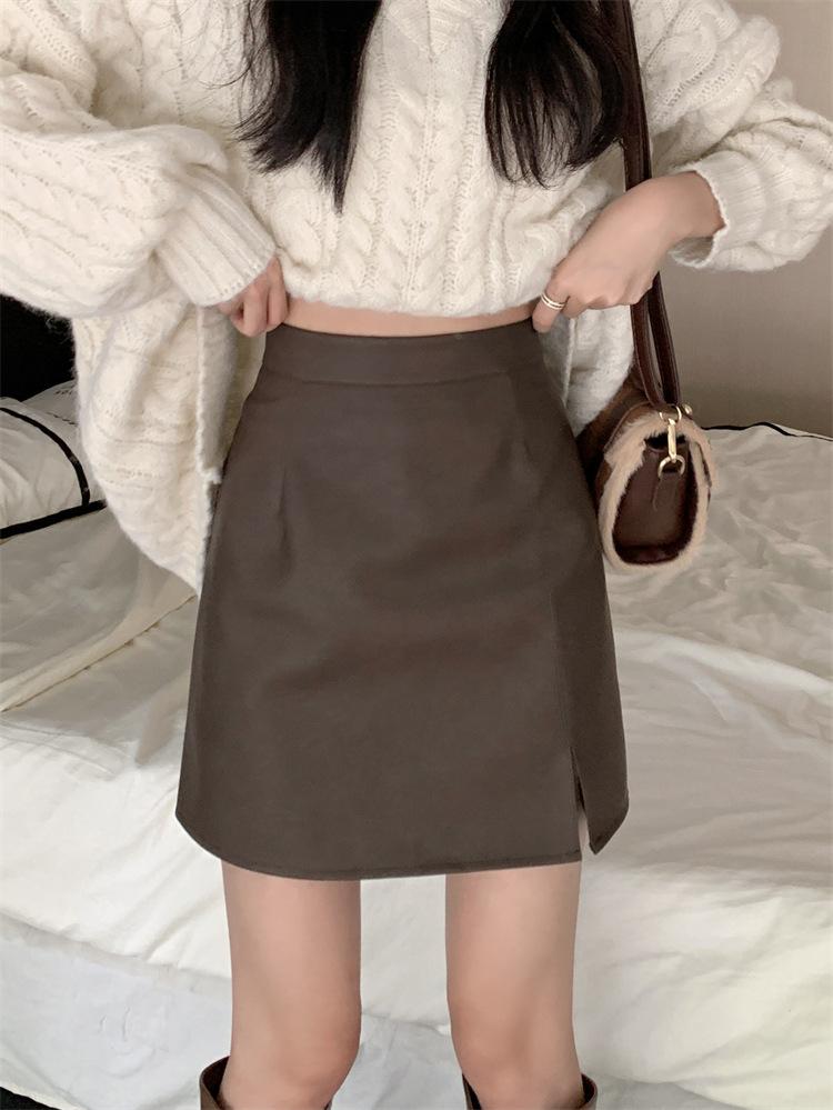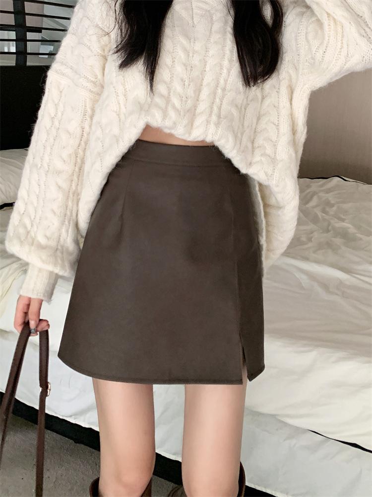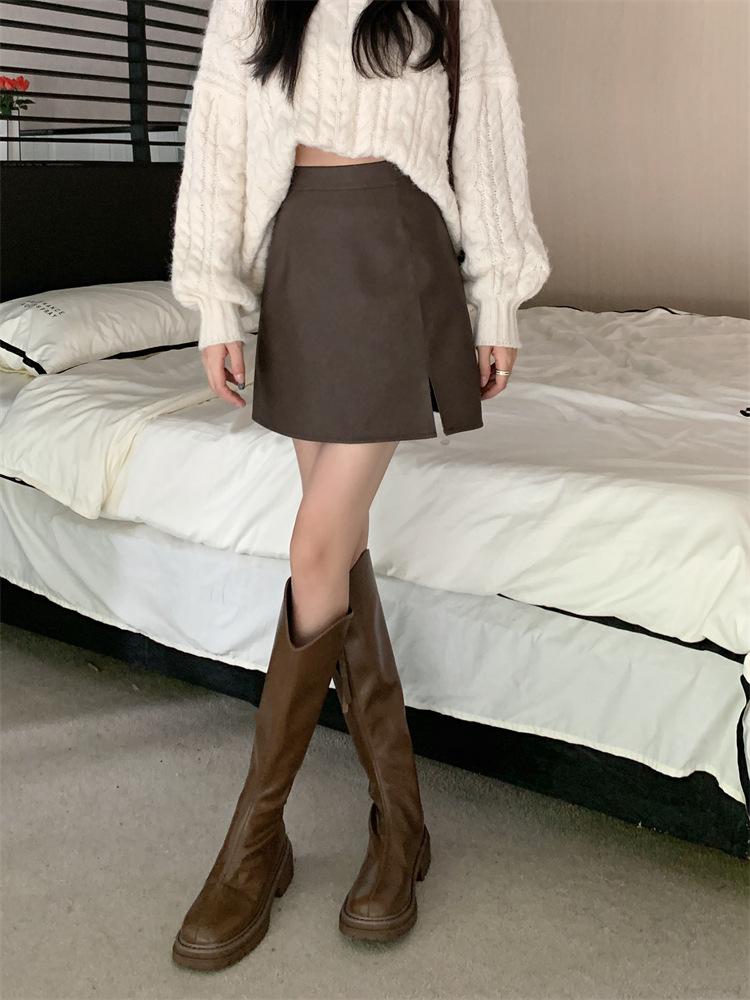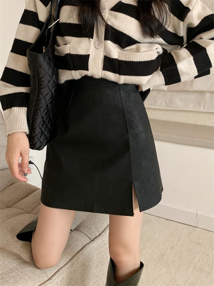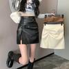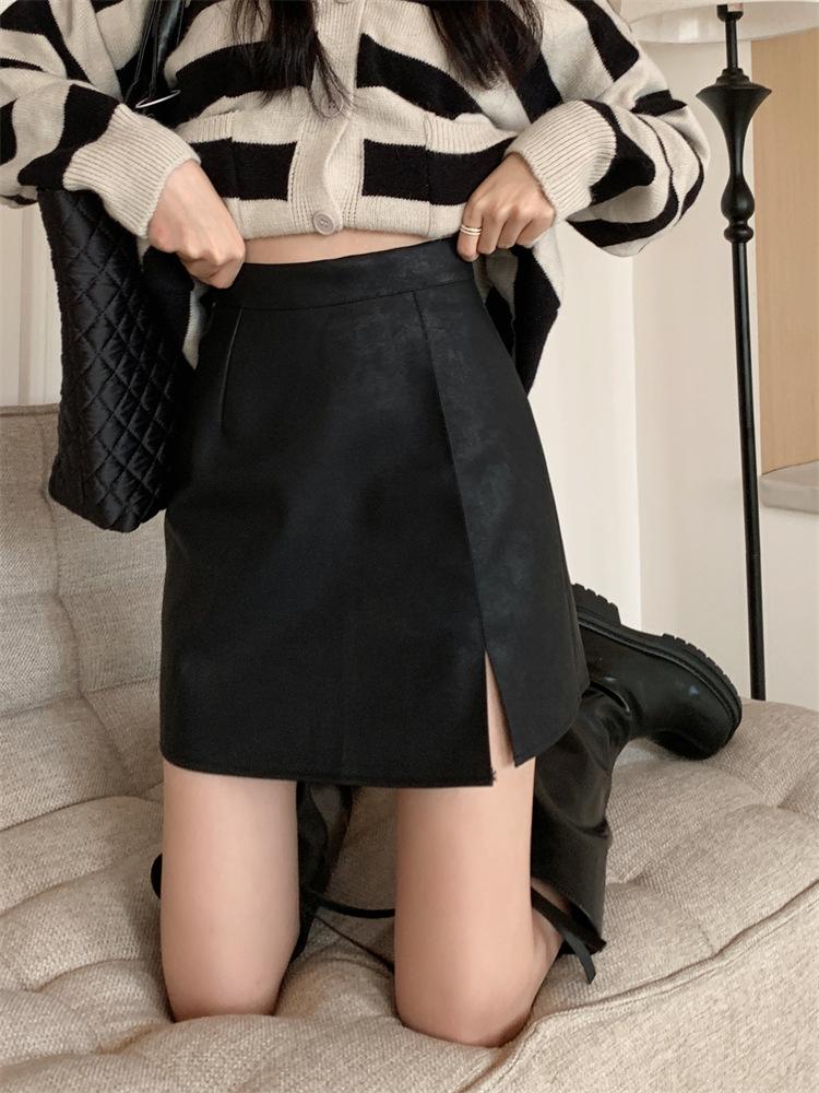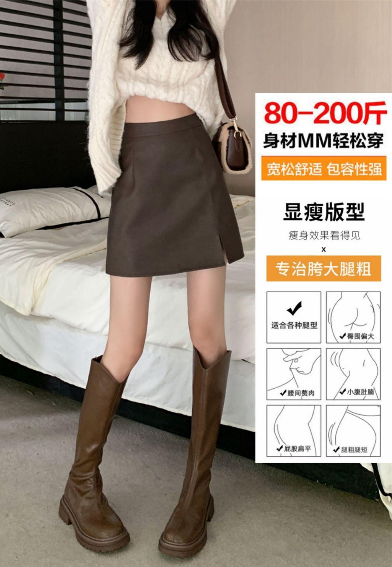 Falda de cuero sintético con abertura y cintura alta, corta, antiluz, para otoño, para mujer, talla grande, adelgazante, corte A