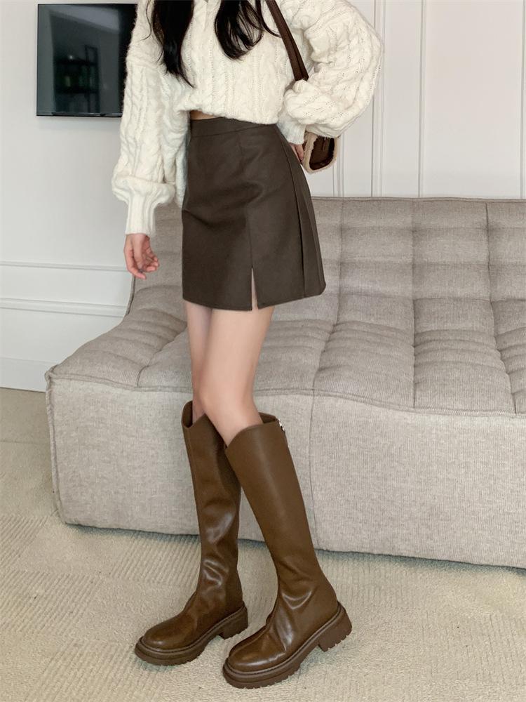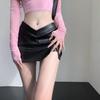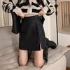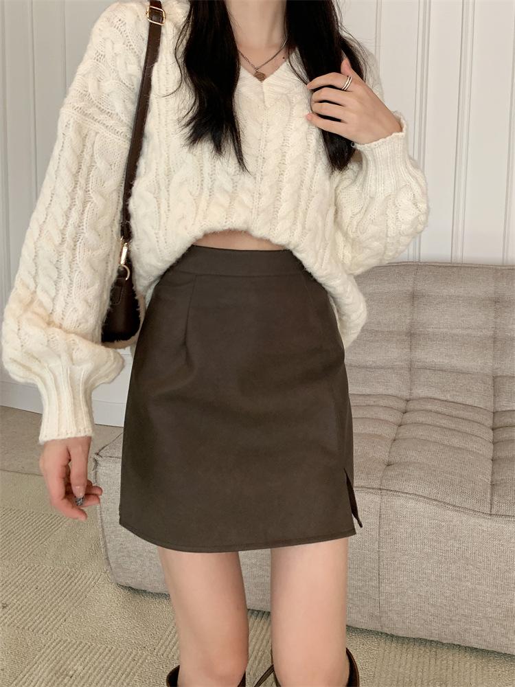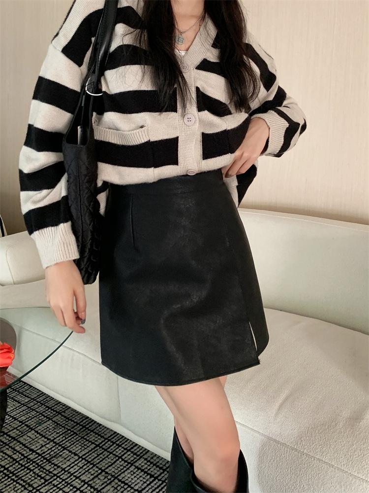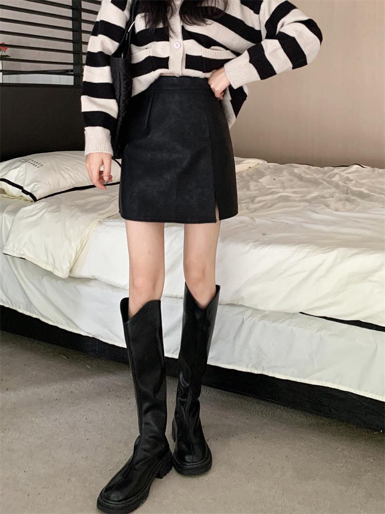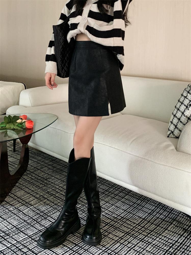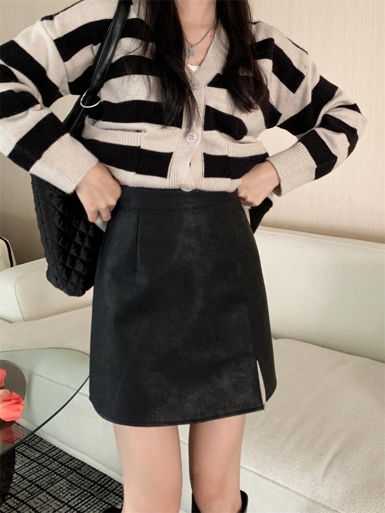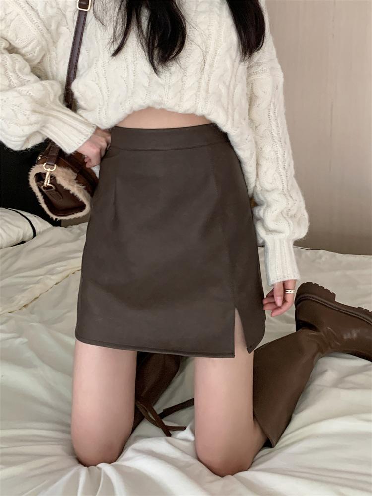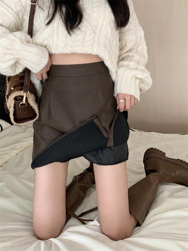 Falda de cuero sintético con abertura y cintura alta, corta, antiluz, para otoño, para mujer, talla grande, adelgazante, corte A